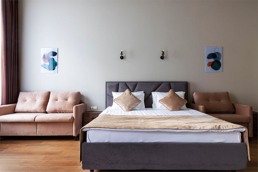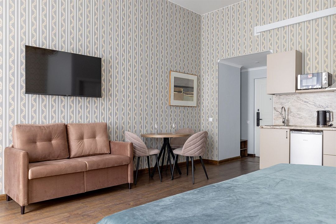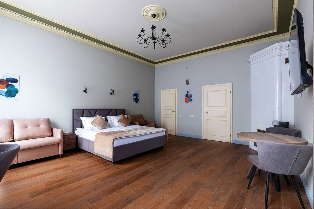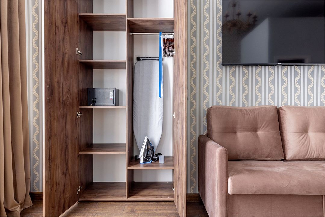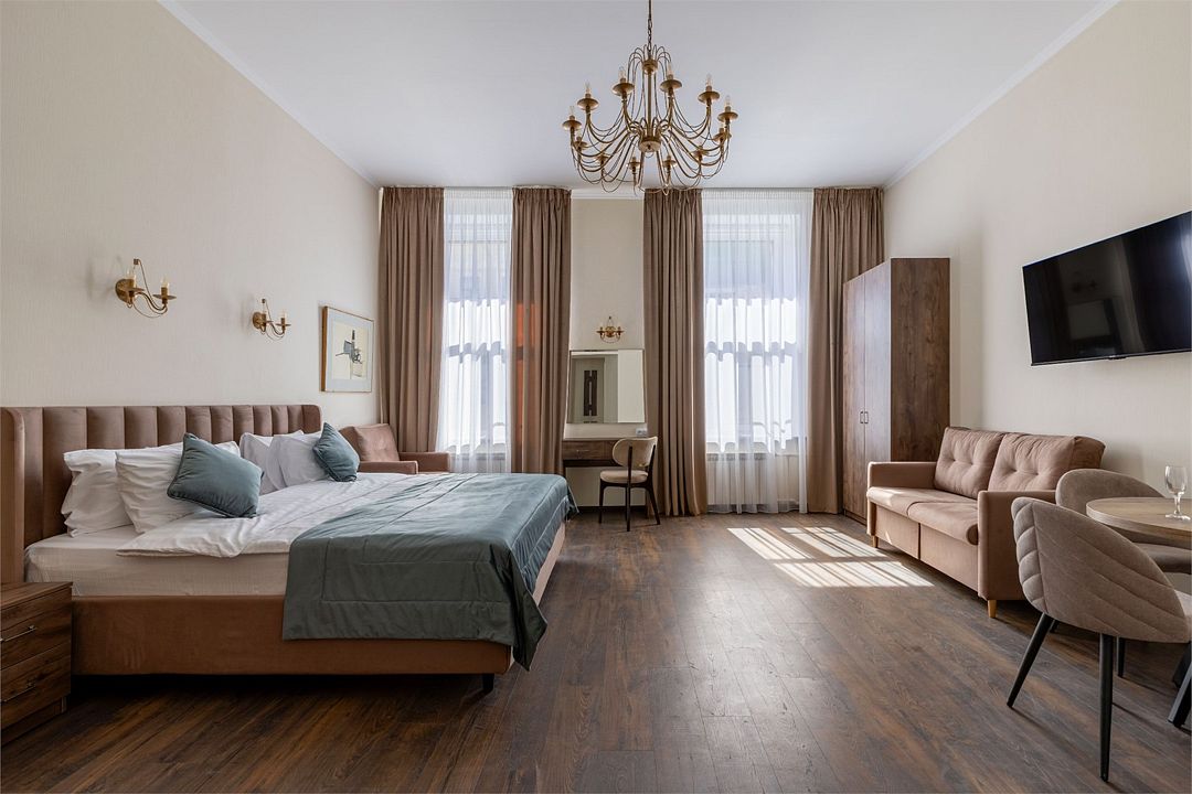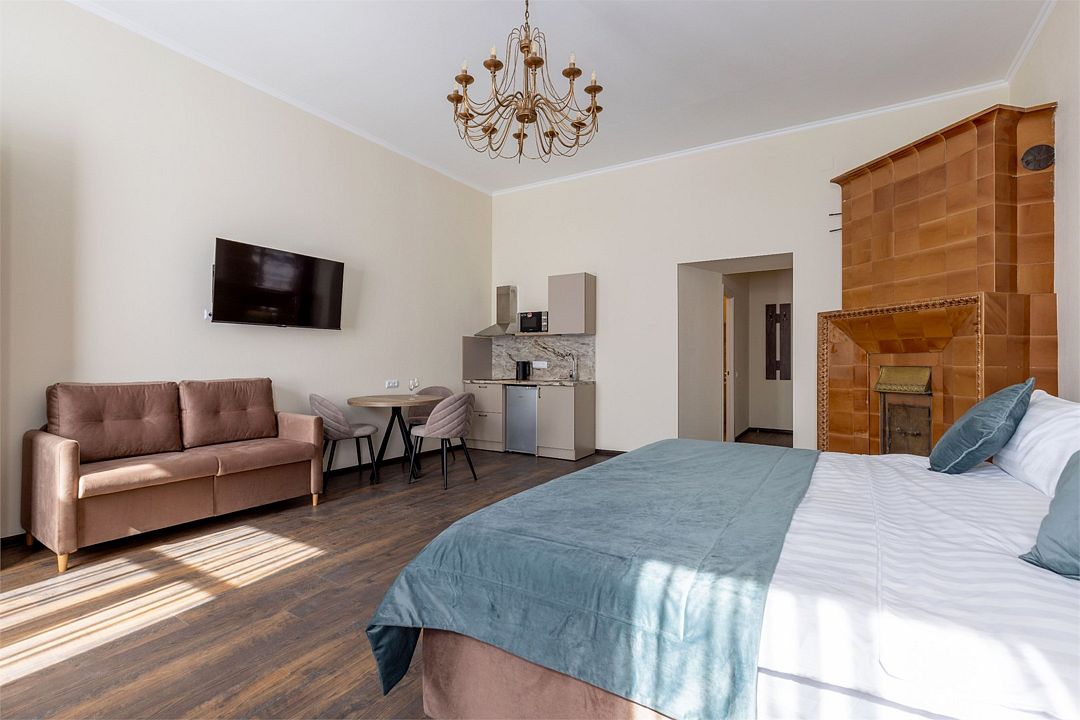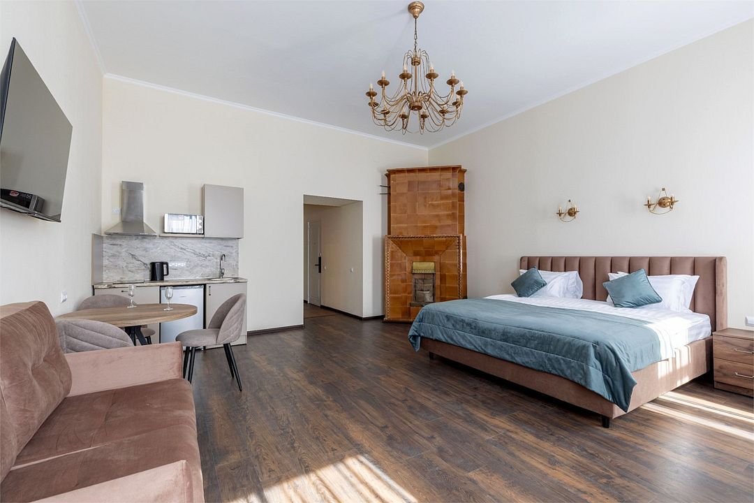 Wi-Fi, интернет, фен, вентилятор, электронные замки, плита для приготовления пищи, микроволновая печь, утюг, банные принадлежности, тапочки, кровать «King size», тумбы, стулья, шкаф для одежды, вешалки, обеденный стол, зеркало, звуконепроницаемые стены и окна, чайный набор, информационная карта, меню, сейф, чайник, раковина, отопление, отдельный вход в номер, душ, вид на город, ламинат, высокие потолки, кухонная посуда, стаканы, столовые приборы, туалетные средства, туалет, диван-кровать, раскладной диван, раскладное кресло, телевизор с плоским экраном, мини-холодильник, мини-кухня, телевизор со Smart TV, номер для некурящих, рабочий стол, кресло-кровать, фумигатор, можно с питомцамиВ гостиничном номере