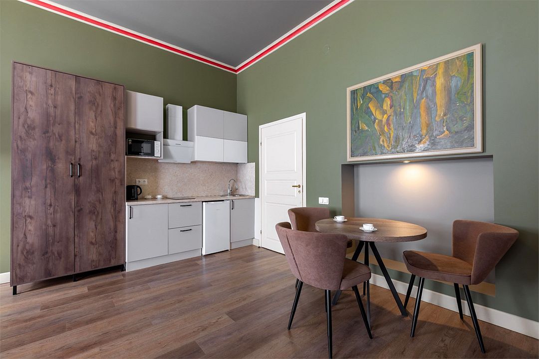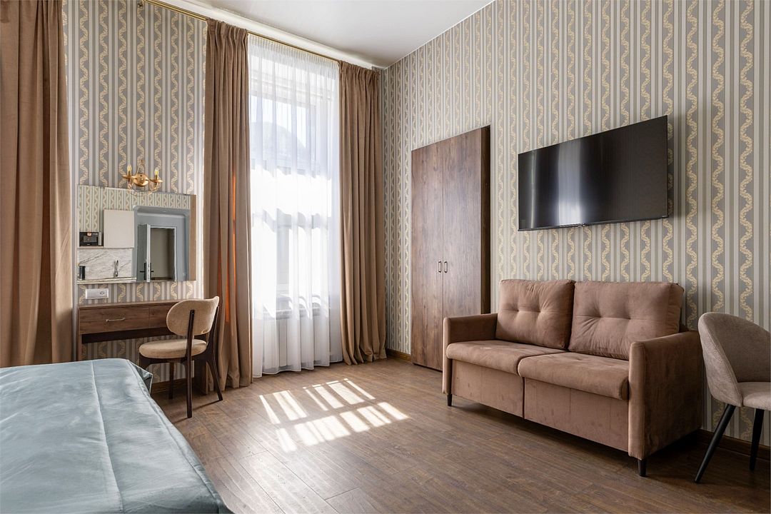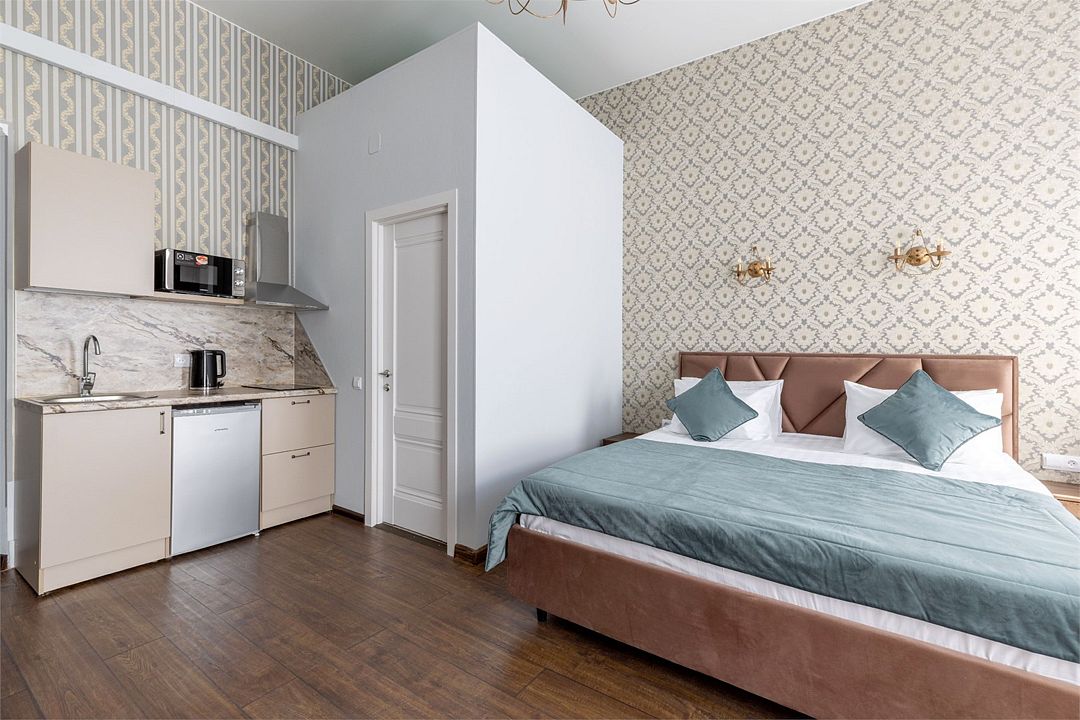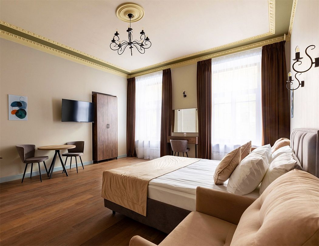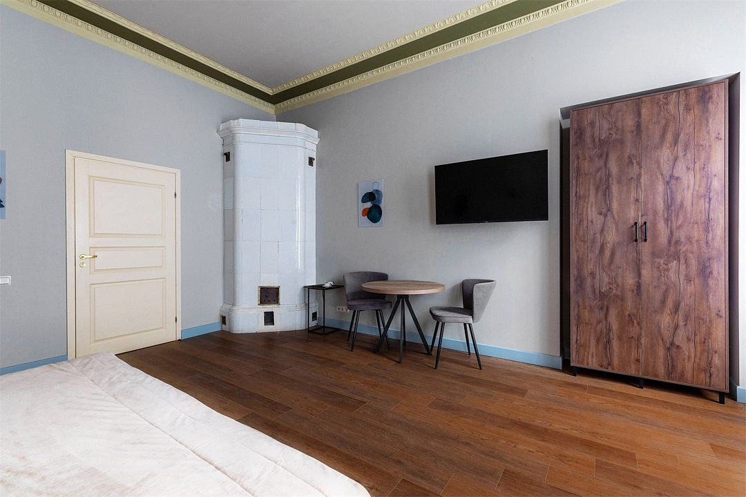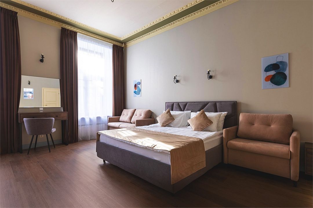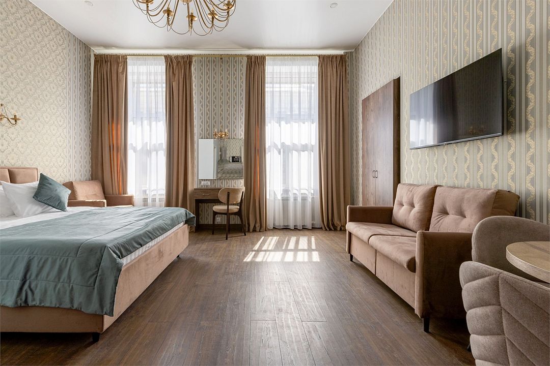 Wi-Fi, интернет, фен, вентилятор, электронные замки, плита для приготовления пищи, микроволновая печь, утюг, банные принадлежности, тапочки, кровать «King size», тумбы, стулья, шкаф для одежды, вешалки, обеденный стол, зеркало, звуконепроницаемые стены и окна, чайный набор, информационная карта, меню, сейф, чайник, раковина, отопление, отдельный вход в номер, душ, вид на город, ламинат, высокие потолки, кухонная посуда, стаканы, столовые приборы, туалетные средства, туалет, диван-кровать, раскладной диван, раскладное кресло, телевизор с плоским экраном, мини-холодильник, мини-кухня, телевизор со Smart TV, номер для некурящих, рабочий стол, кресло-кровать, фумигатор, можно с питомцамиВ гостиничном номере