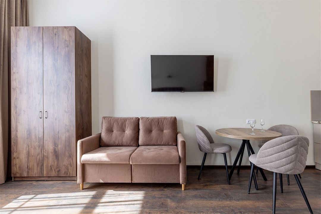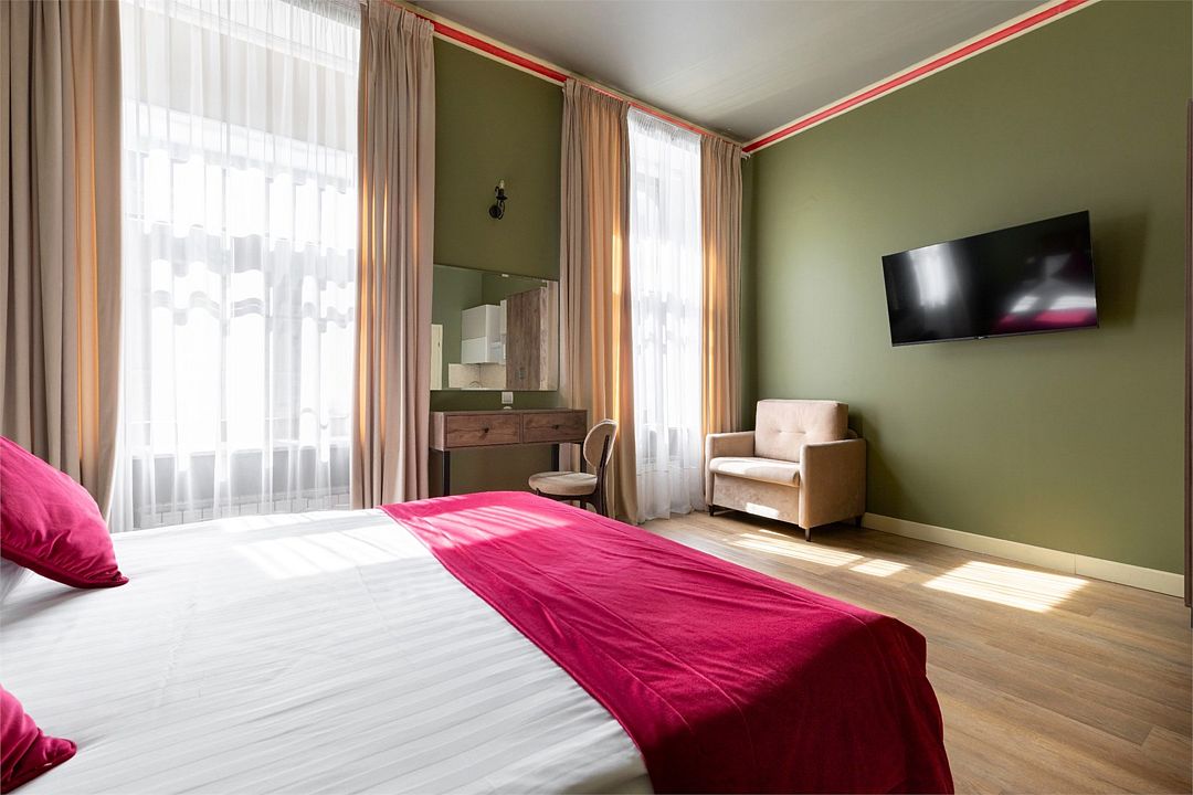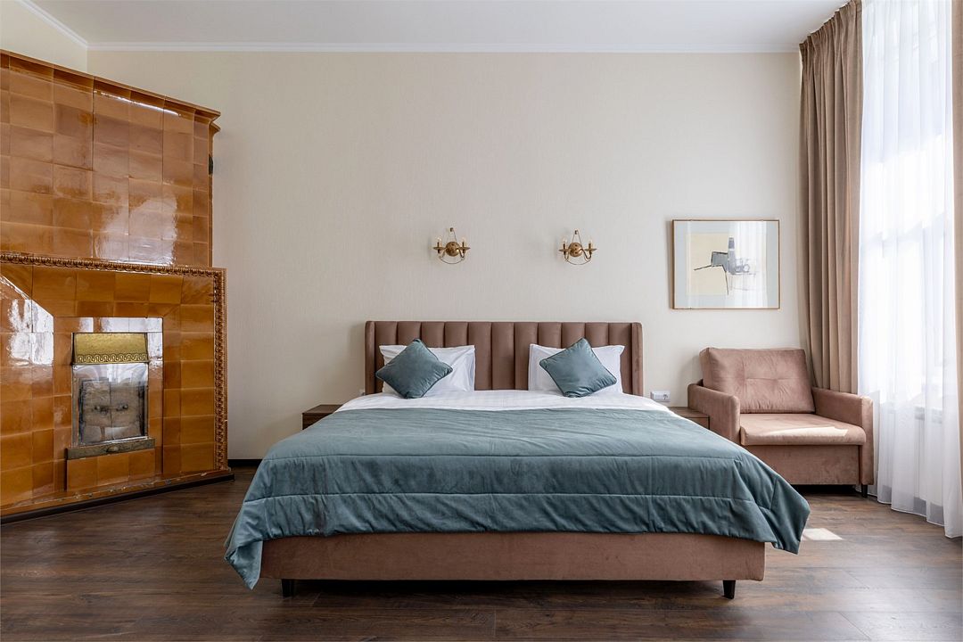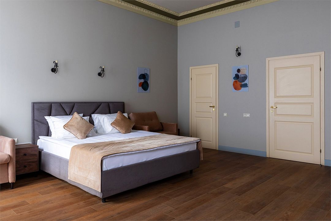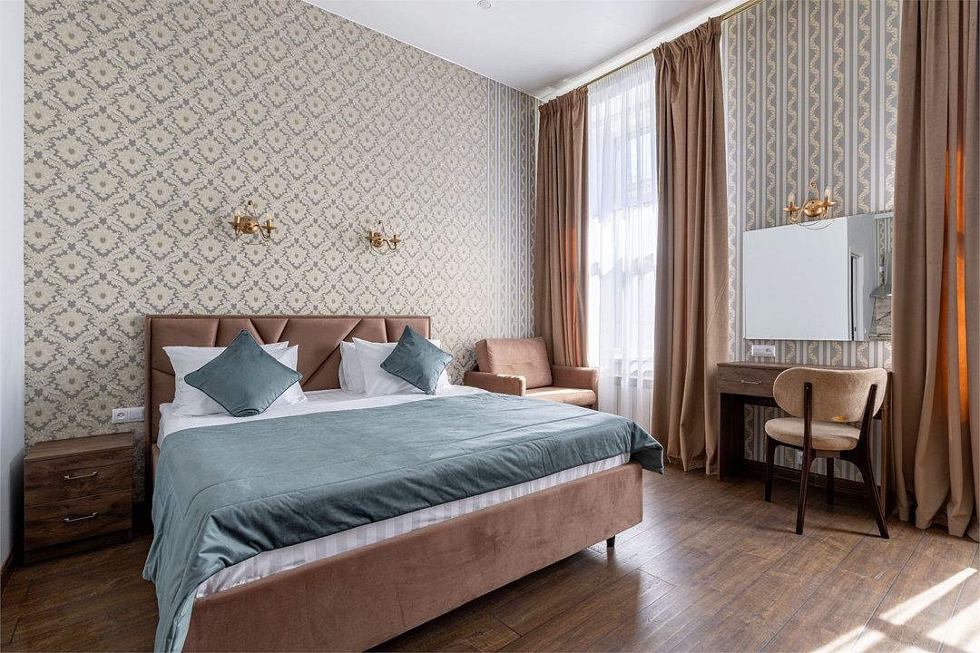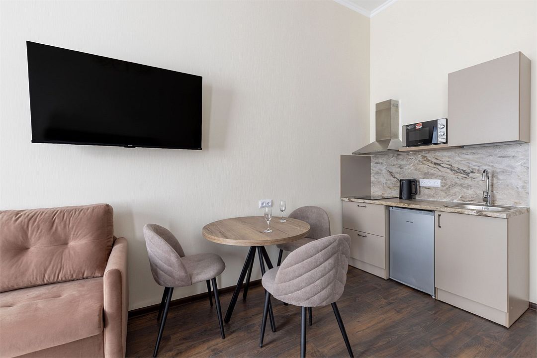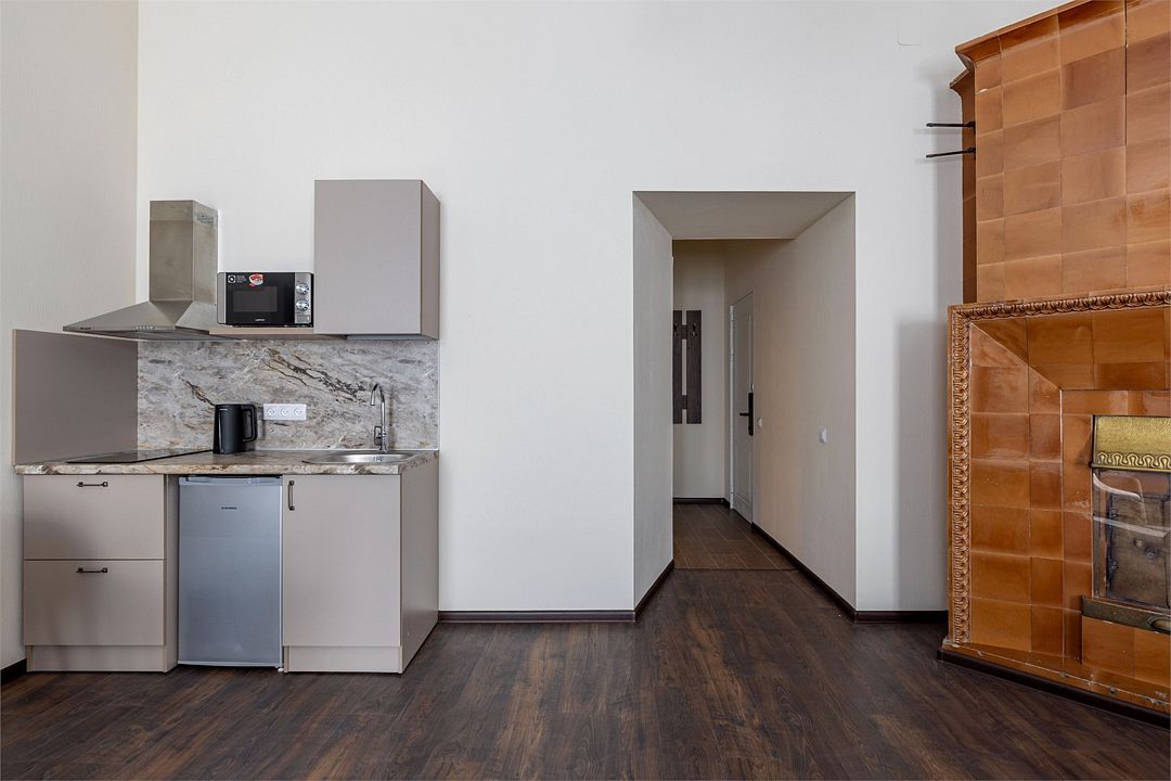 Wi-Fi, интернет, фен, вентилятор, электронные замки, плита для приготовления пищи, микроволновая печь, утюг, банные принадлежности, тапочки, кровать «King size», тумбы, стулья, шкаф для одежды, вешалки, обеденный стол, зеркало, звуконепроницаемые стены и окна, чайный набор, информационная карта, меню, сейф, чайник, раковина, отопление, отдельный вход в номер, душ, вид на город, ламинат, высокие потолки, кухонная посуда, стаканы, столовые приборы, туалетные средства, туалет, диван-кровать, раскладной диван, раскладное кресло, телевизор с плоским экраном, мини-холодильник, мини-кухня, телевизор со Smart TV, номер для некурящих, рабочий стол, кресло-кровать, фумигатор, можно с питомцамиВ гостиничном номере