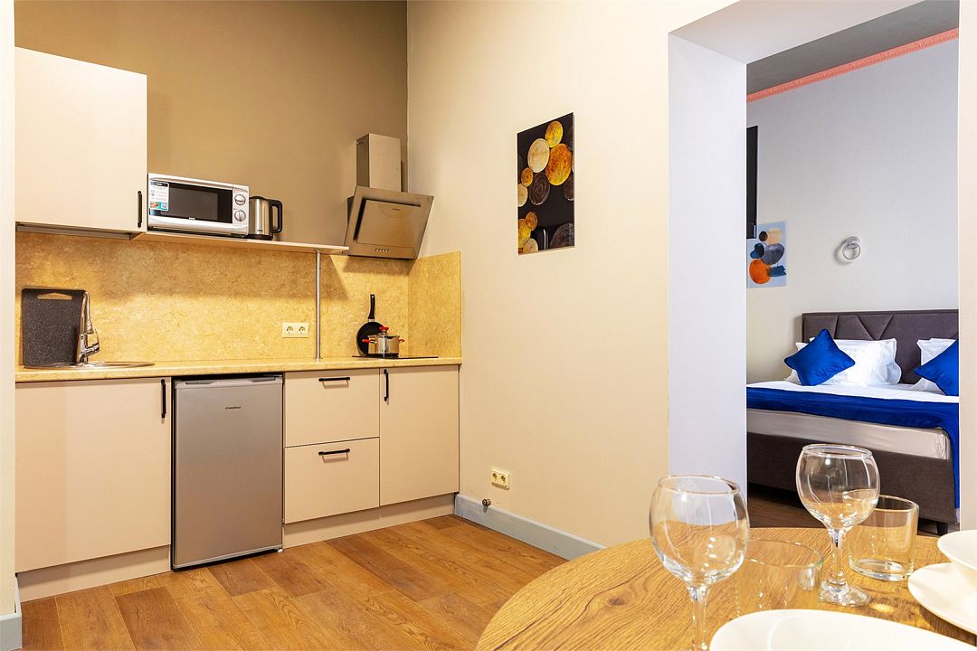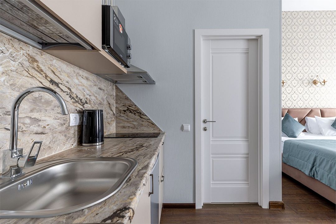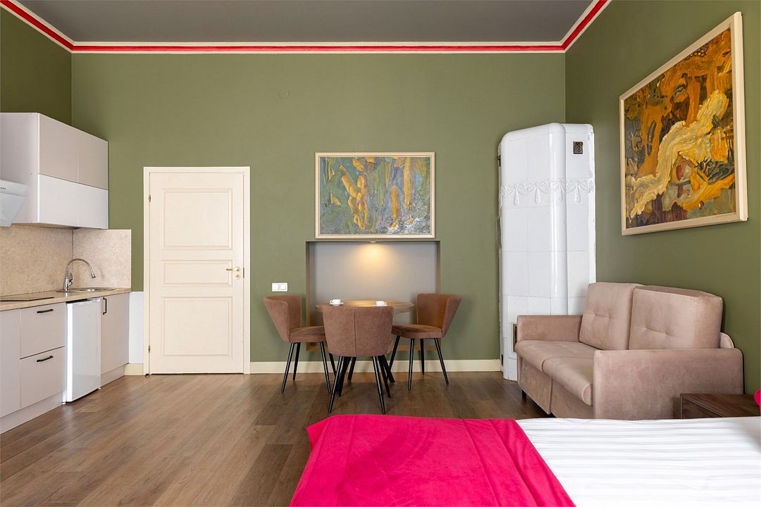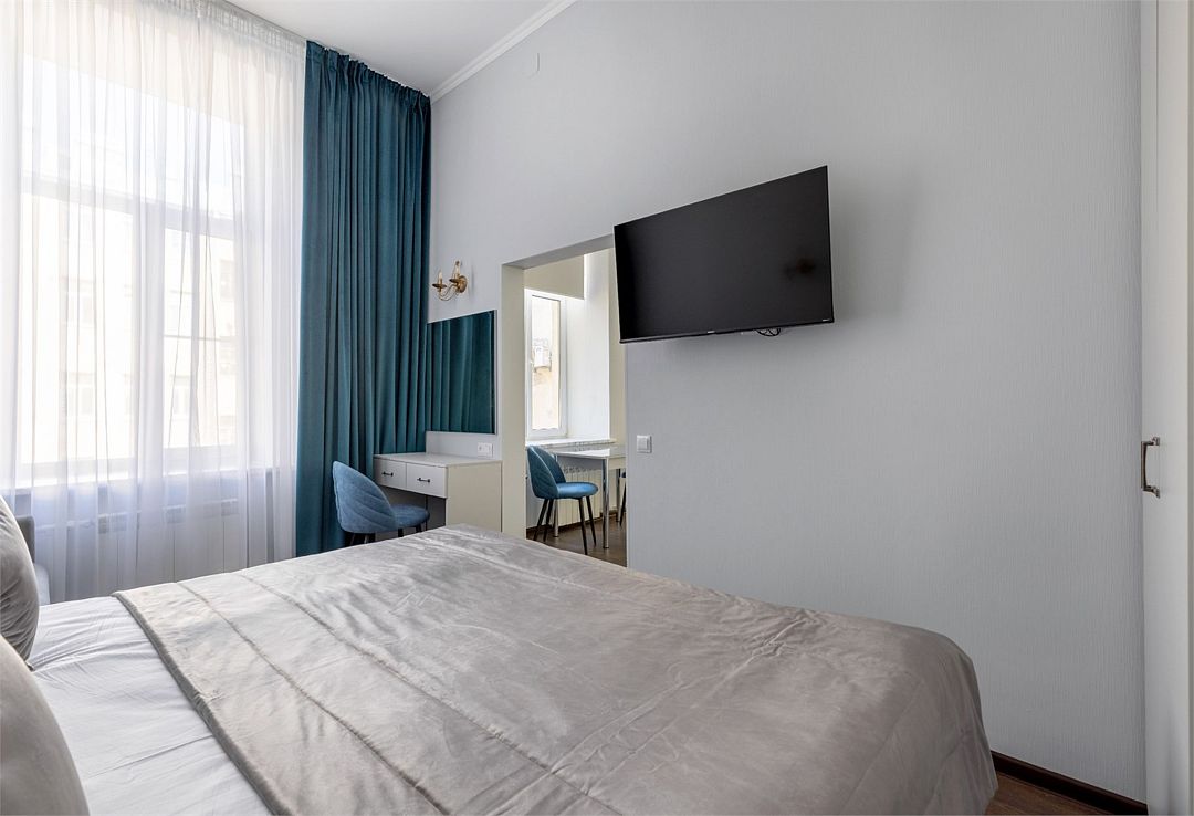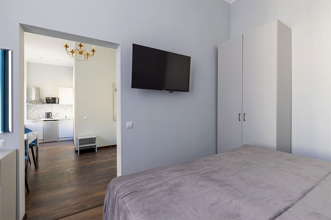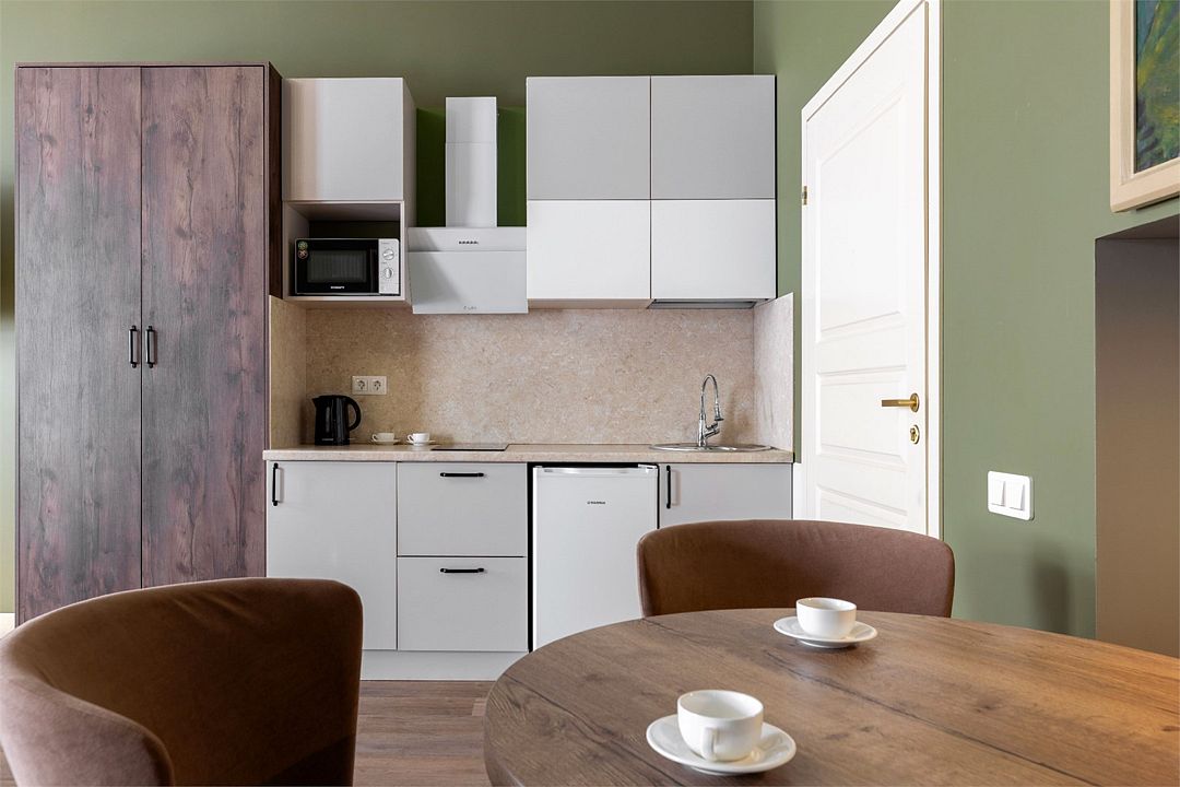 Wi-Fi, интернет, фен, вентилятор, электронные замки, плита для приготовления пищи, микроволновая печь, утюг, банные принадлежности, тапочки, кровать «King size», тумбы, стулья, шкаф для одежды, вешалки, обеденный стол, зеркало, звуконепроницаемые стены и окна, чайный набор, информационная карта, меню, сейф, чайник, раковина, отопление, отдельный вход в номер, душ, вид на город, ламинат, высокие потолки, кухонная посуда, стаканы, столовые приборы, туалетные средства, туалет, диван-кровать, раскладной диван, раскладное кресло, телевизор с плоским экраном, мини-холодильник, мини-кухня, телевизор со Smart TV, номер для некурящих, рабочий стол, кресло-кровать, фумигатор, можно с питомцамиВ гостиничном номере