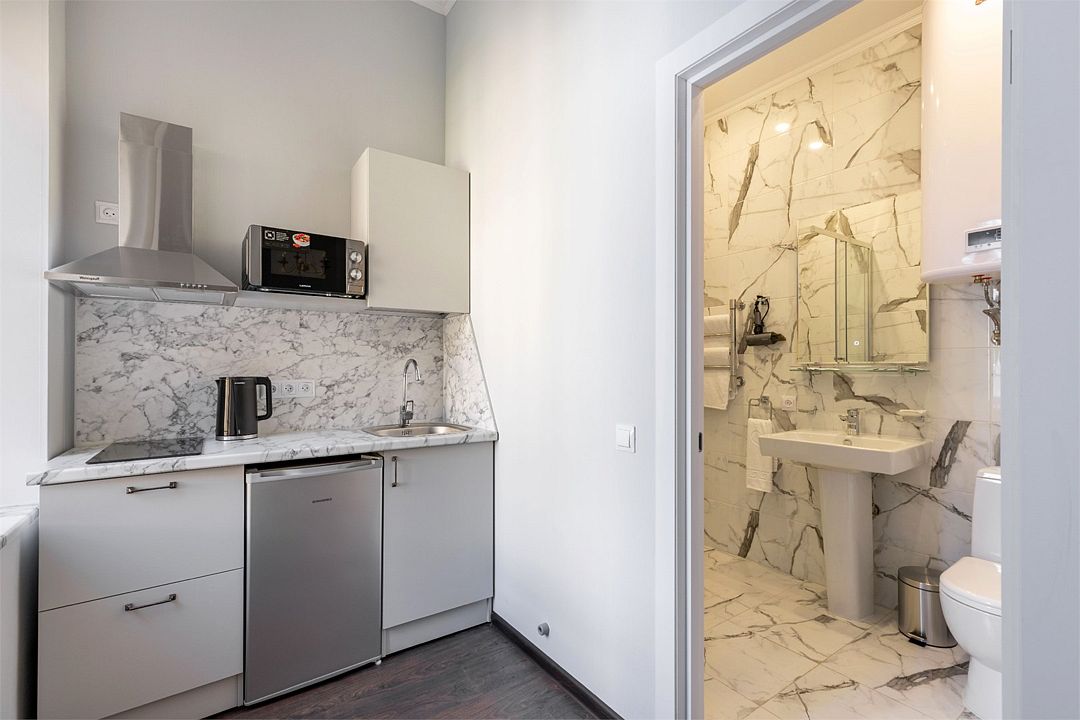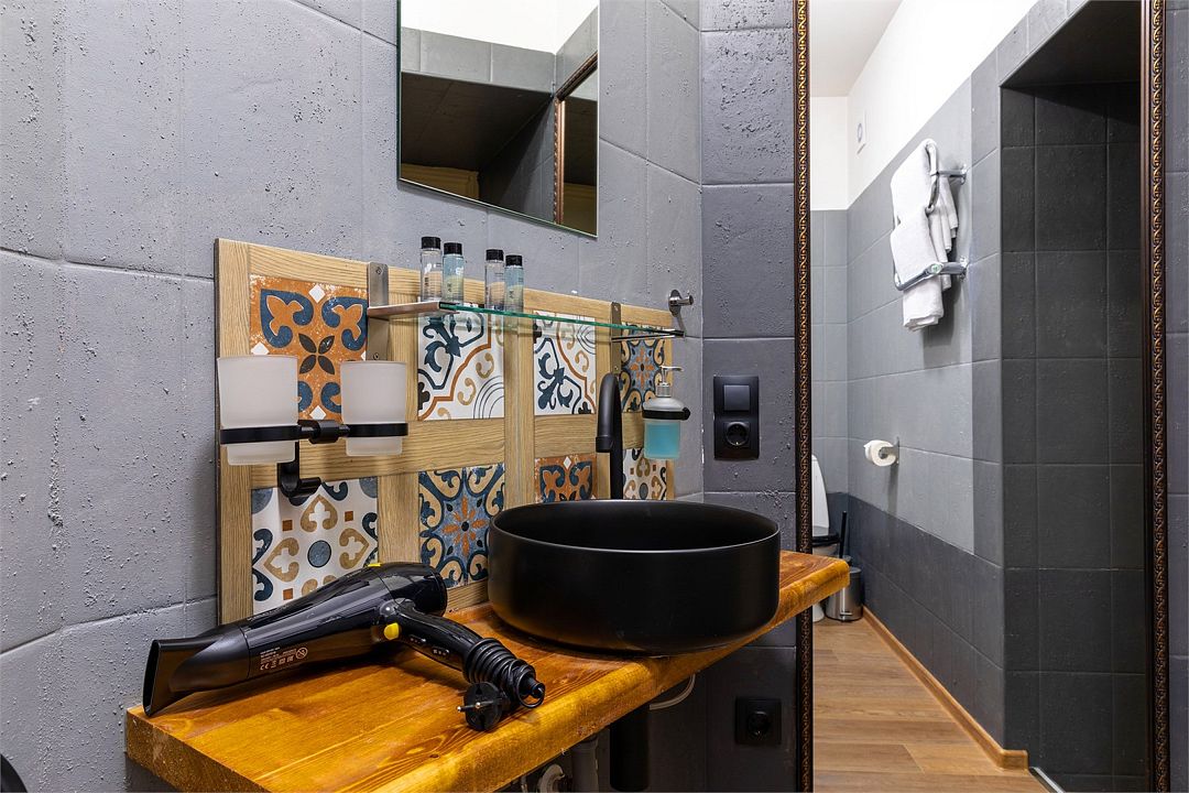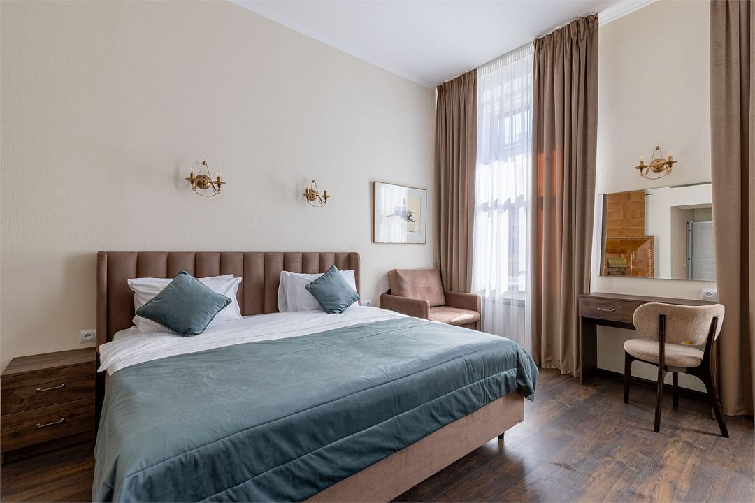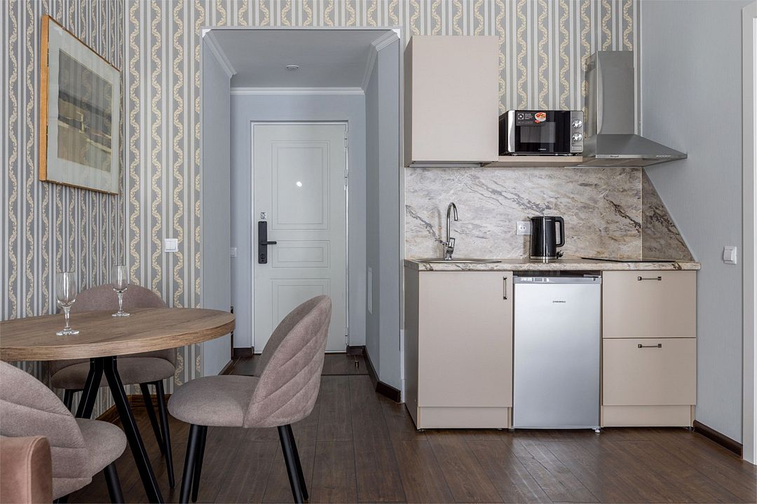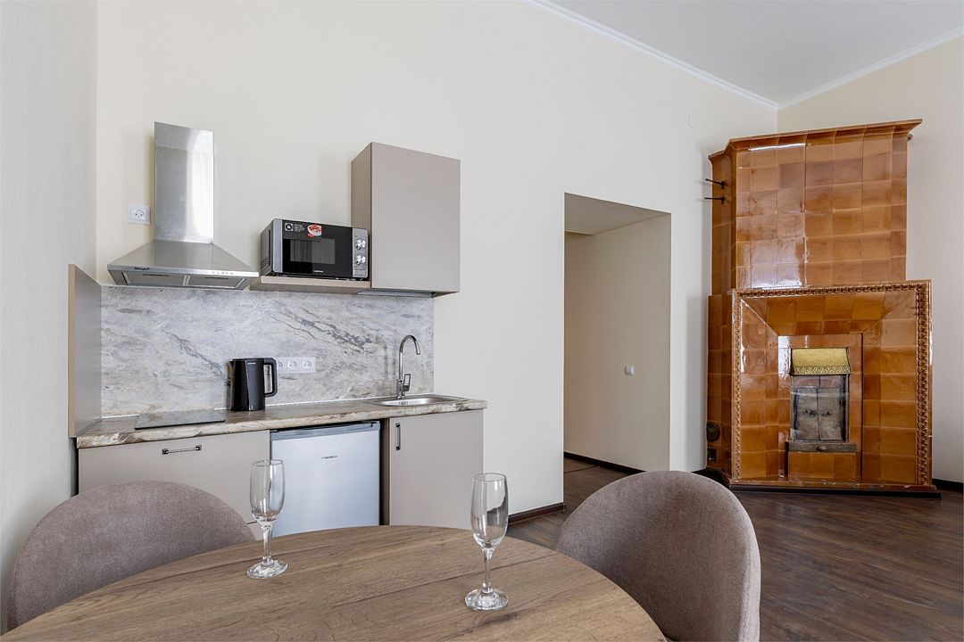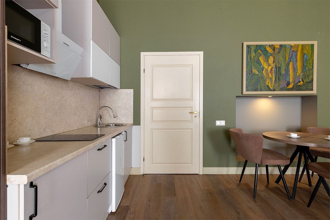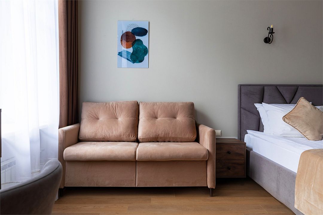 Wi-Fi, интернет, фен, вентилятор, электронные замки, плита для приготовления пищи, микроволновая печь, утюг, банные принадлежности, тапочки, кровать «King size», тумбы, стулья, шкаф для одежды, вешалки, обеденный стол, зеркало, звуконепроницаемые стены и окна, чайный набор, информационная карта, меню, сейф, чайник, раковина, отопление, отдельный вход в номер, душ, вид на город, ламинат, высокие потолки, кухонная посуда, стаканы, столовые приборы, туалетные средства, туалет, диван-кровать, раскладной диван, раскладное кресло, телевизор с плоским экраном, мини-холодильник, мини-кухня, телевизор со Smart TV, номер для некурящих, рабочий стол, кресло-кровать, фумигатор, можно с питомцамиВ гостиничном номере