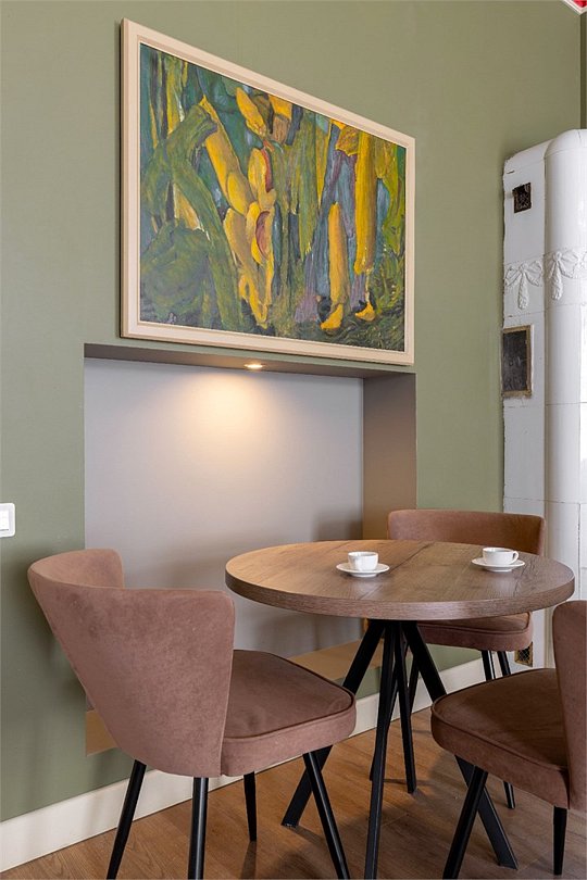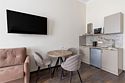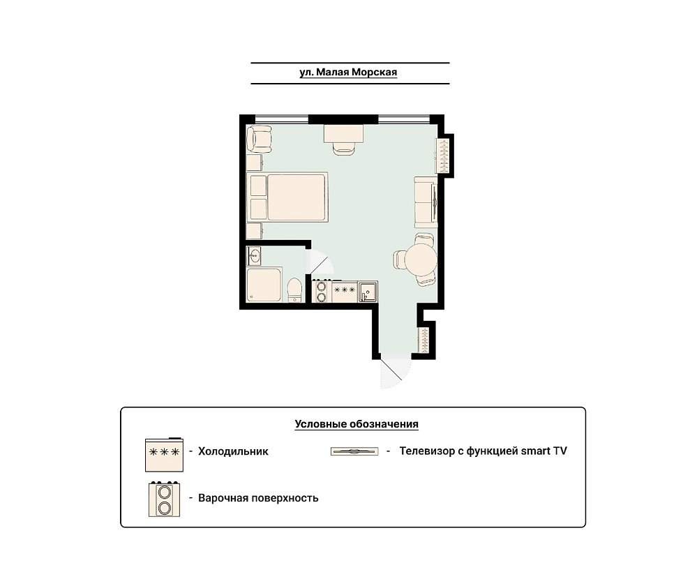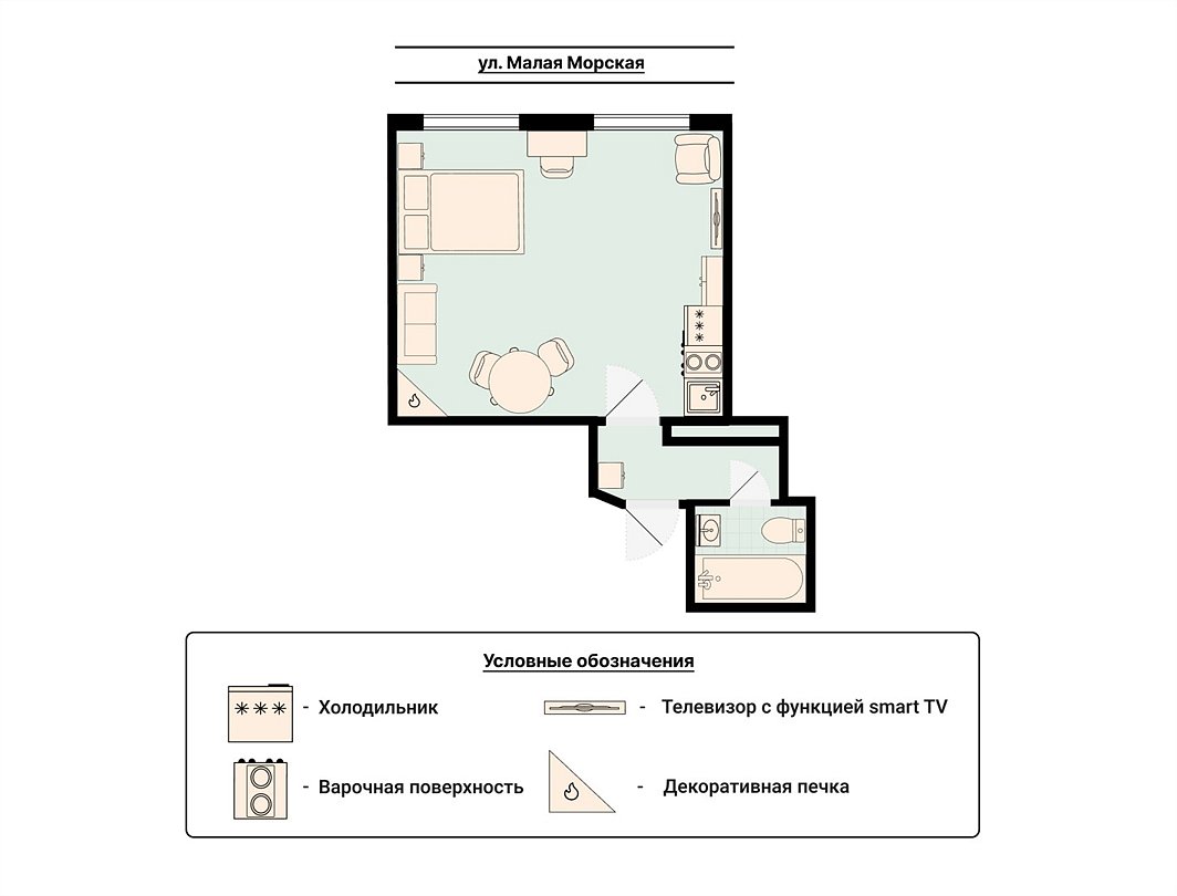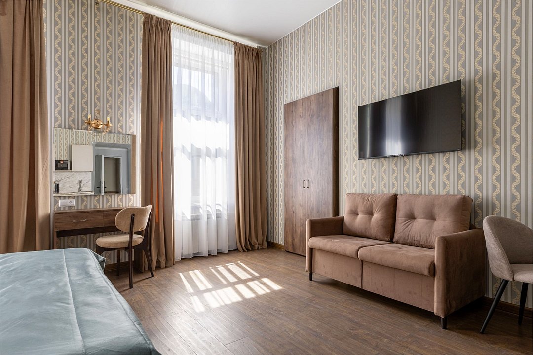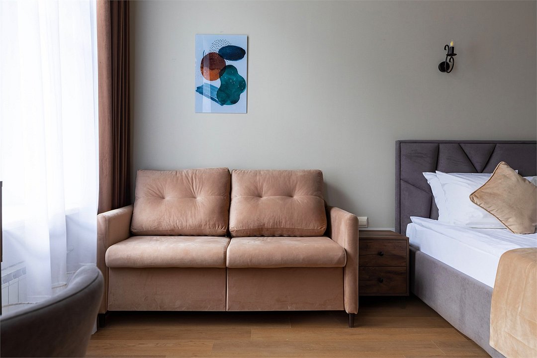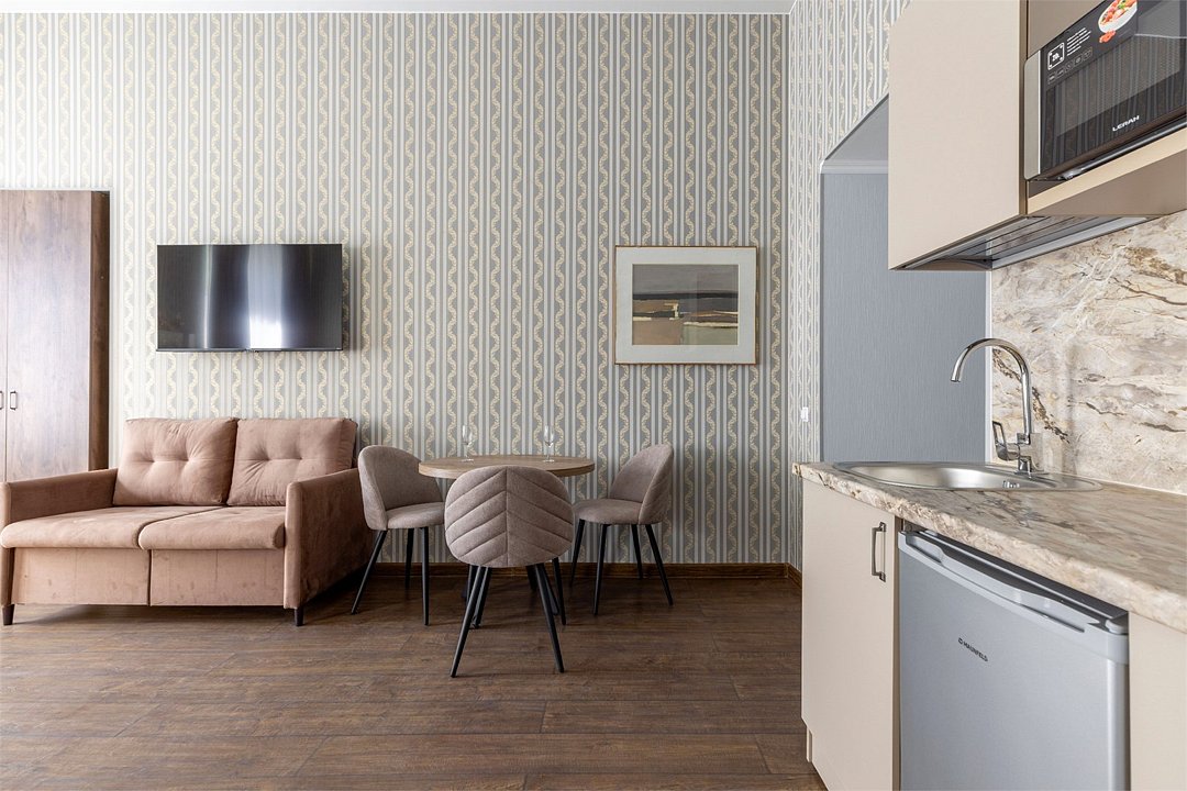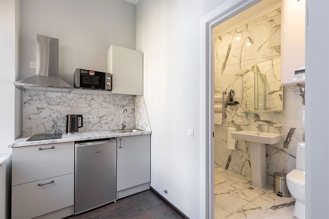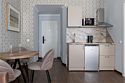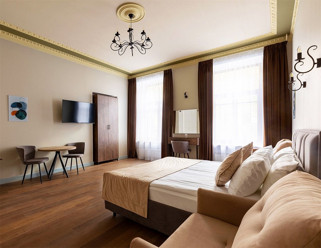 Wi-Fi, интернет, фен, вентилятор, электронные замки, плита для приготовления пищи, микроволновая печь, утюг, банные принадлежности, тапочки, кровать «King size», тумбы, стулья, шкаф для одежды, вешалки, обеденный стол, зеркало, звуконепроницаемые стены и окна, чайный набор, информационная карта, меню, сейф, чайник, раковина, отопление, отдельный вход в номер, душ, вид на город, ламинат, высокие потолки, кухонная посуда, стаканы, столовые приборы, туалетные средства, туалет, диван-кровать, раскладной диван, раскладное кресло, телевизор с плоским экраном, мини-холодильник, мини-кухня, телевизор со Smart TV, номер для некурящих, рабочий стол, кресло-кровать, фумигатор, можно с питомцамиВ номере