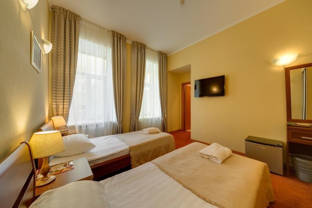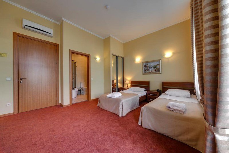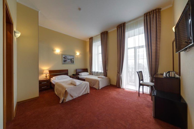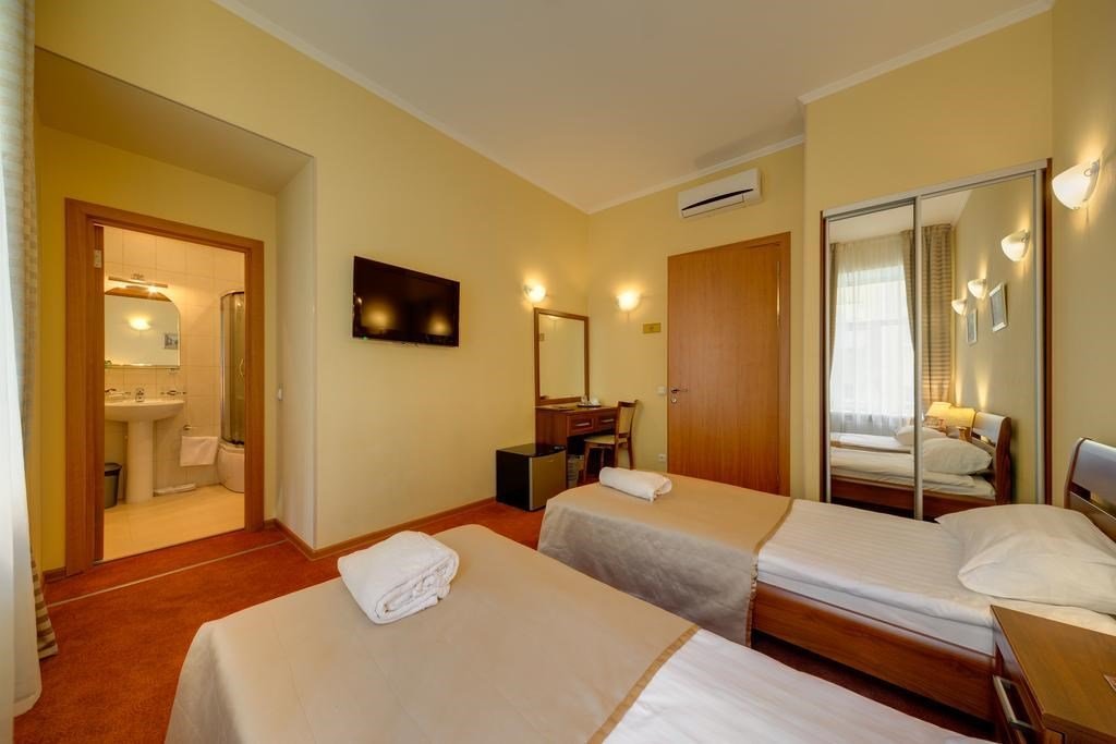 телевизор, кабельное телевидение, Wi-Fi, интернет, телефон, кондиционер, фен, душевая кабина, санузел, банные принадлежности, банные полотенца, тапочки, две односпальные кровати, тумбы, вешалки, зеркало, чайный набор, сейф, чайник, раковина, ковровое покрытие, вид на город, кулер на этаже, вид во двор, стаканы, стул, туалетные средства, туалет, мини-холодильник, шкаф-купе, номер для некурящих, рабочий стол, можно с питомцамиВ номере