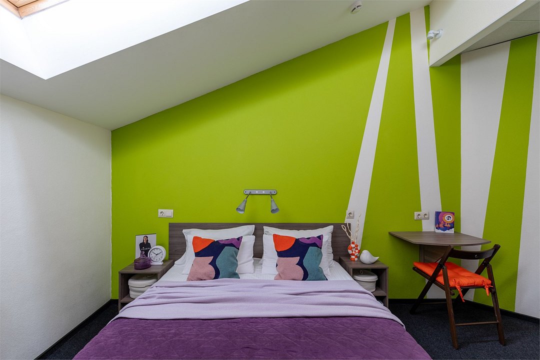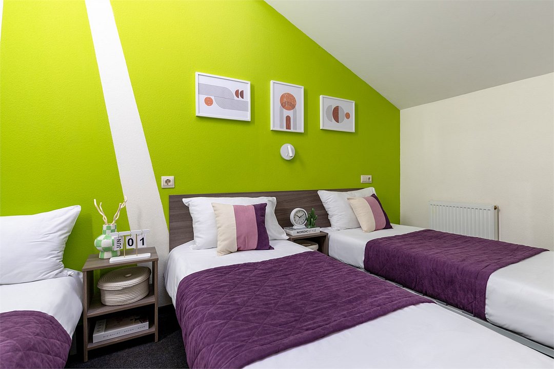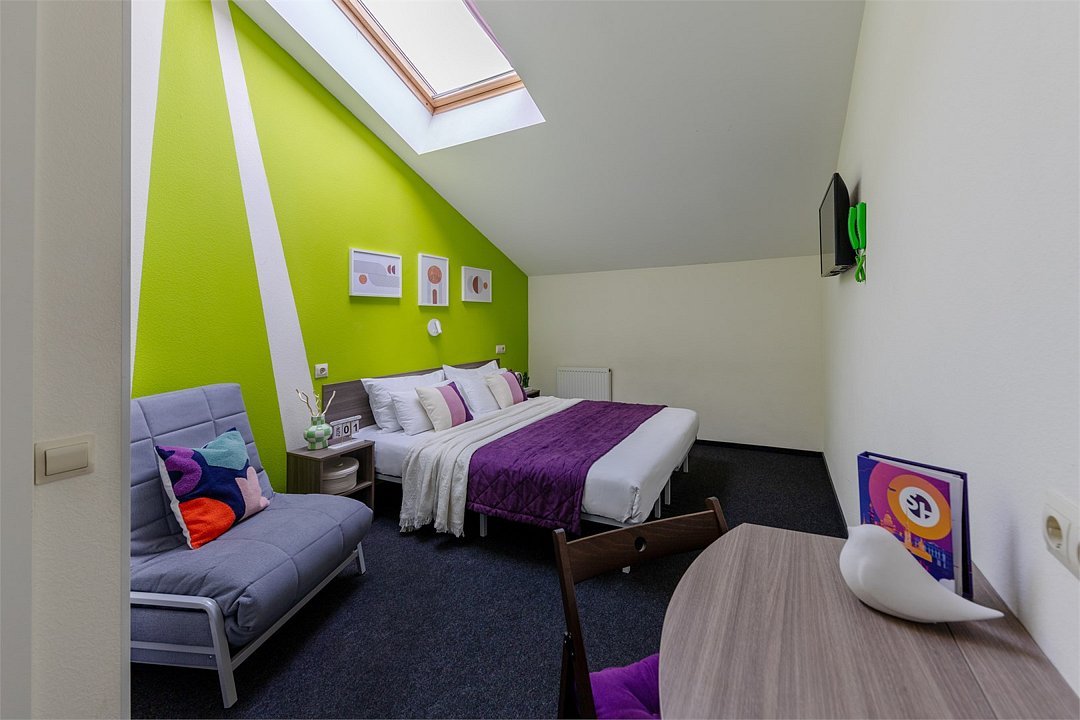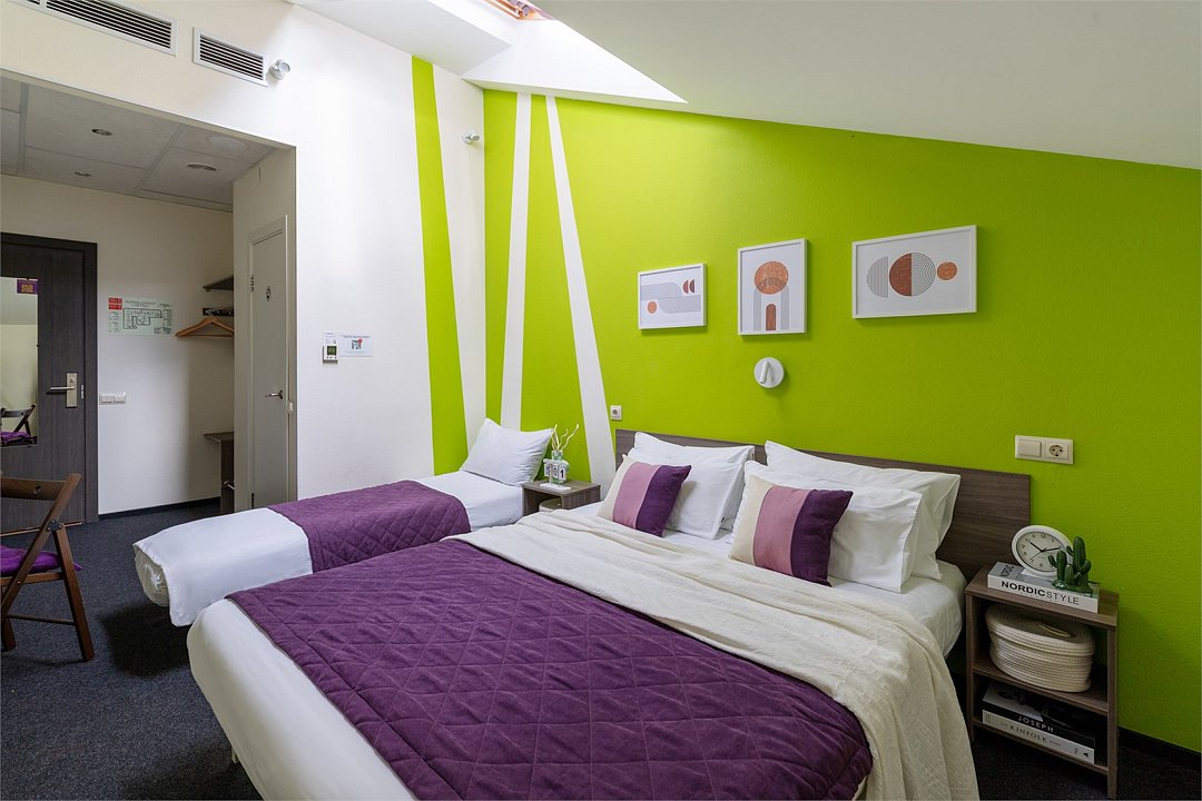 Путешествие с семьейБыло приятноПервое впечатление . Снаружи красивое старинное здание. Небольшой асфальтированный дворик, дети школьники там бегали и запускали змея. Темновато на рецепции, Цветы живые, приятно. Предоставляется интернет и компьютер, чай, кофе в пластиковых стаканах круглосуточно. есть Аппарат платного кофе. Можно купить сувениры, тапочки и т д. Номер на троих взяли мансарду, с 2 скошенными окнами в крыше, их сами открывали. Стена выходила к дороге, машины немного слышно. Спалось хорошо, одеяла теплые, дождь не заливает в окно! Будьте внимательны, В отеле Есть номера Атриум, у них окна большие, но не открываются совсем. Для меня это важно было. ((( Ремонт везде свежий, приятно находиться. Убирались чисто, гель для душа есть. Полотенца меняли, два для ног было на троих, это такая редкость! Нам было комфортно. Завтрак насыщенный, разнообразный. В отеле было 82 ребенка, видели их на рецепции, но не слышали в номере, номер выходил на дорогу, машины слышно, не критично. Соседей не слышали вообще, на этаже были все взрослые. В день рождения положили фигурный глазурированный пряник с открыткой, было приятно. Утюгом не пользовались , на каждом этаже есть. Завтрак твердый сыр, ветчина, творог, Сметана, блины, сосиски , гречка или макароны, сыр рассольный, два напитка, сгущенка, кекс, печенье курабье, апельсин, грейпфрут,