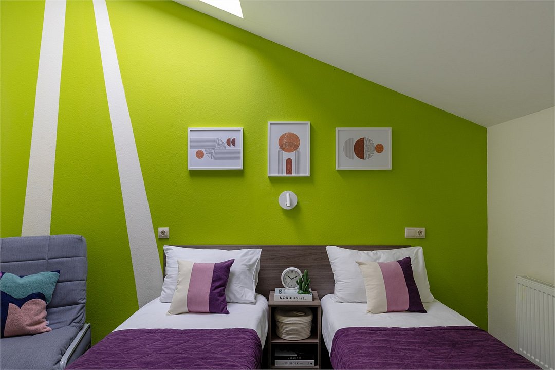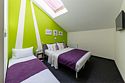 Wi-Fi, кондиционер, светильник, фен, электронные замки, ванная комната, банные полотенца, гигиенические средства, двуспальная кровать, две односпальные кровати, вешалки, багажная тумба, информационная карта, меню, унитаз, раковина, отопление, душ, центральное кондиционирование, три односпальные кровати, стул, стол, туалетные средства, туалет, внутренний телефон, телевизор с плоским экраном, мансардные окна, номер для некурящих, электронный консьерж 24/7, без питомцевВ гостиничном номере
