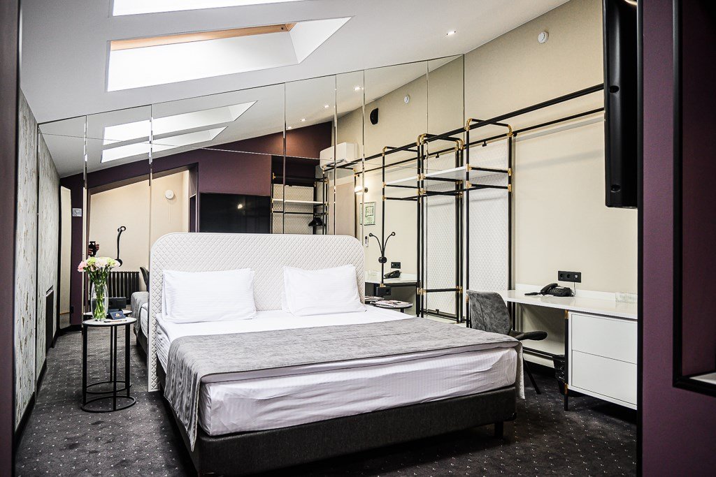 Wi-Fi, IP-телефон, кондиционер, светильник, фен, электронные замки, утюг, банные полотенца, тапочки, гигиенические средства, косметические средства, кровать «King size», гипоаллергенное белье, гладильная доска, ортопедический матрас, тумбы, шкаф для одежды, вешалки, письменный стол, багажная тумба, зеркало, эксклюзивная мебель, мебельный гарнитур, чайный набор, минеральная вода, раковина, ковровое покрытие, отопление, душ, центральное кондиционирование, высокие потолки, стаканы, стул, туалетные средства, туалет, цифровое тв, телевизор с плоским экраном, мини-холодильник, мансардные окна, телевизор со Smart TV, номер для некурящихВ номере