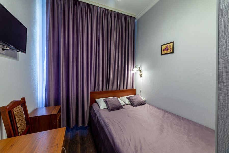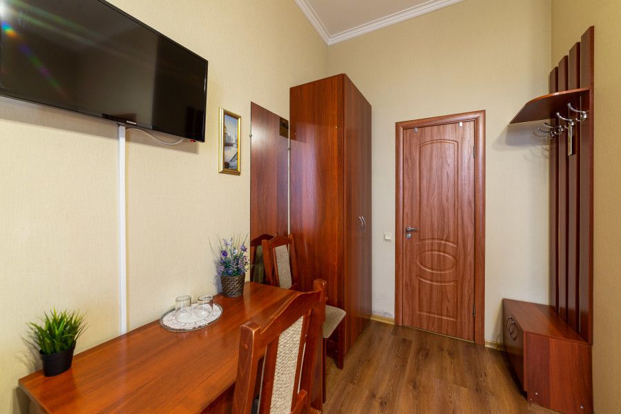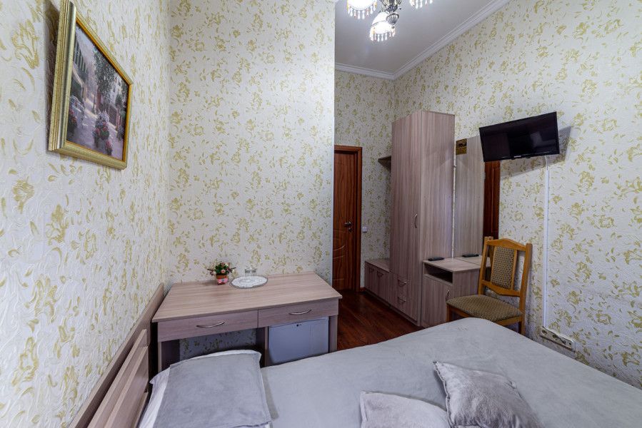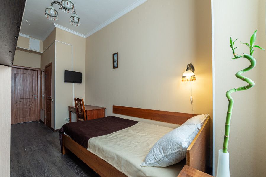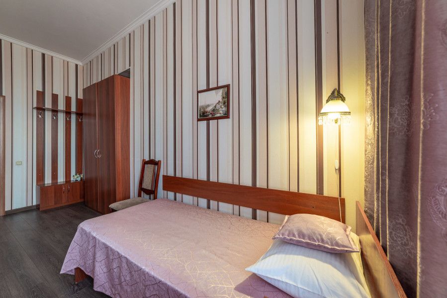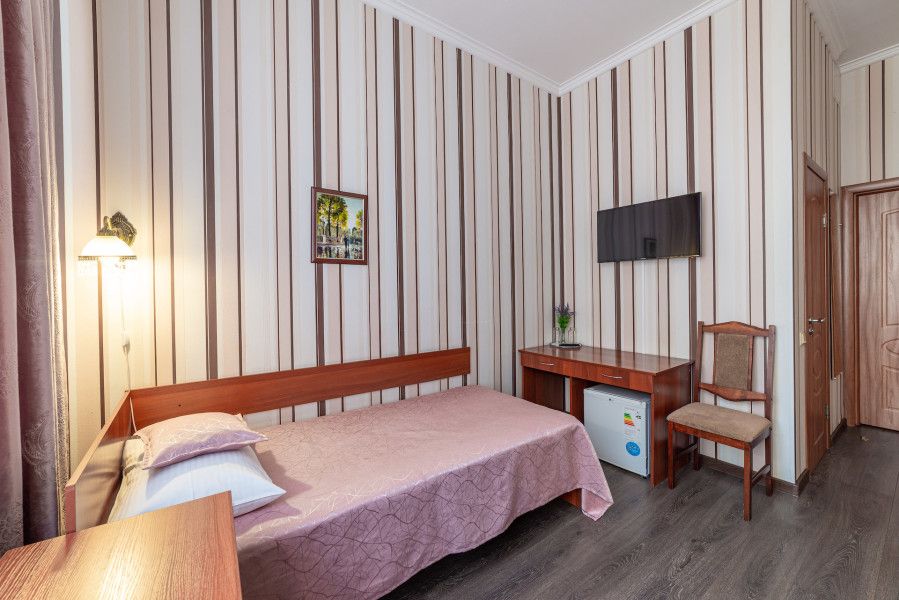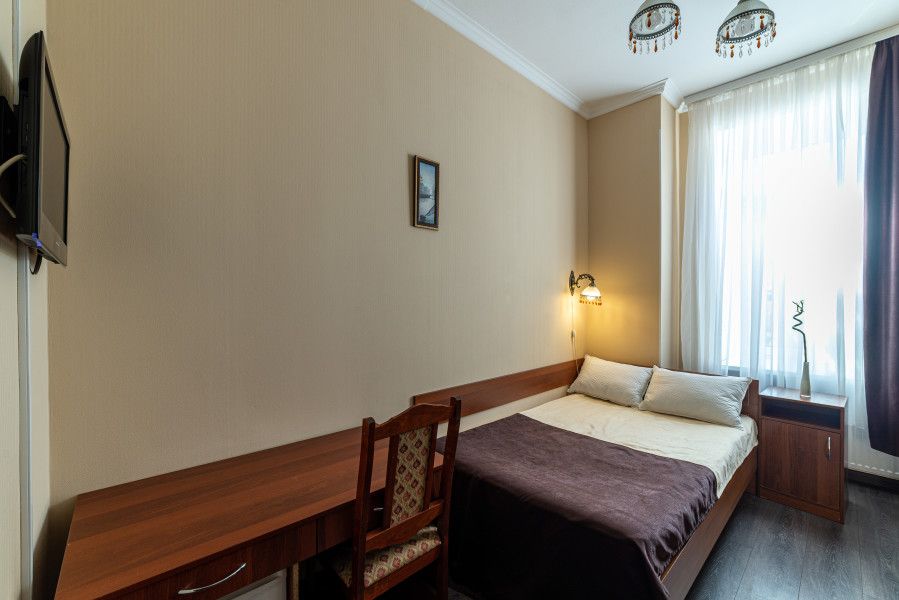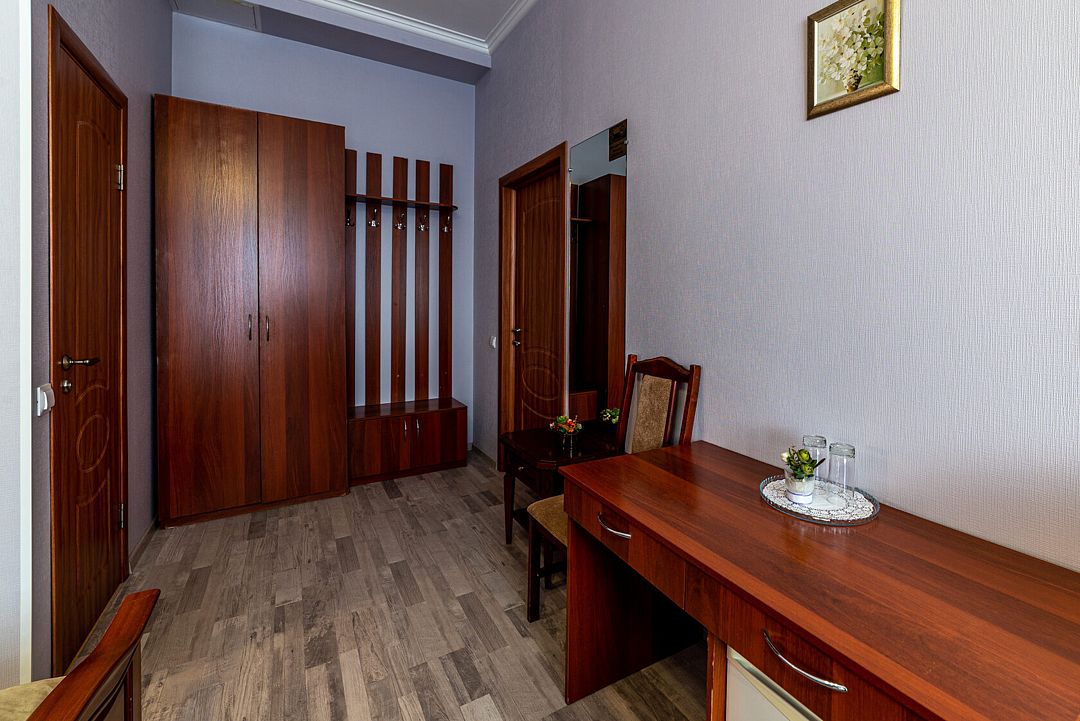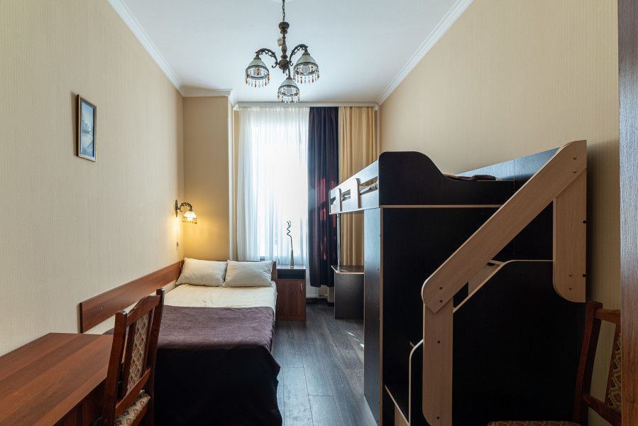 Номер оформлен в светлых тонах, из окон открывается вид на внутренний двор. Номер оснащены полуторной кроватью, прикроватными тумбами и комбинированной детской кроватью-шкафом, письменным столом, телевизором, мини-холодильником. В номере есть только туалет и умывальник. Общие душевые комнаты расположены рядом с номером на этаже. Гостям предоставляются тапки, туалетные принадлежности, полотенца, фен, утюг и гладильная доска. Во всех номерах доступен беспроводной интернет Wi-fi.