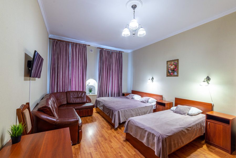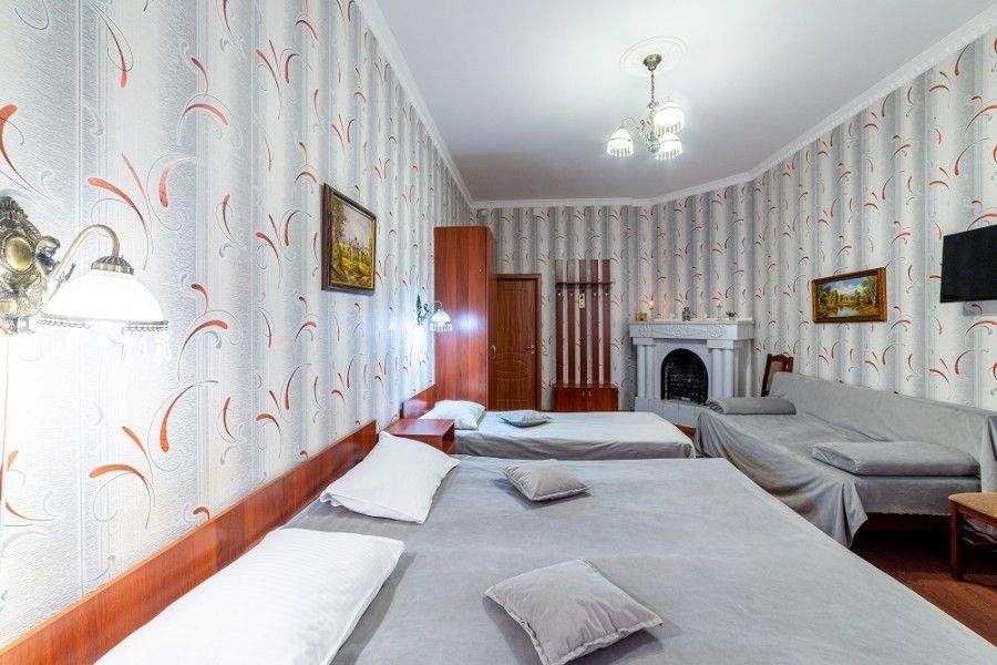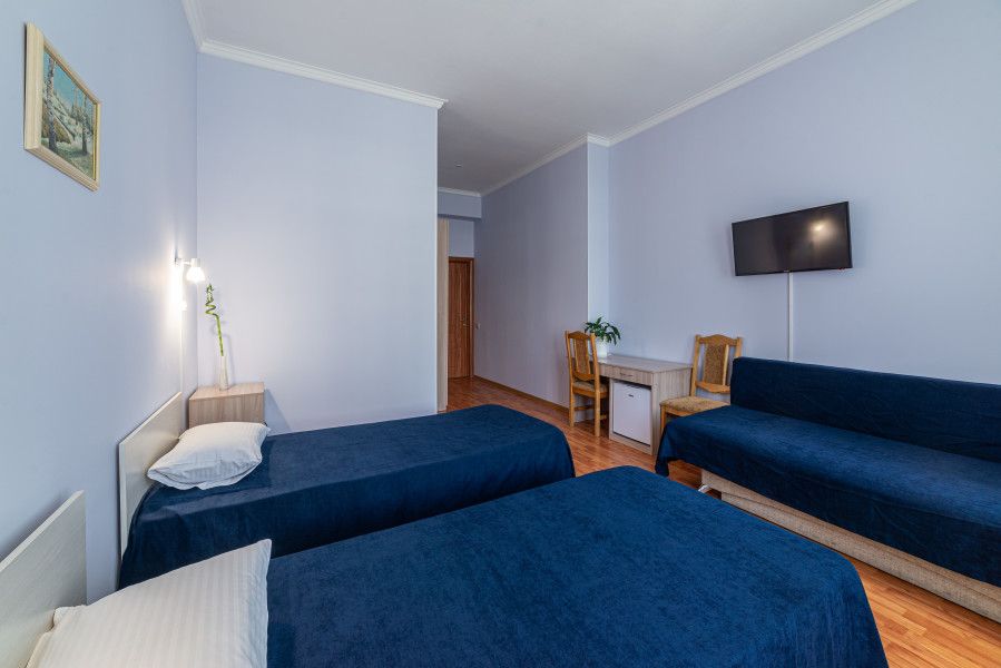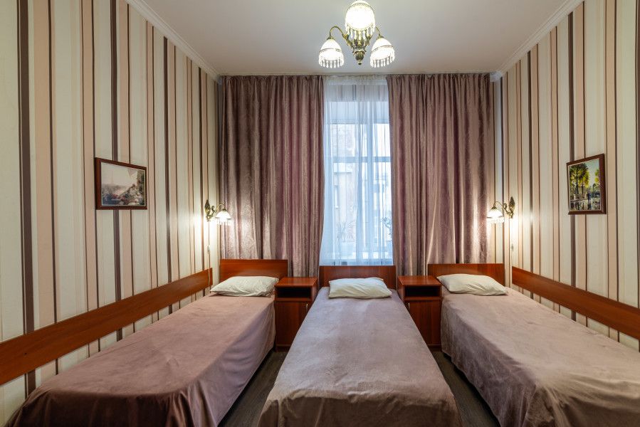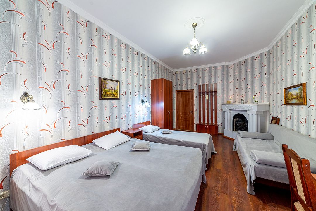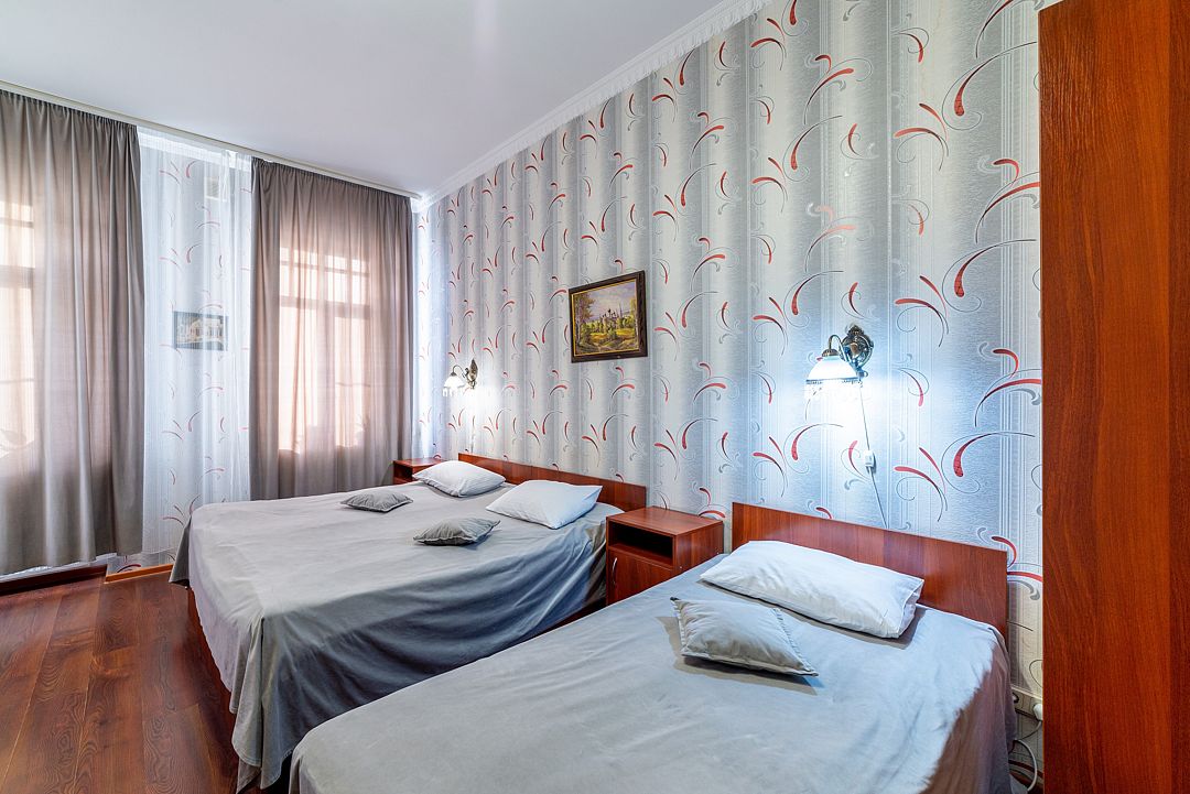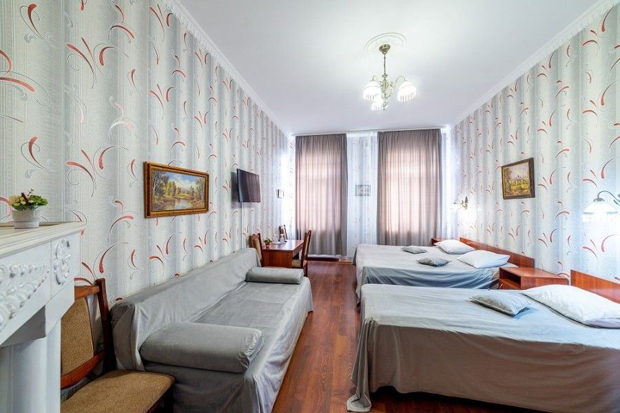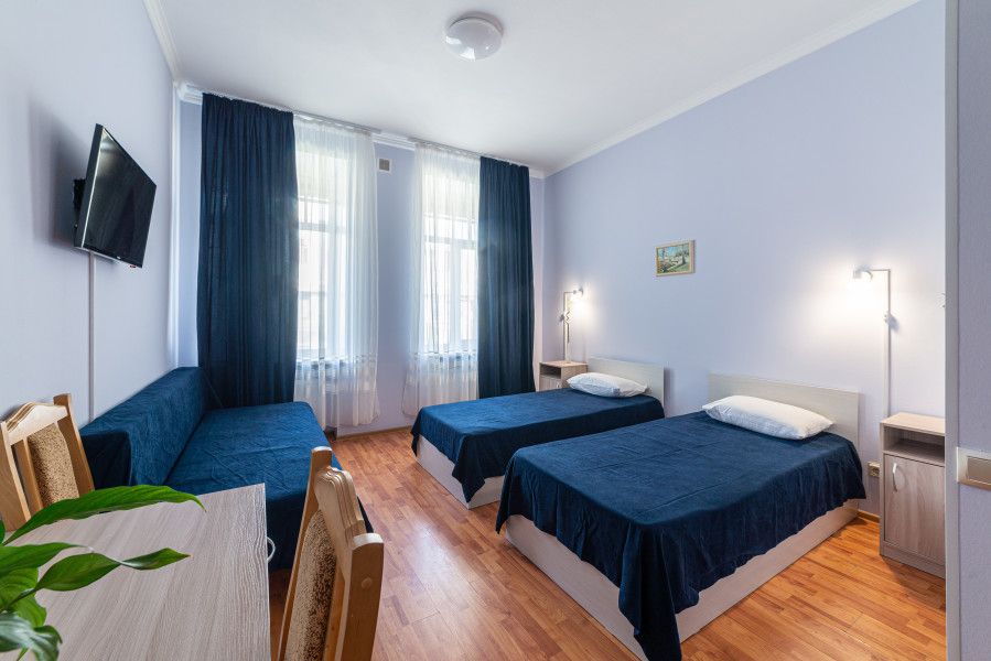 Номера оформлен в светлых тонах. Из окон открывается на улицу Некрасова и соседний дом. Номер оснащены 2 односпальными кроватями и диваном двуспальным, письменным столом, телевизором, мини-холодильником. В номере есть только туалет и умывальник. Общие душевые комнаты расположены рядом с номерам на этаже. Гостям предоставляются тапки, туалетные принадлежности, полотенца, фен, утюг и гладильная доска. Во всех номерах доступен беспроводной интернет Wi-fi.