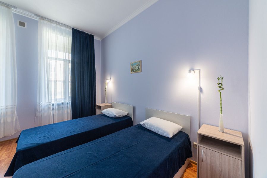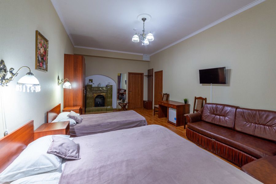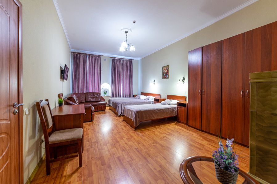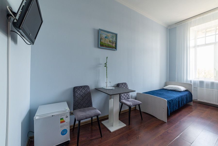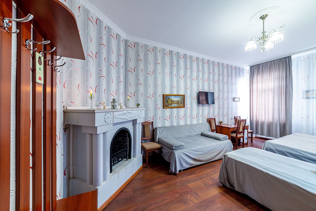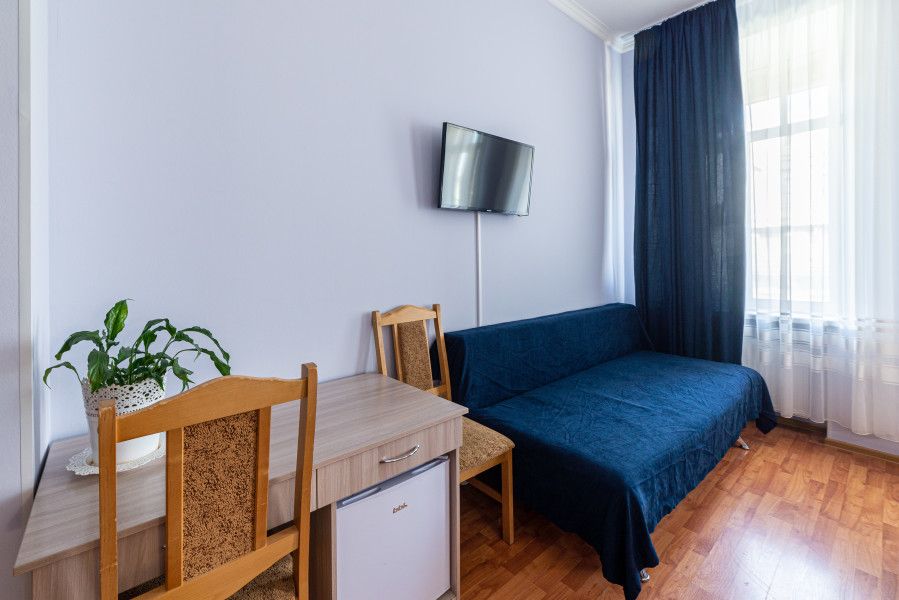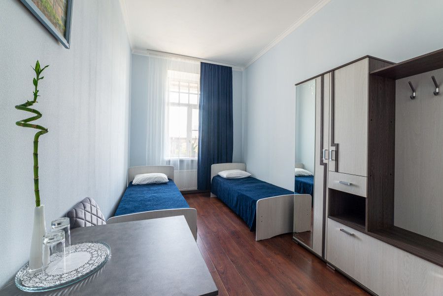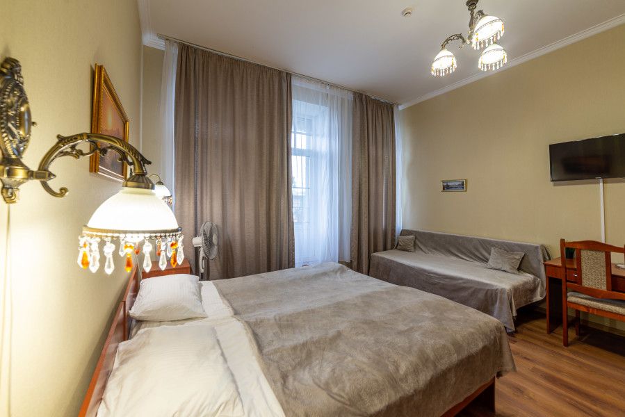 Номера оформлен в светлых тонах. Из окон открывается на улицу Некрасова и соседний дом. Номер оснащены 2 односпальными кроватями и диваном двуспальным, письменным столом, телевизором, мини-холодильником. В номере есть только туалет и умывальник. Общие душевые комнаты расположены рядом с номерам на этаже. Гостям предоставляются тапки, туалетные принадлежности, полотенца, фен, утюг и гладильная доска. Во всех номерах доступен беспроводной интернет Wi-fi.