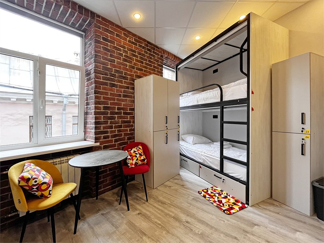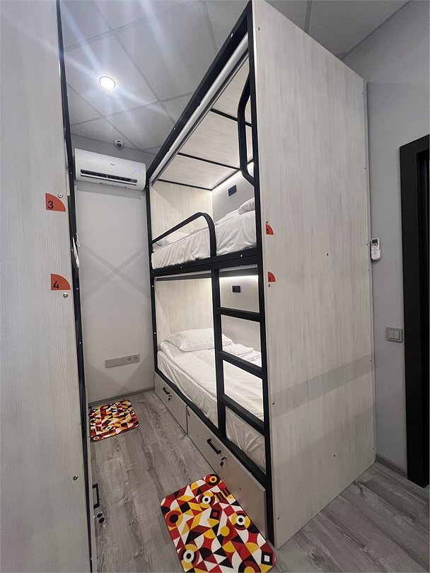 Небольшая уютная комната, где есть все для удобства шести гостей: плотно закрывающиеся «капсулы», комфортные матрасы, чистое постельное белье, полотенца, места для хранения личных вещей и небольшая зона для отдыха. Индивидуальное освещение каждого спального места, шторы-блэкаут и кондиционер позволят вам создать собственный микроклимат, а личный шкафчик сохранит вещи в безопасности.Услуги и удобства