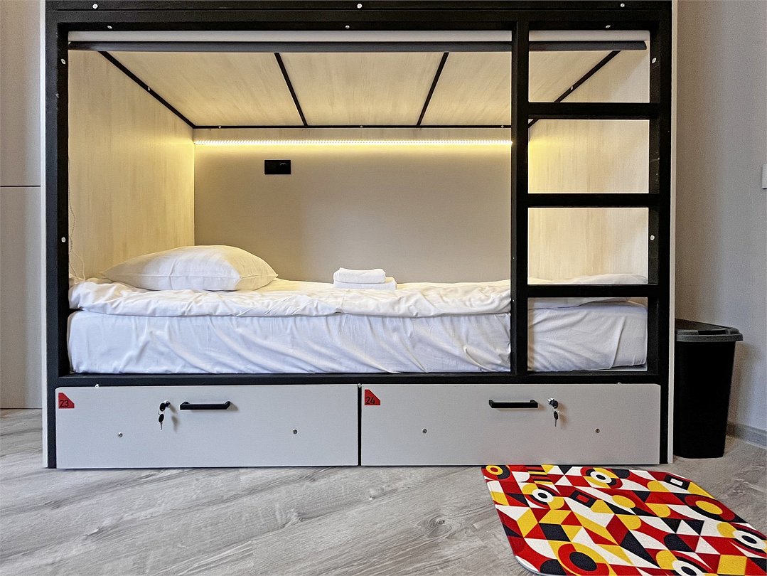 Номер, созданный специально для прекрасных дам. У каждого гостьи будет еее собственное удобное и функциональное место для отдыха. Каждая «капсула» оборудована индивидуальным освещением и розеткой, а от остальных гостей вы сможете закрыться плотной светонепроницаемой шторой. Размер спального места – 90*200 см. В стоимость проживания входит постельное белье и полотенца.Услуги и удобства