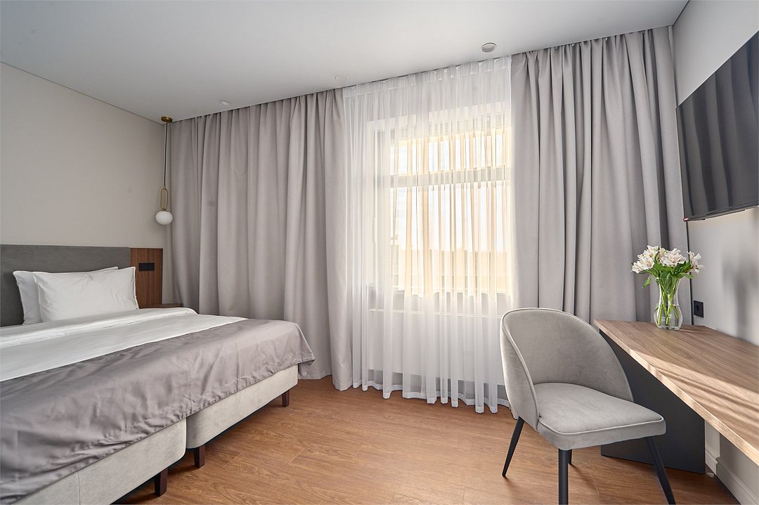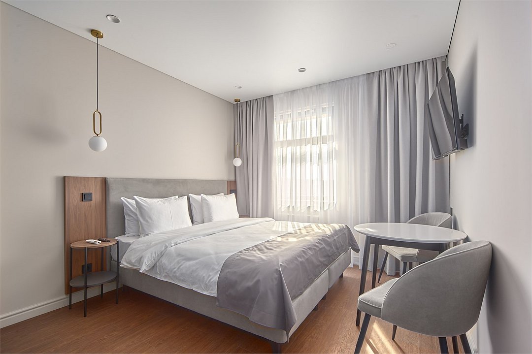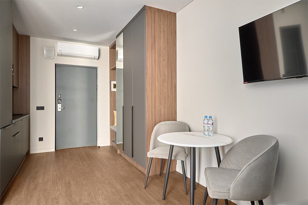 Wi-Fi, телефон, холодильник, кондиционер, фен, электронные замки, плита для приготовления пищи, микроволновая печь, ванная комната, душевая кабина, банные принадлежности, банные полотенца, тапочки, двуспальная кровать, стулья, шкаф для одежды, обеденный стол, зеркало, набор посуды, сейф, стиральная машина, чайник, унитаз, раковина, отопление, вид на город, центральное кондиционирование, вид во двор, ламинат, стаканы, столовые приборы, туалетные средства, внутренний телефон, телевизор с плоским экраном, кухонный уголок, номер для некурящих, рабочий стол, уборка номера, вешалки-плечики, бутилированная вода, можно с питомцамиВ гостиничном номере