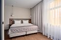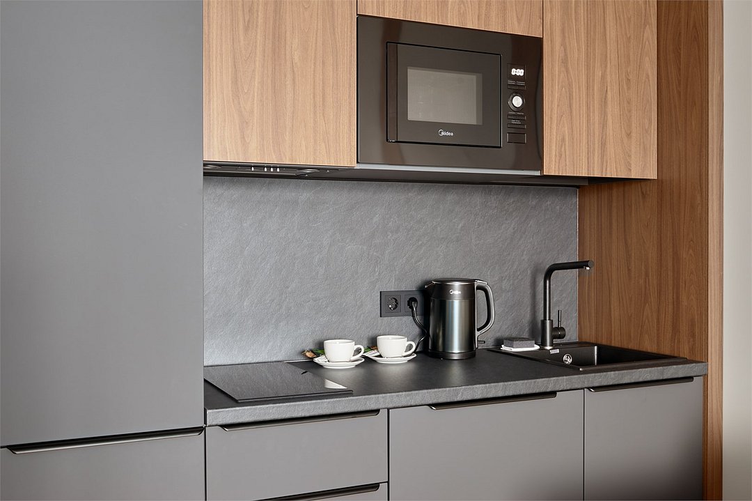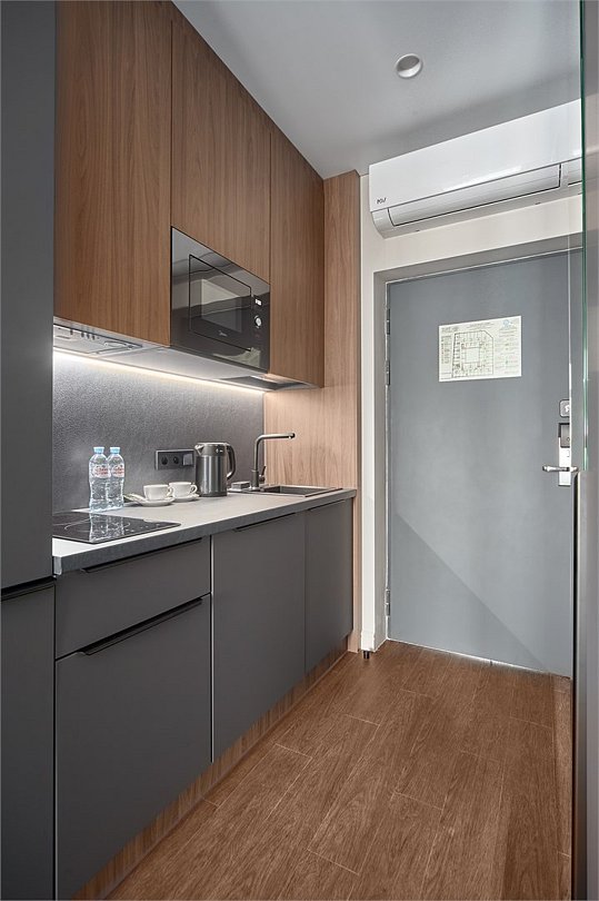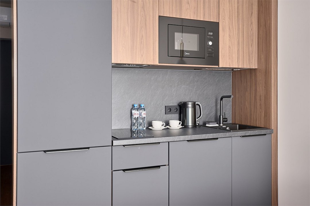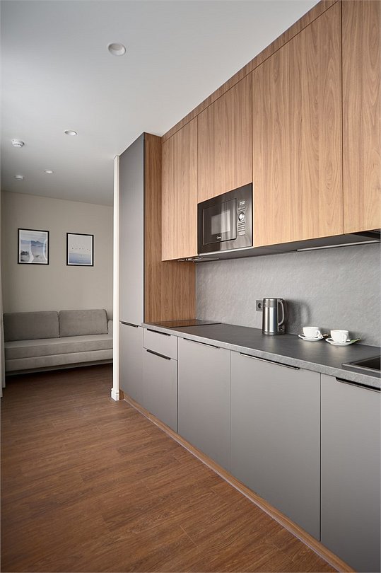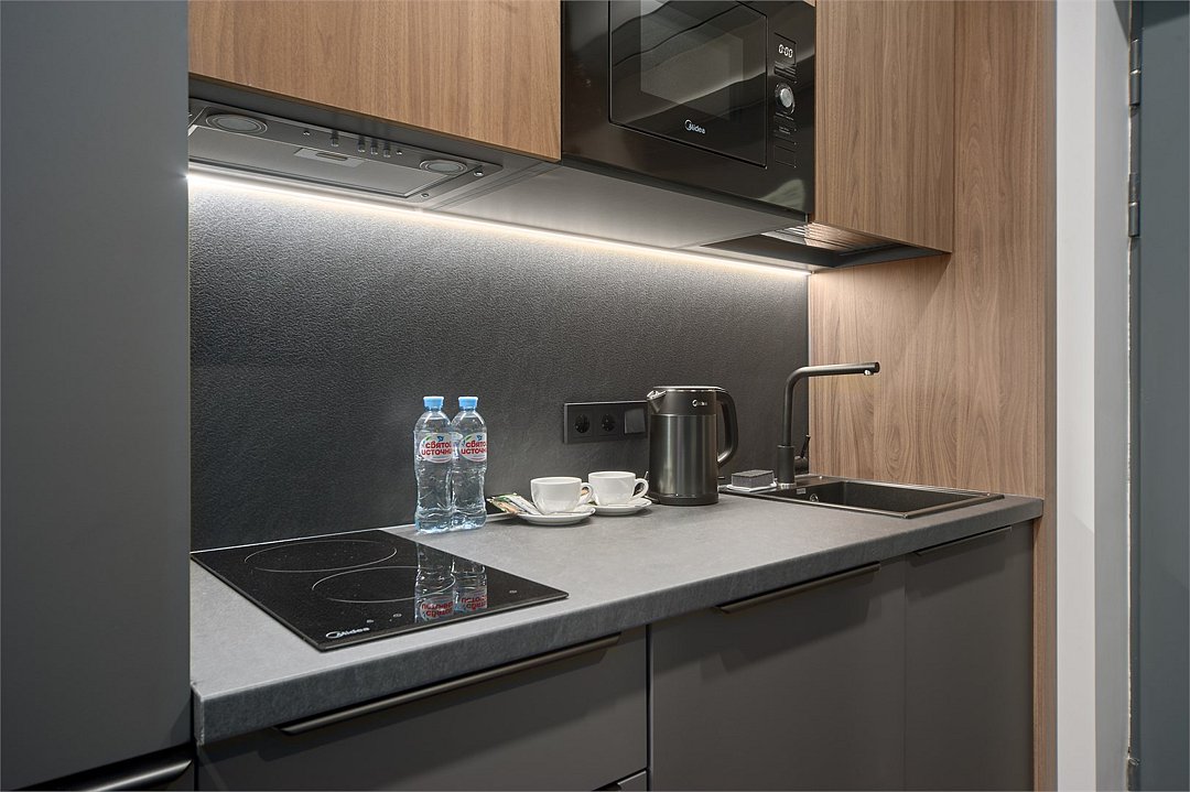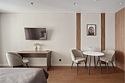 Комфортабельный просторный номер площадью 43 кв.метра. Каждый номер оснащен двуспальной кроватью, диваном, рабочим местом, обеденной зоной, кухонным уголком со всем необходимым. В каждом номере - чайник, микроволновая печь, холодильник, плита для приготовления пищи, посуда, столовые приборы - все для Вашего удобства! Ванная комната оснащена качественной сантехникой, всеми необходимыми туалетными принадлежностями, махровыми полотенцами и тапочками.Услуги и удобства