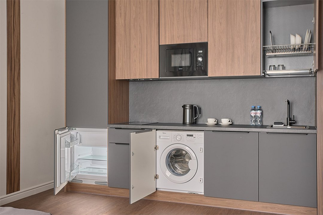 Wi-Fi, холодильник, кондиционер, система климат-контроля, фен, электронные замки, плита для приготовления пищи, микроволновая печь, душевая кабина, банные полотенца, тапочки, косметические средства, двуспальная кровать, стулья, шкаф для одежды, обеденный стол, зеркало, набор посуды, сейф, стиральная машина, чайник, унитаз, раковина, обеденная зона, отопление, вид на город, центральное кондиционирование, вид во двор, стаканы, столовые приборы, туалетные средства, внутренний телефон, телевизор с плоским экраном, кухонный уголок, номер для некурящих, уборка номера, вешалки-плечики, бутилированная вода, мыло, можно с питомцамиВ гостиничном номере