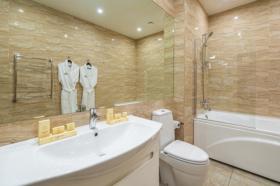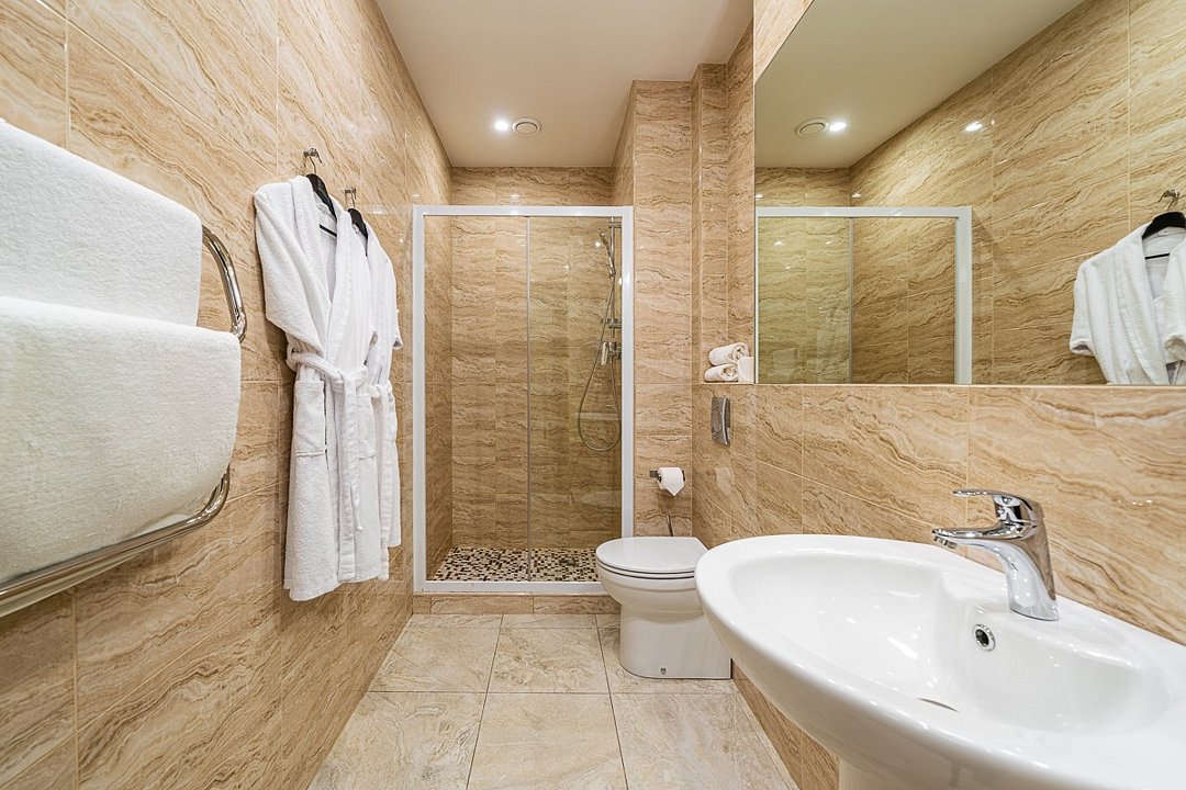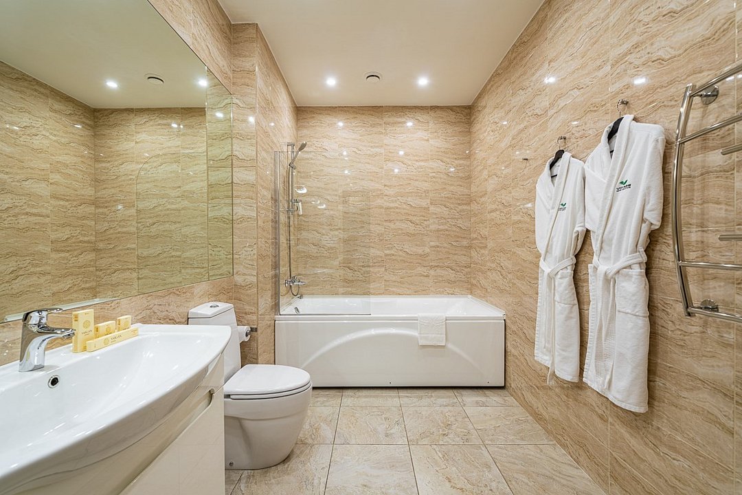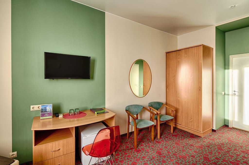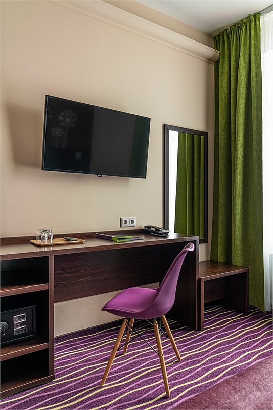 Чтобы вы могли отдохнуть после долгого дня, в номере есть телевизор и халат. Оснащение зависит от выбранной категории номера.