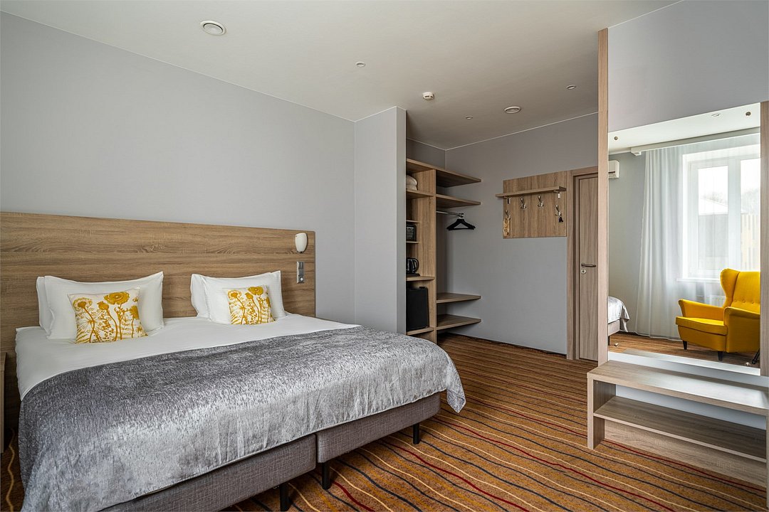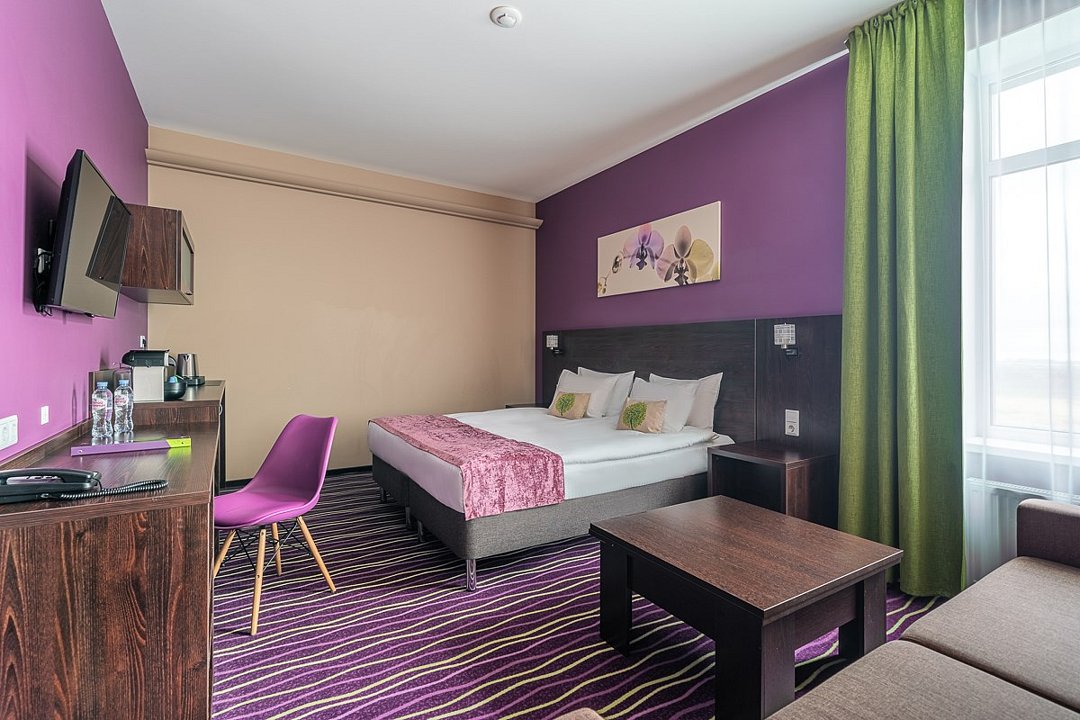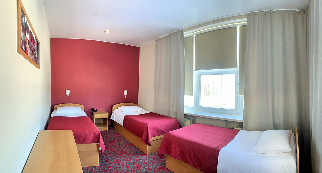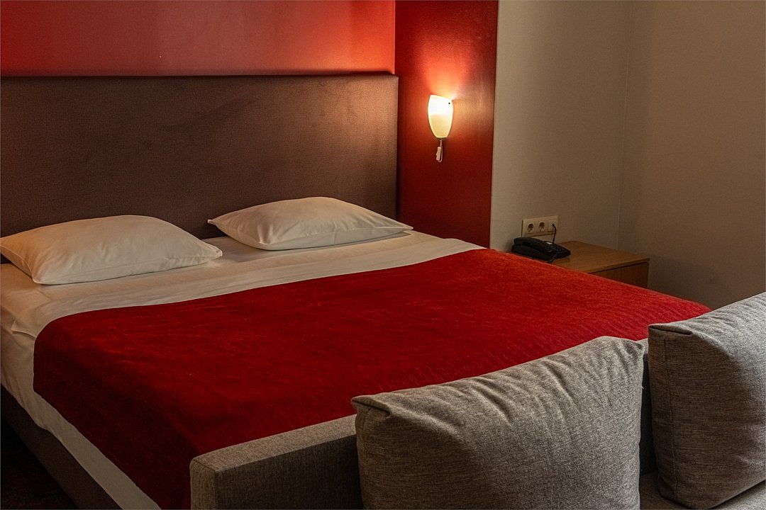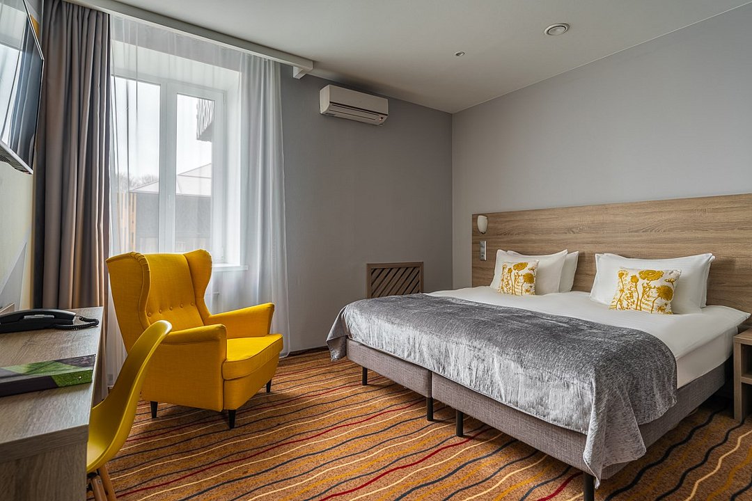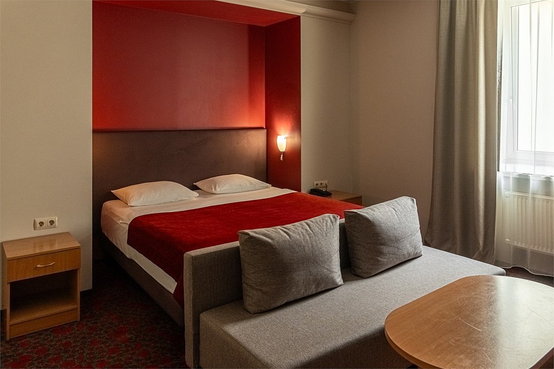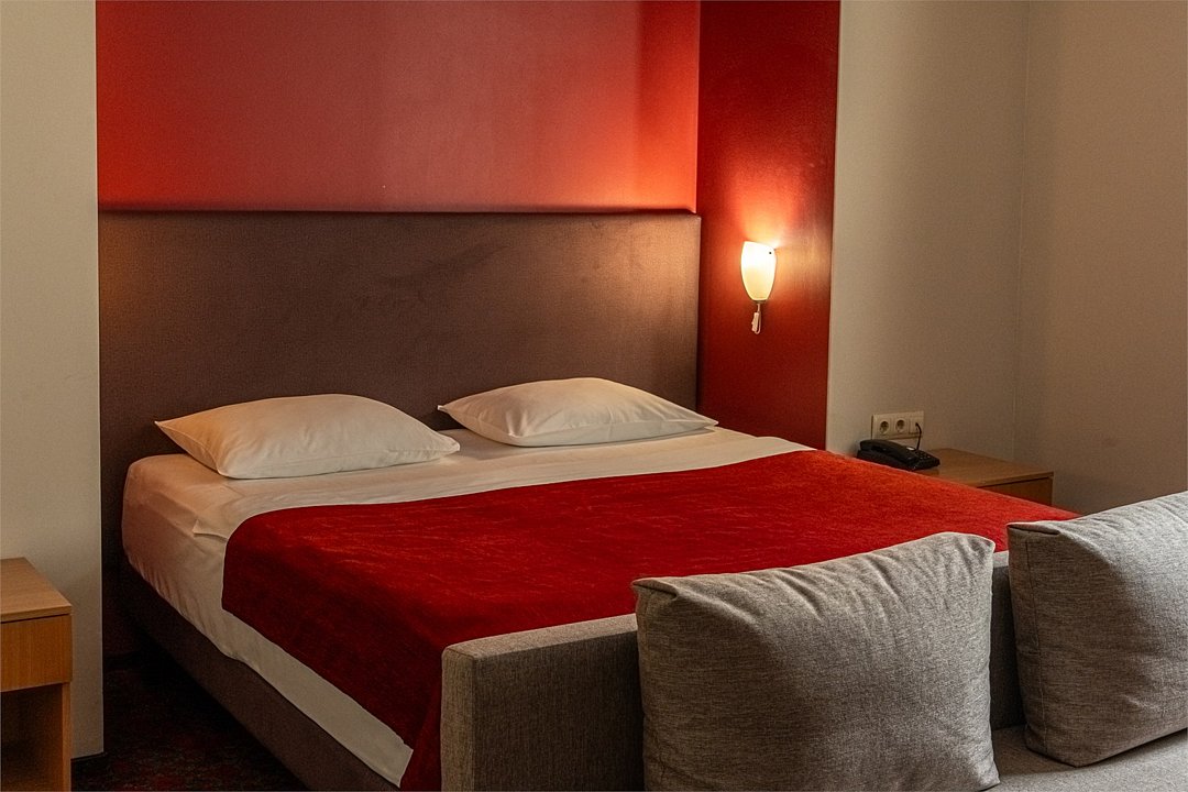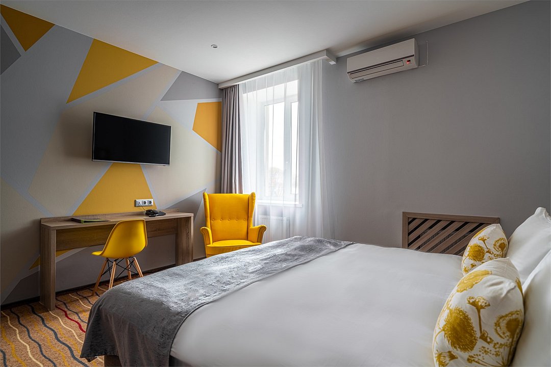 Уютный номер с современной мебелью и со всем необходимым для комфортного проживания. В каждом номере есть климат-контроль, электронный сейф, холодильник, фен, теплый пол в ванной комнате. Для размещения 3-го человека в номера предоставляется евро-раскладушка.Услуги и удобства