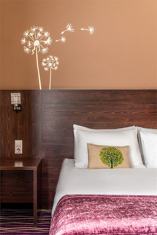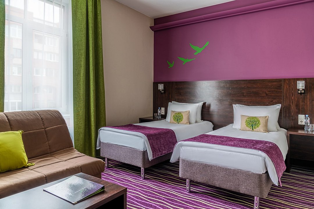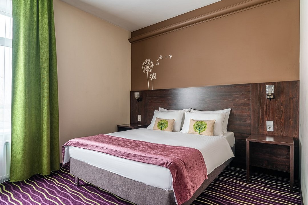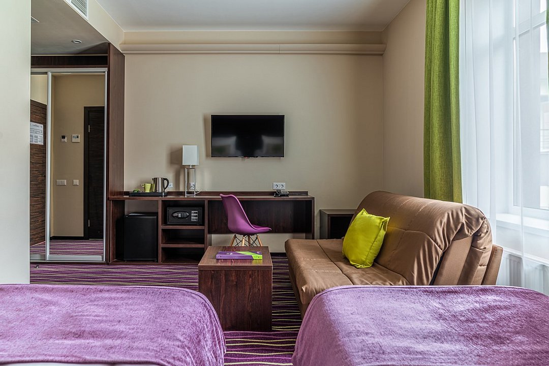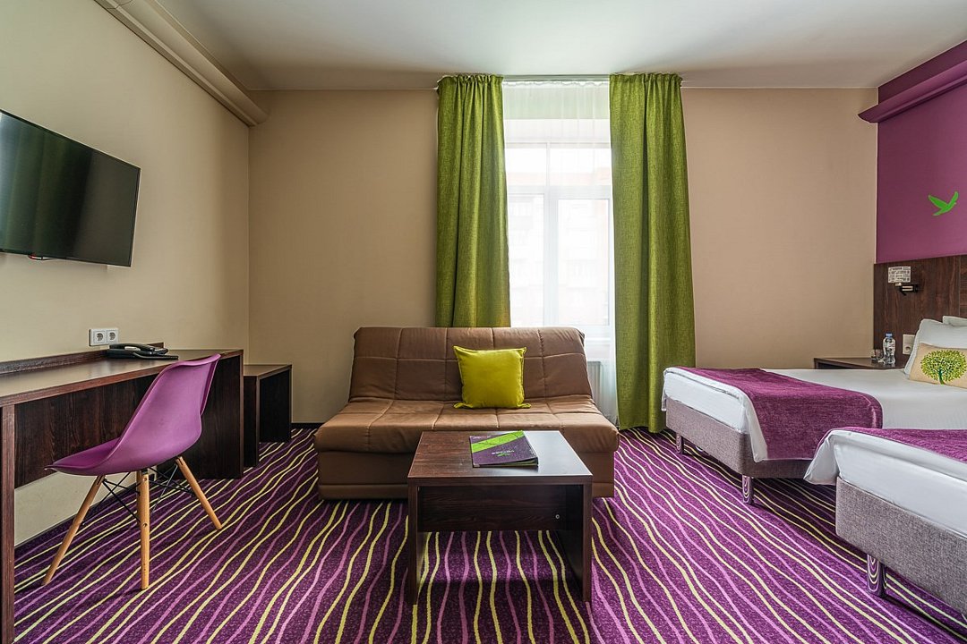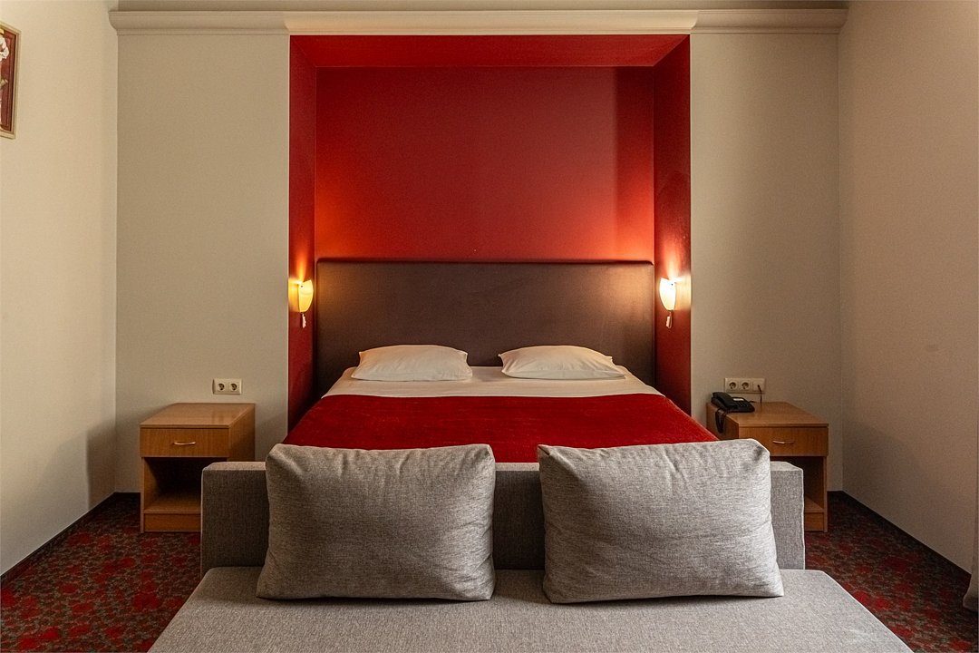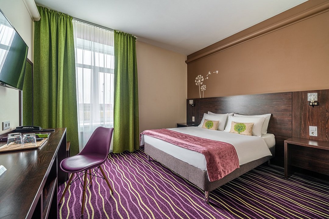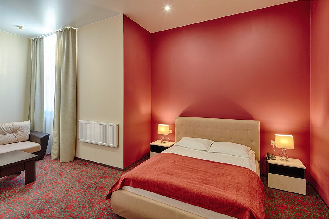 Уютный номер с современной мебелью и со всем необходимым для комфортного проживания. В каждом номере есть климат-контроль, электронный сейф, холодильник, фен, теплый пол в ванной комнате. Для размещения 3-го человека в номера предоставляется евро-раскладушка.Услуги и удобства