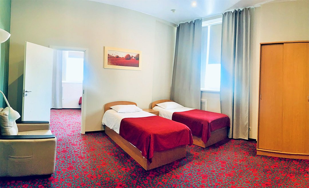 Двухкомнатный просторный номер 35 кв.м. с тремя односпальными кроватями в одной комнате и диваном кроватью во второй комнате. Wi-Fi, шторы blackout, телевизор, холодильник, душевая кабина, туалетные принадлежности, фен, комплект полотенец.Услуги и удобства