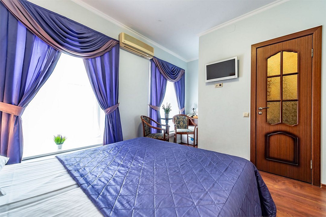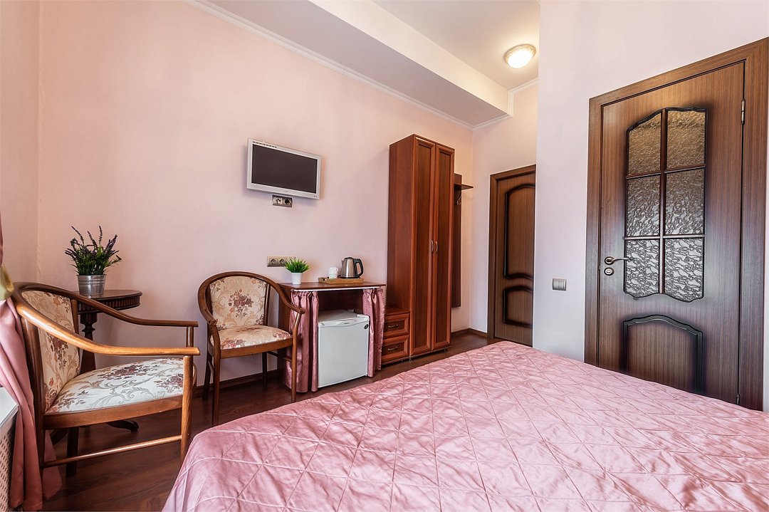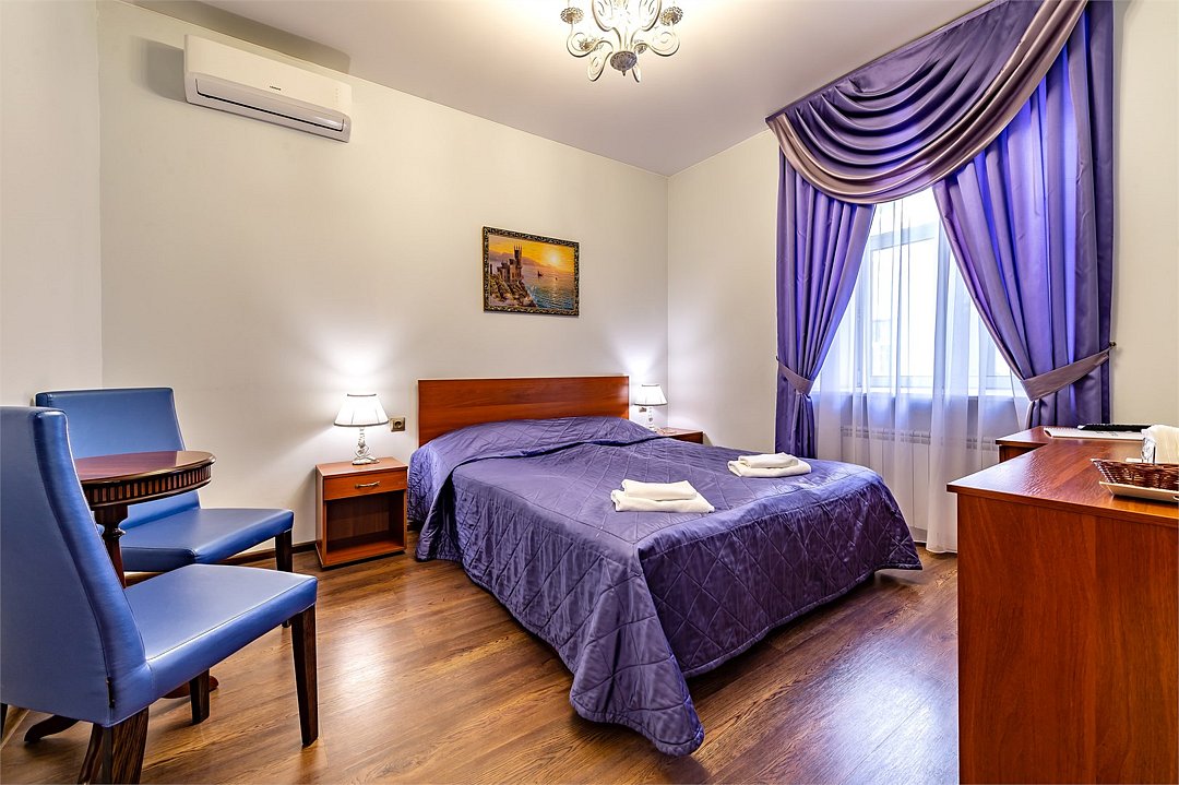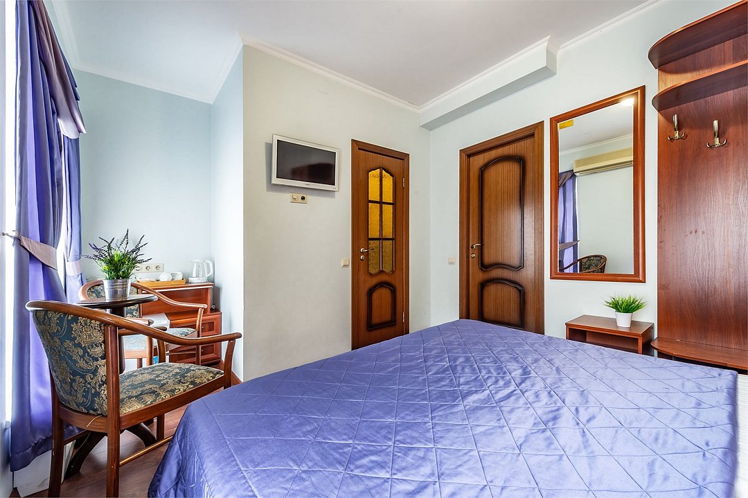 Улучшенный номер с двуспальной кроватью. В номере кондиционер, телевизор с плоским экраном, кабельное телевидение, Wi-Fi, электронный сейф, телефон, центральное отопление, стол, шкаф, мини холодильник, электрочайник, собственная ванная комната с душевой кабиной, феном, тапочками. Дополнительное место - раскладушка. Номера расположены на 4-5 этажах. В доме нет лифтаУслуги и удобства