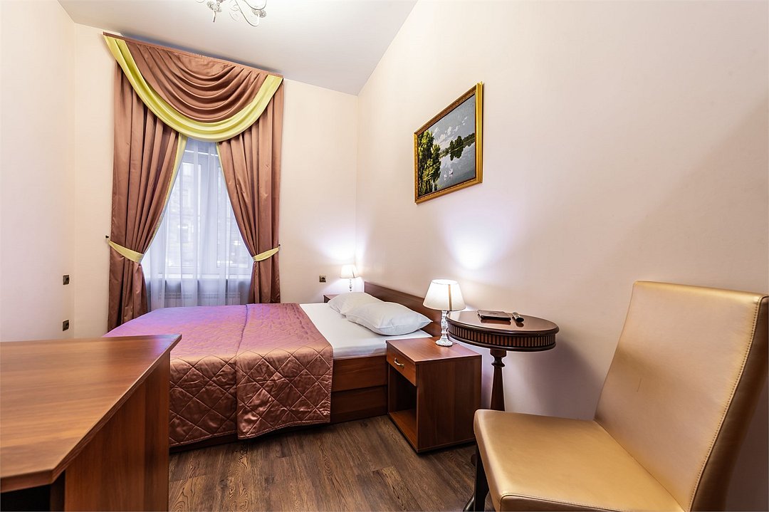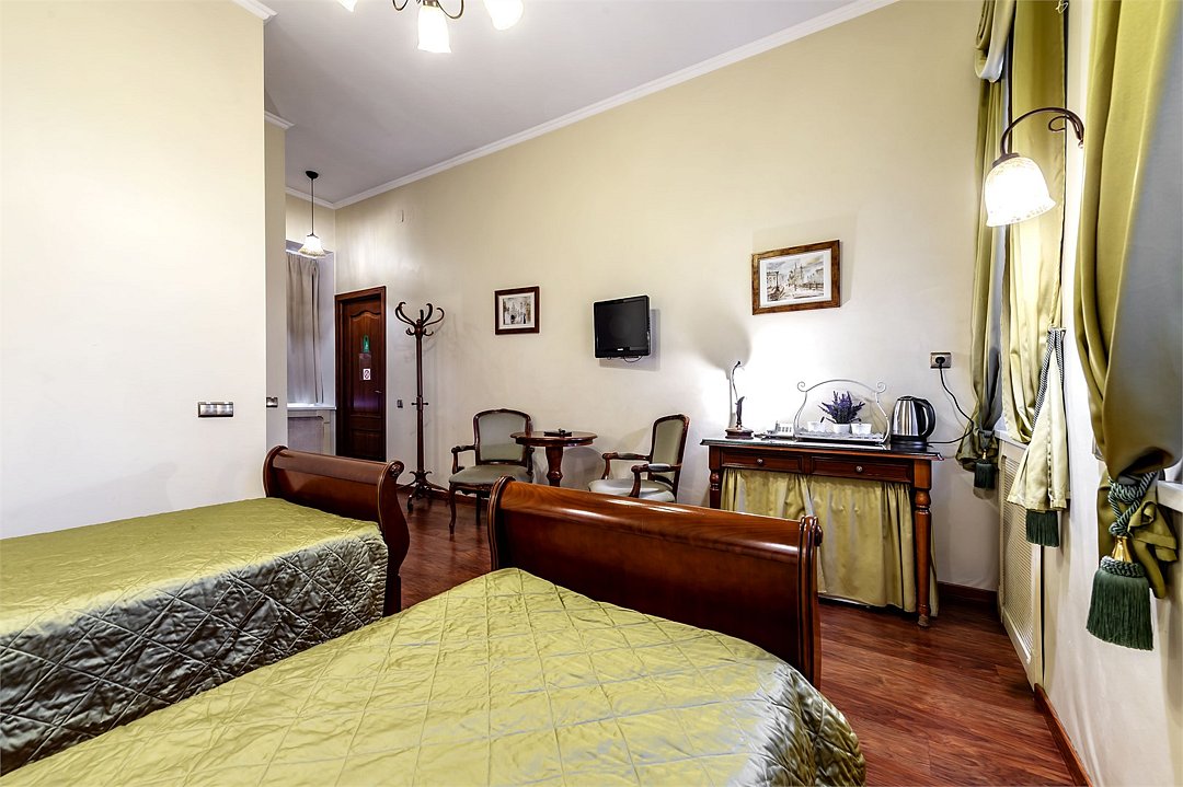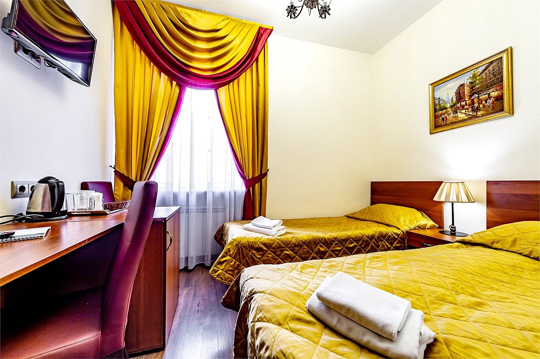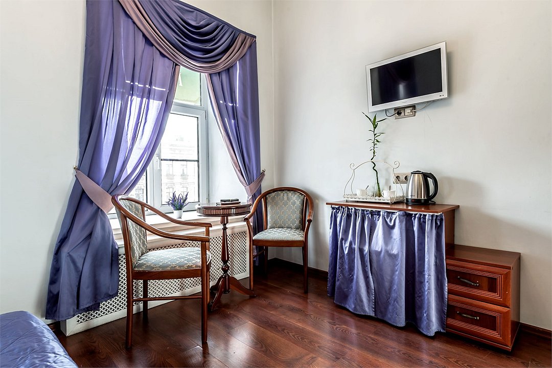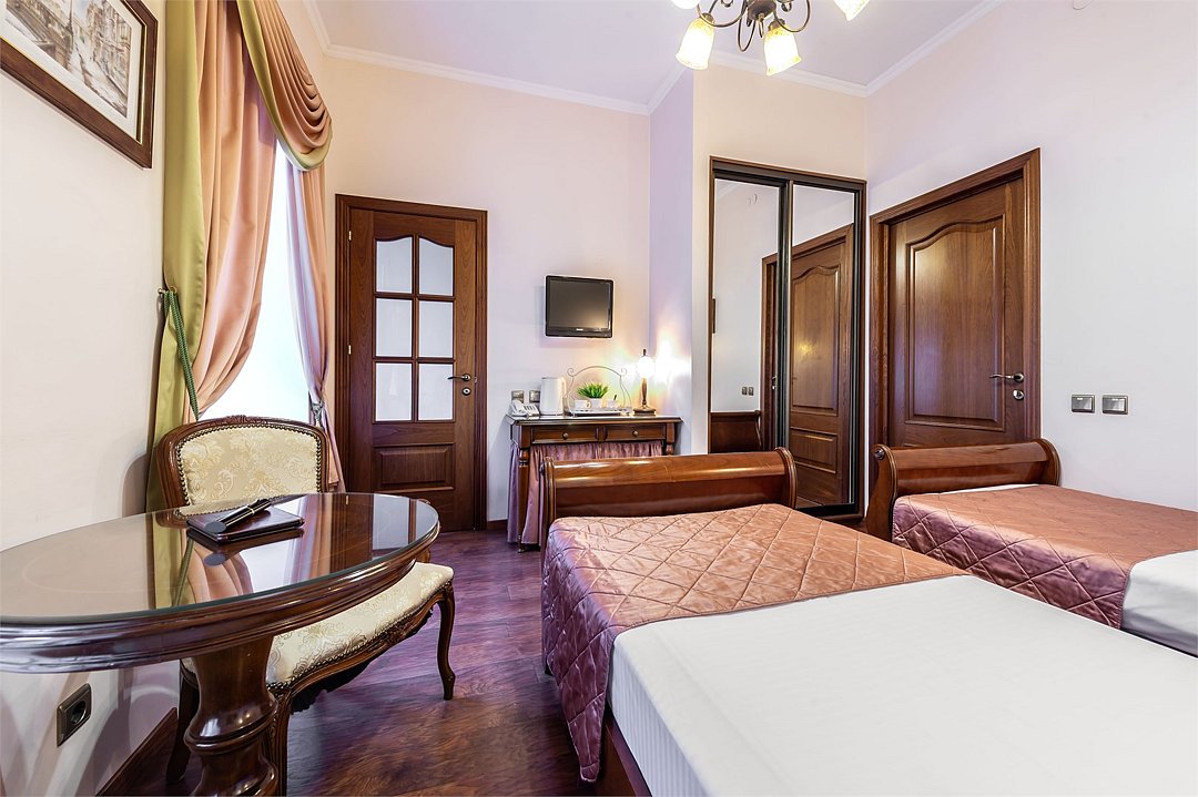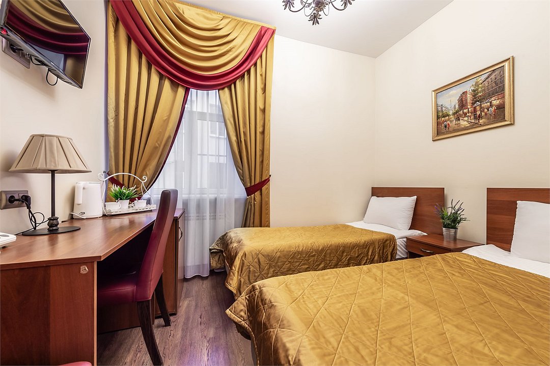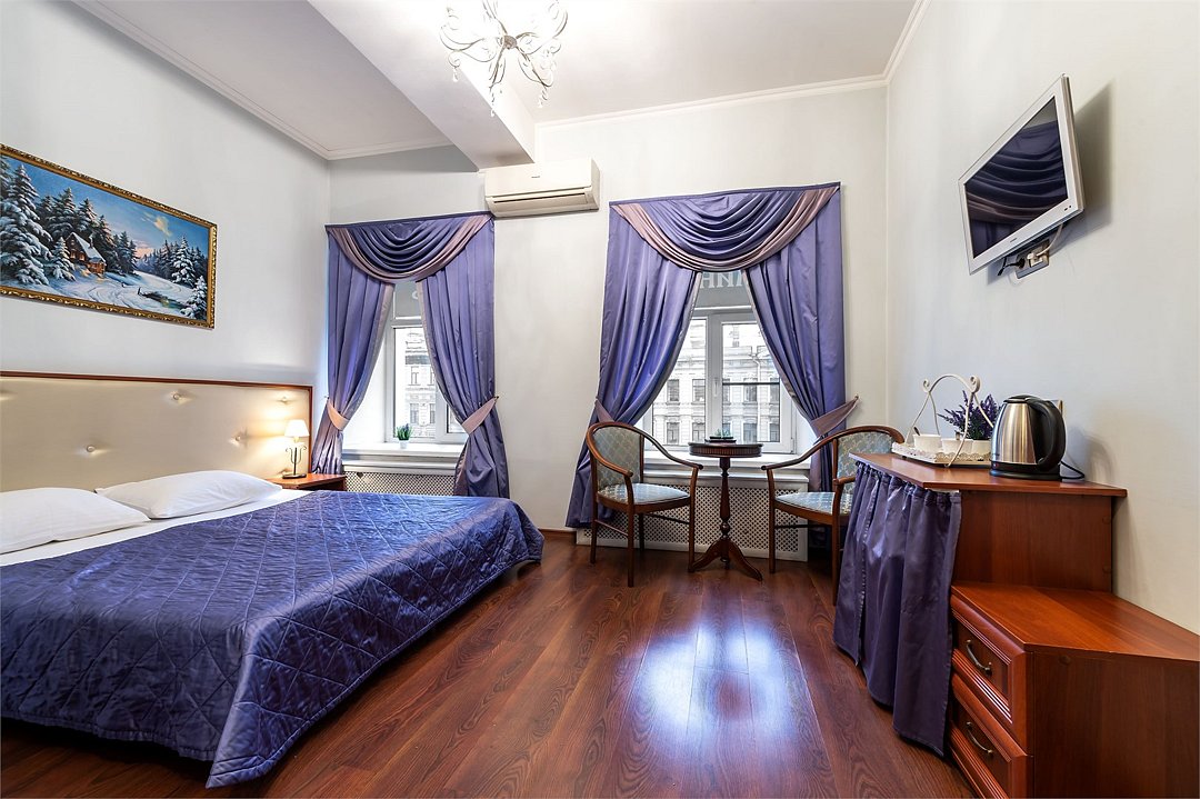 Комфортный номер с 1 или 2 кроватями, с видом на Невский проспект или во внутренний дворик. В номере кондиционер, телевизор, кабельное телевидение, Wi-Fi, электронный сейф, телефон, центральное отопление, стол, шкаф, мини холодильник, электрочайник, собственная ванная комната с душевой кабиной, феном, тапочками и набором полотенец. Номера расположены на 5 этаже. В доме нет лифтаУслуги и удобства