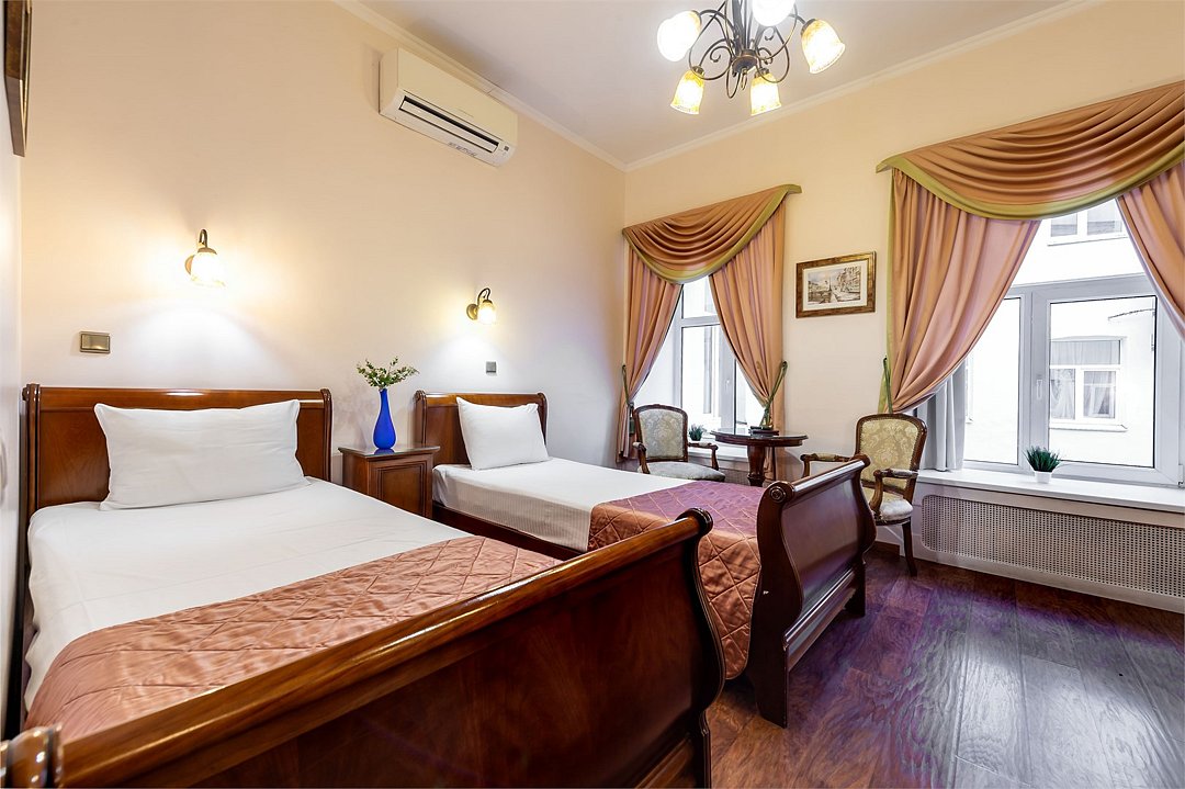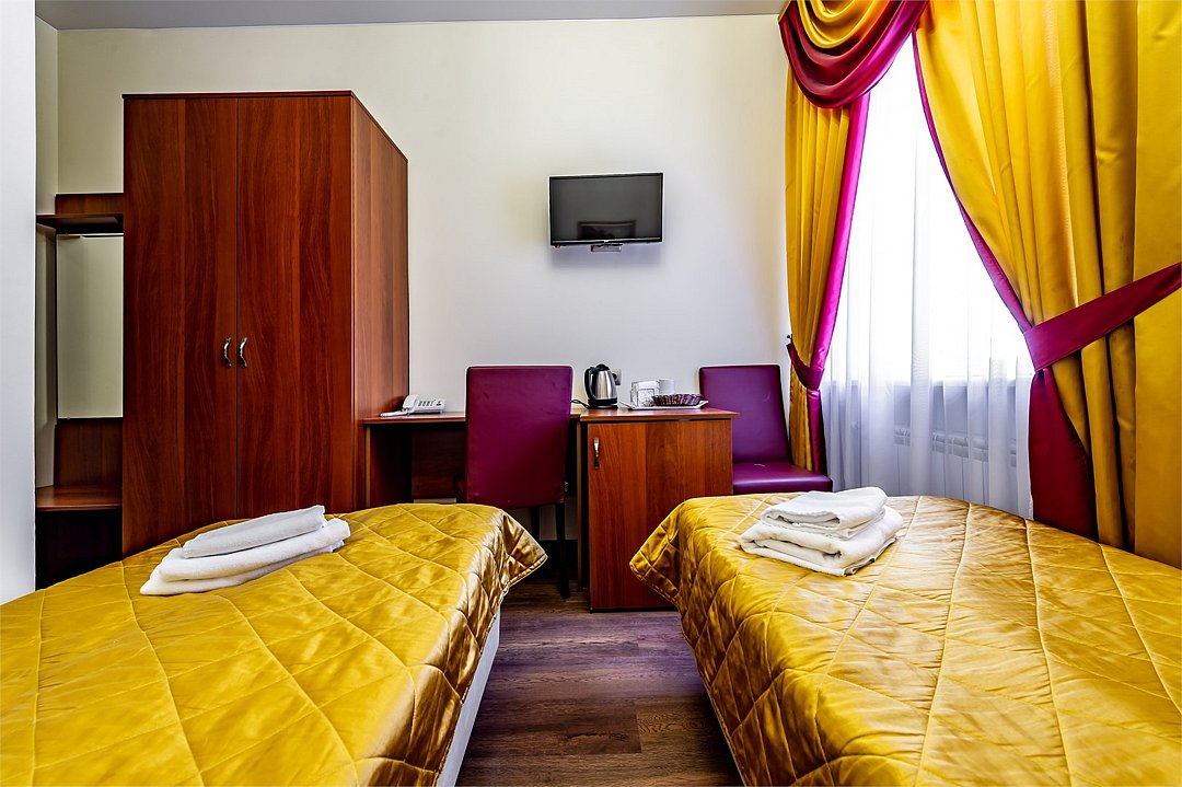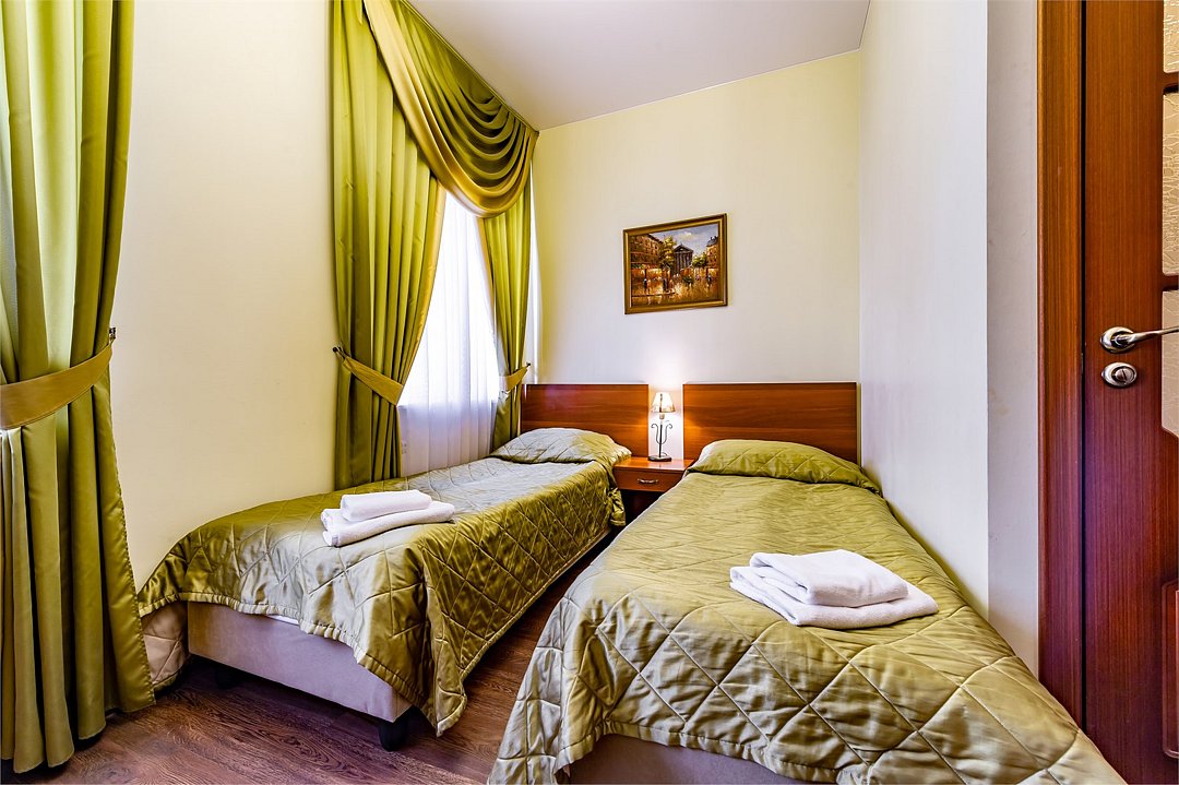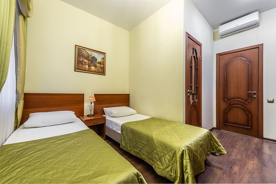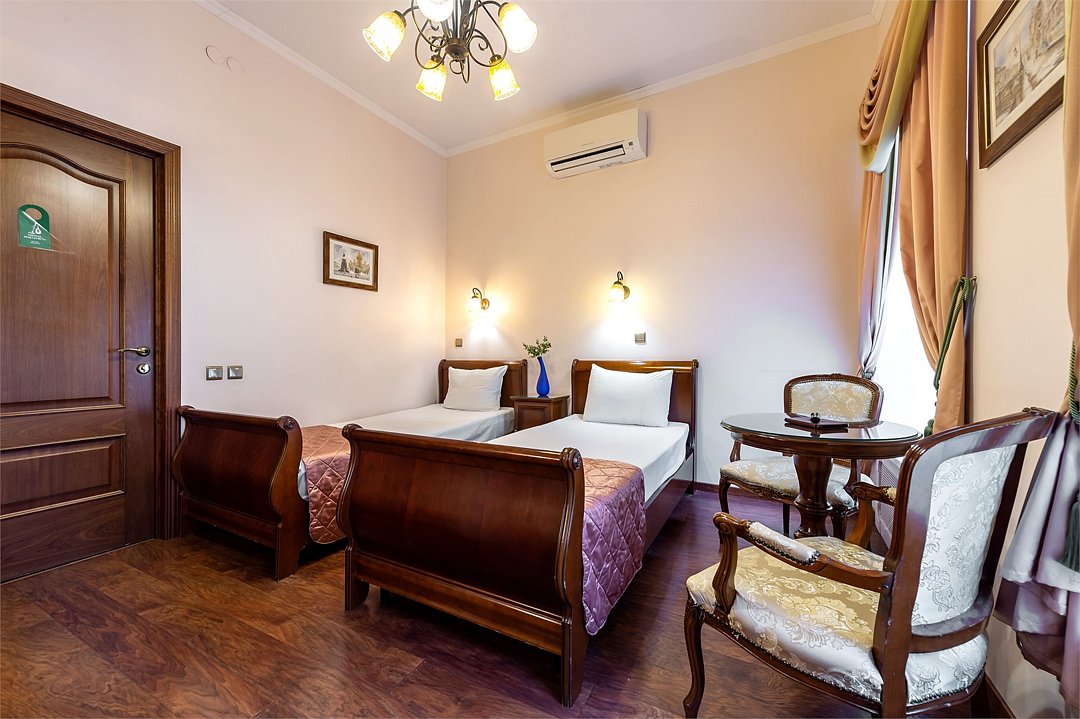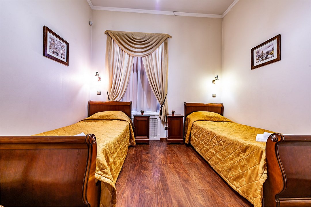 Улучшенный номер с двумя односпальными кроватями и видом во внутренний дворик. В номере кондиционер, телевизор с плоским экраном, кабельное телевидение, Wi-Fi, электронный сейф, телефон, центральное отопление, стол, шкаф, мини холодильник, электрочайник, собственная ванная комната с душевой кабиной, феном, банными и косметическими принадлежностями, тапочками. Дополнительное место - раскладушка. Номера расположены на 4-5 этажах, в доме нет лифтаУслуги и удобства