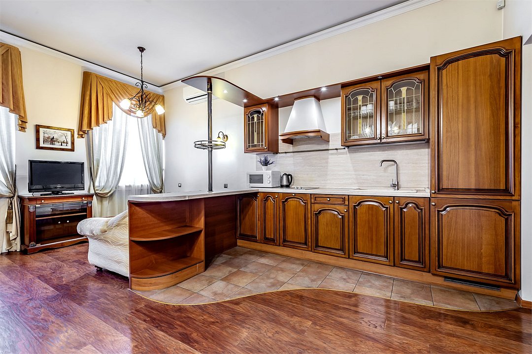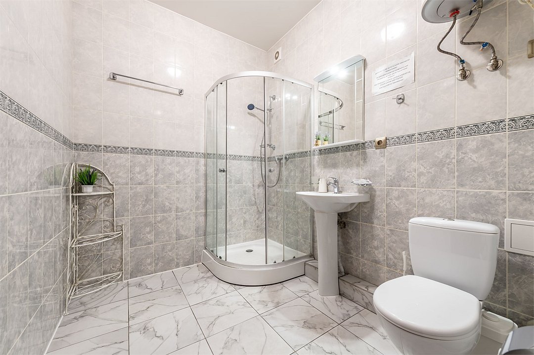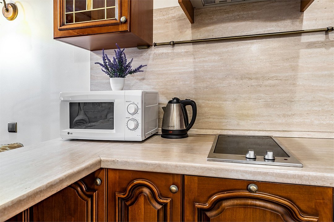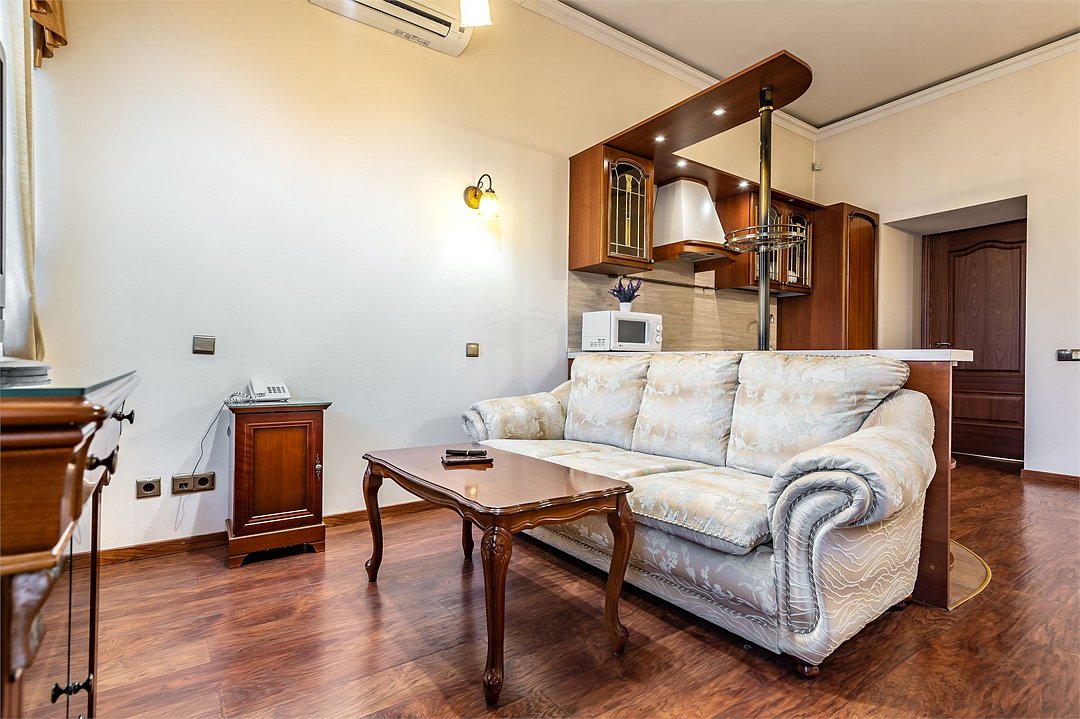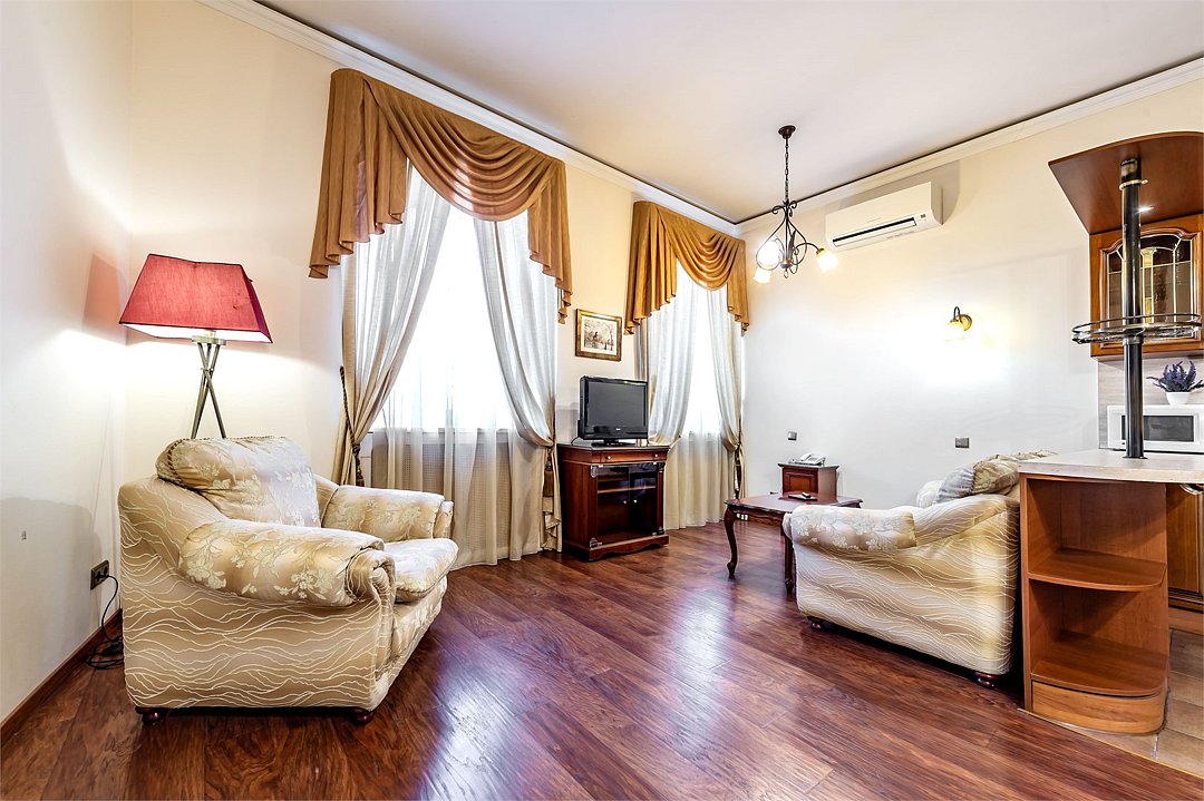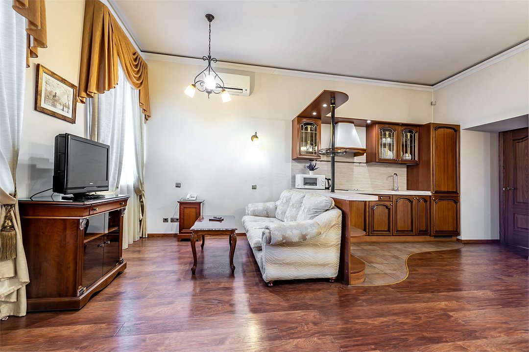 Прекрасно оборудованные всем необходимым и выдержанные в классическом стиле 2-х комнатные апартаменты включают в себя гостиную и кухонную зону, 2 санузла, 2 спальни: -спальня с двуспальной кроватью, -спальня с двумя односпальными кроватями Возможно установить дополнительное спальное место. В апартаментах: Холодильник Кондиционер Оборудованная кухня Микроволновая печь Плита электрическая Чайник Посуда Посудомоечная машина Стиральная машина Телефон Телевизор Сейф Гладильная доска, утюг Фен Тапочки Апартаменты расположены на 4 и 5 этажах. В доме нет лифтаУслуги и удобства