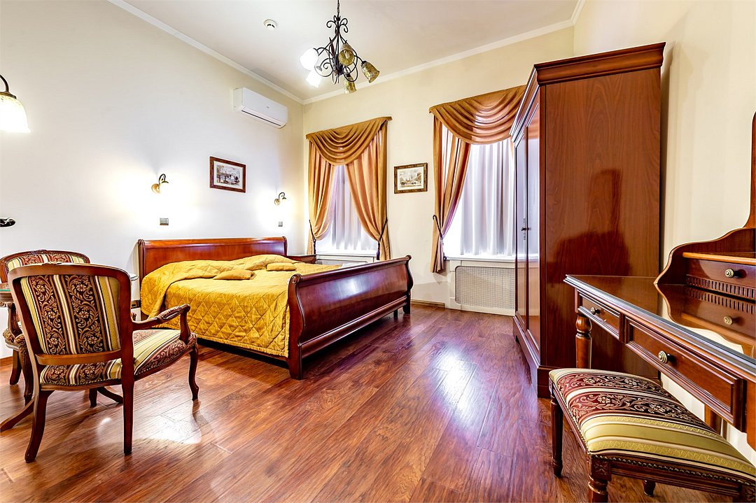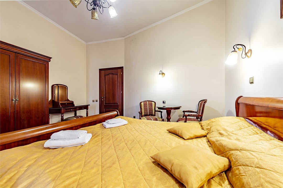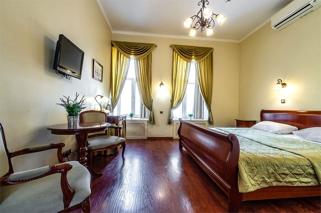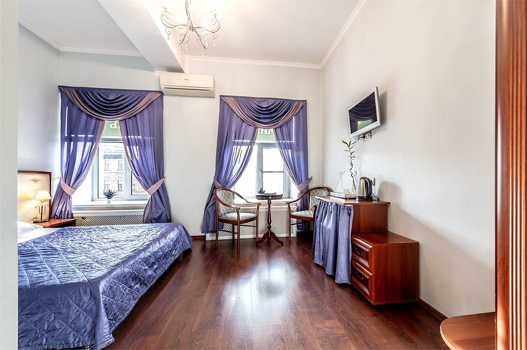 Просторный номер, оформленный в классическом стиле, с двуспальной кроватью и видом на Невский проспект. В номере кондиционер, телевизор с плоским экраном, кабельное телевидение, Wi-Fi, электронный сейф, телефон, центральное отопление, стол, шкаф, мини холодильник, электрочайник, собственная ванная комната с душевой кабиной, феном, тапочками. Дополнительное место - диван-тахта. Номера расположены на 2 этаже.Услуги и удобства