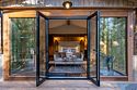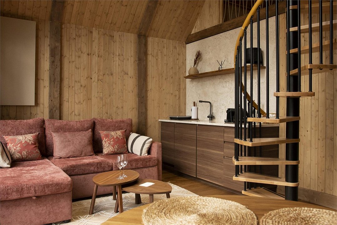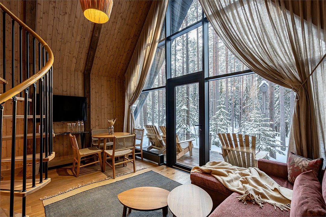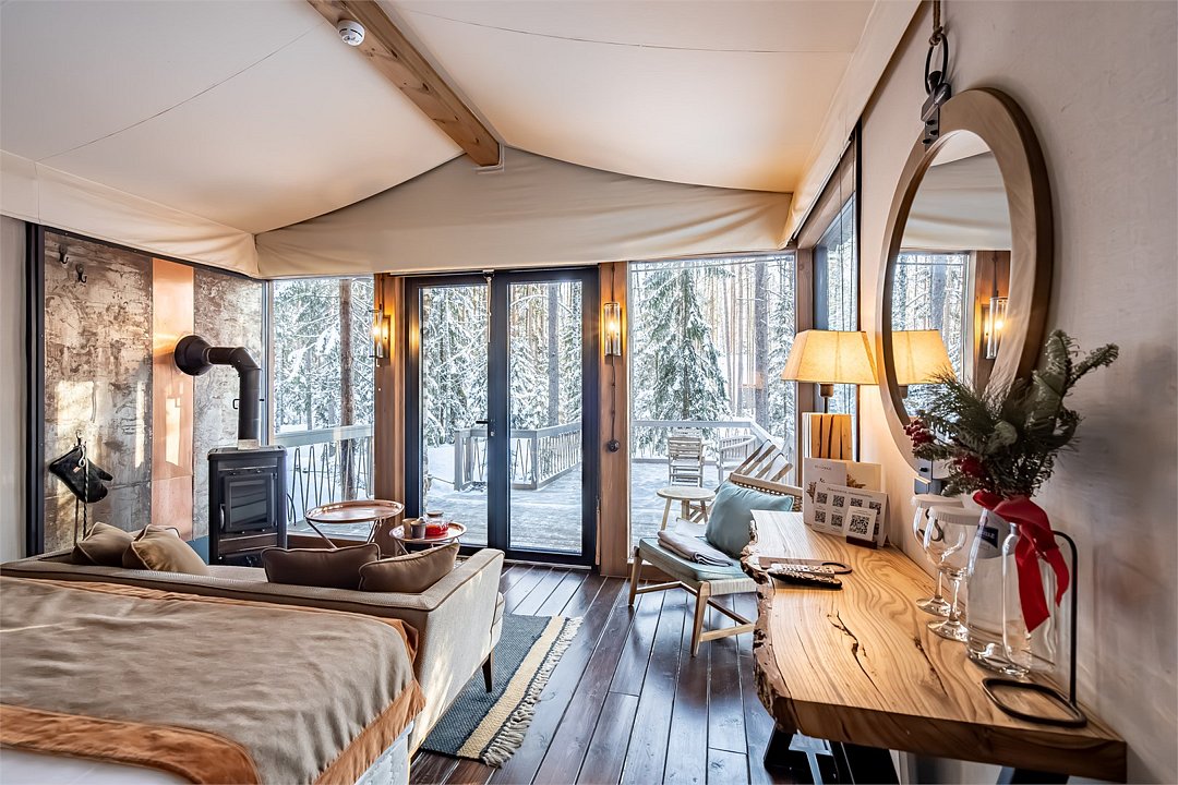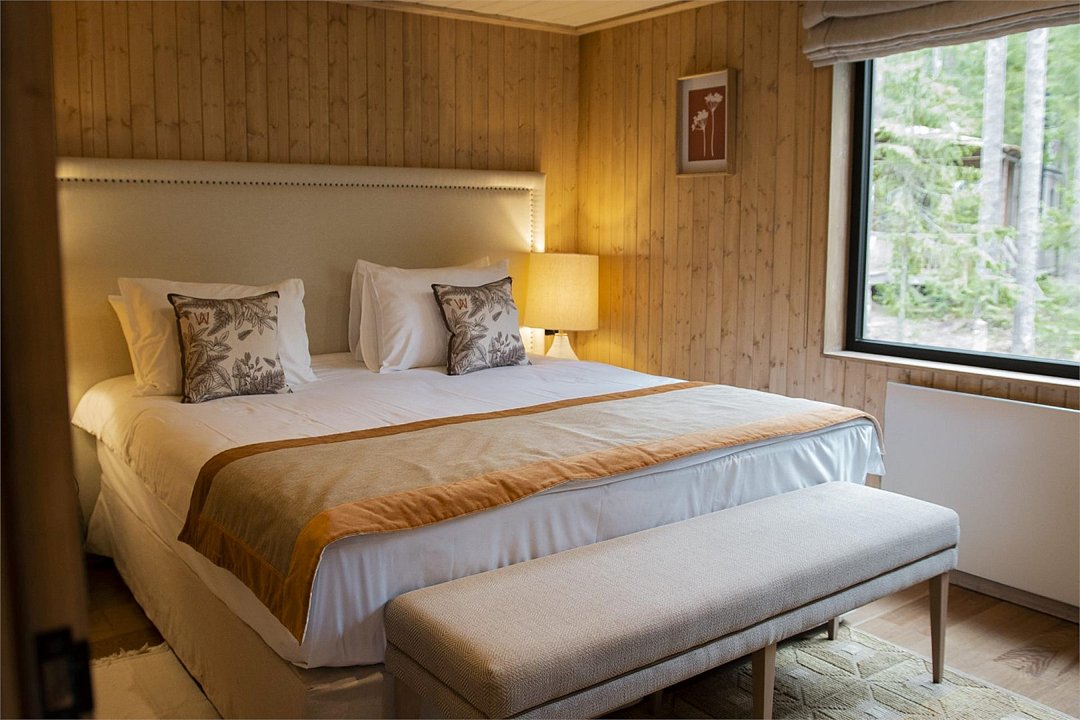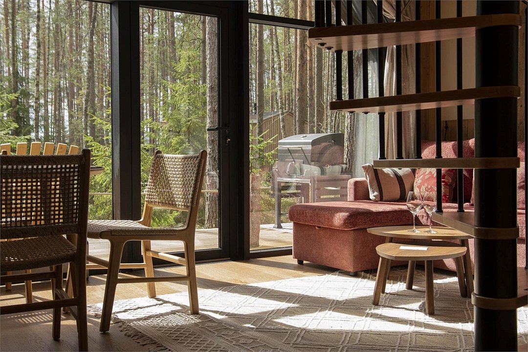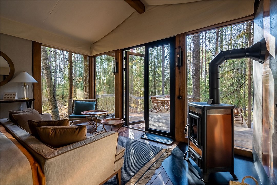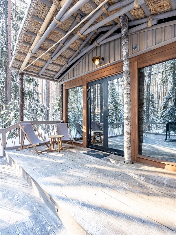 Большой деревянный лодж в лесу с панорамными окнами и 2 спальнями: с двуспальной кроватью или 2 отдельными (по запросу) на 1 этаже и двуспальной кроватью со вторым светом на 2 этаже. Гостиная оборудована проектором для просмотра коллекции фильмов, раскладным диваном, есть кухня и комфортная ванная комната. Просторная терраса с грилем и уличной мебелью для отдыха под открытым небом, а также собственная костровая зона с навесом для теплых посиделок у костра. Интерьер выполнен в стиле сафари: экологичные материалы, природные фактуры, натуральные цвета и яркие акценты. Размещение: 4 основных спальных места + доп.диван для ребёнка до 14 лет в гостиной. В стоимость проживания включено: завтрак, постельные принадлежности премиум класса, экокосметика, комплиментарная вода, кофе и набор чая. За дополнительную плату можно заказать room-service, гриль-сеты (мясо/рыба/птица) или инструменты для приготовления блюд в собственной зоне BBQ, мешок дров и угли, а также кино-сет. Время заезда — с 15:00 Время выезда — до 12:00Услуги и удобства