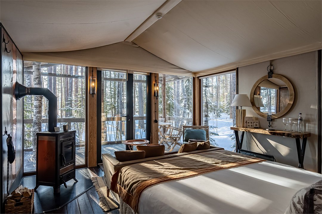 Деревянный лодж с печкой в хвойном лесу. Большая двуспальная кровать и комфортная ванная комната, отдельная гардеробная. Из панорамных окон открывается вид на озеро. Увеличенная терраса с уличной мебелью для завтраков под теплыми лучами солнца и отдыха под открытым небом. Интерьер выполнен в стиле сафари: экологичные материалы, природные фактуры, натуральные цвета и яркие акценты. Размещение: 1-2 гостя. В стоимость проживания включено: завтрак, постельные принадлежности премиум класса, экокосметика, вода, кофе и набор чая, проектор для просмотра фильмов на большом экране — лесной кинотеатр у вас в лодже, дрова для растопки печки. За дополнительную плату можно заказать room-service и кино-сет для просмотра фильмов. Время заезда — с 15:00 Время выезда — до 12:00Услуги и удобства