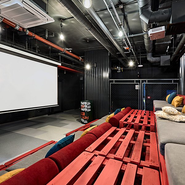 В зале для мероприятий созданы все условия для обеспечения максимального комфорта и функциональности. Он оснащен HD-проектором, музыкальным оборудованием, высокоскоростным Wi-Fi, а также мягкой мебелью, столами, стульями и настольными играми. Интерьер дополняют оригинальные дизайнерские элементы. В распоряжении гостей также находятся санузел и гардероб.