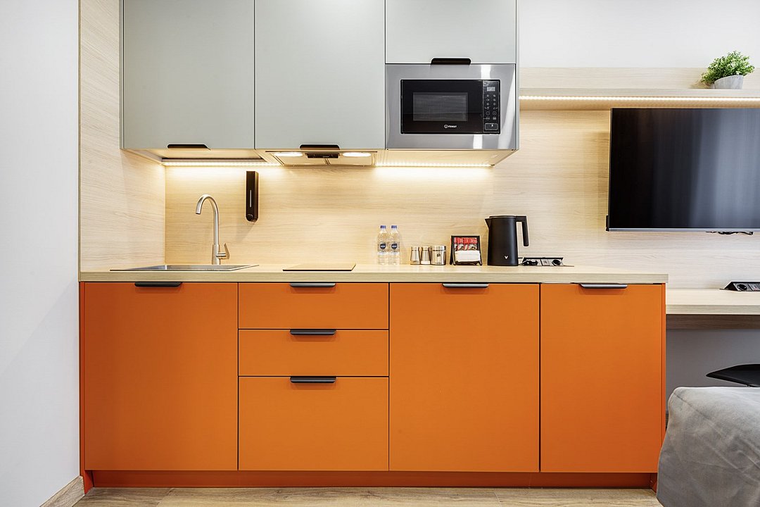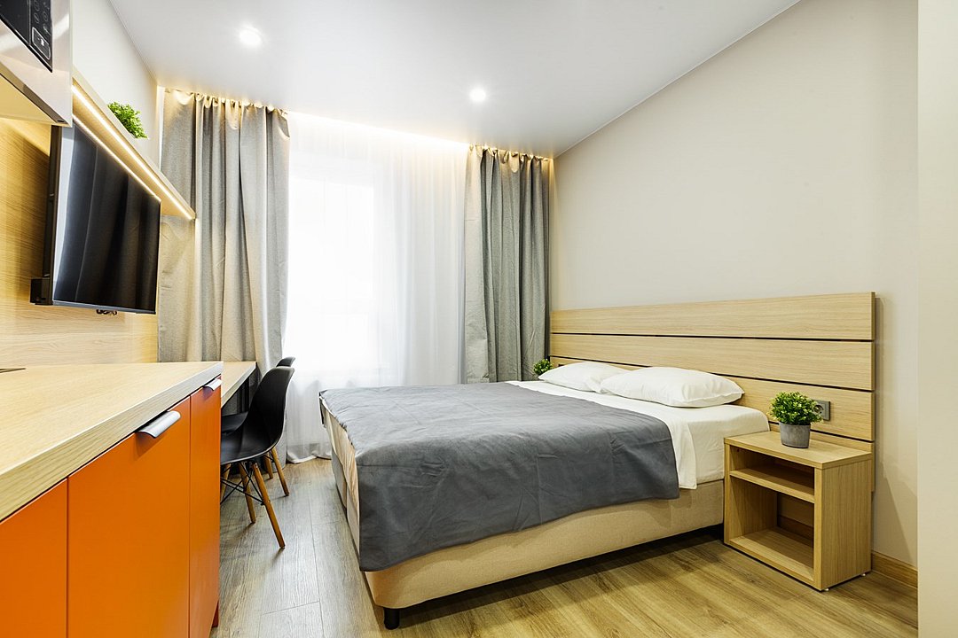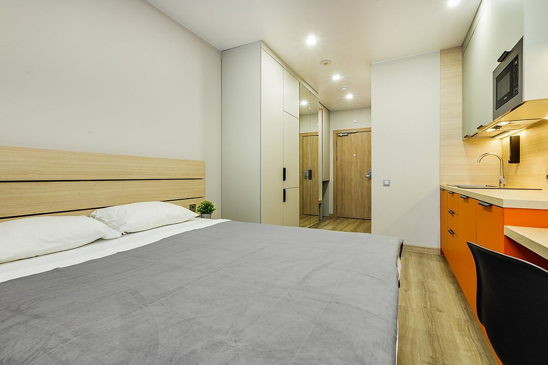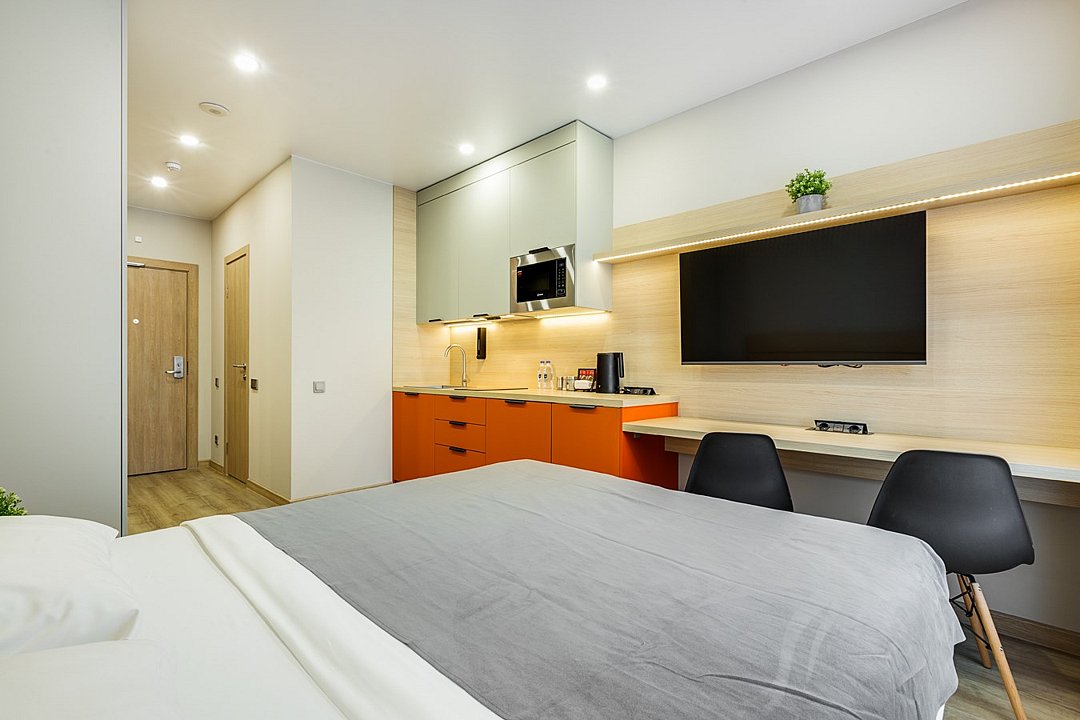 Апартаменты студия бизнес класса в апарт-отеле WELL для комфортного проживания 2x гостей. Современное оснащение номера детально продумано для комфортного проживания и приятной атмосферы.Услуги и удобства