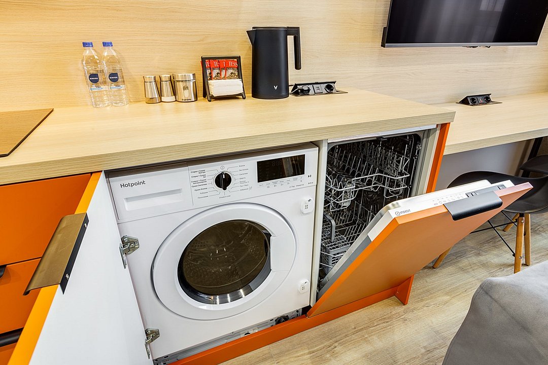 Wi-Fi, интернет, холодильник, фен, электронные замки, плита для приготовления пищи, микроволновая печь, утюг, банные полотенца, тапочки, кровать «Queen size», две односпальные кровати, тумбы, стулья, шкаф для одежды, вешалки, кухня, чайный набор, посудомоечная машина, стиральная машина, чайник, унитаз, раковина, питьевая вода, отопление, душ, вид на город, вид во двор, кухонная посуда, кухонная утварь, столовые приборы, туалет, сушилка для белья, телевизор со Smart TV, номер для некурящих, usb порт, рабочий стол, система умный дом, морозильная камера, фитнес-зона, вид на канал, бутилированная вода, затемняющая штора, зеркало в полный рост, коворкинг, самостоятельная регистрация, тропический душ, Android TVВ апартаментах