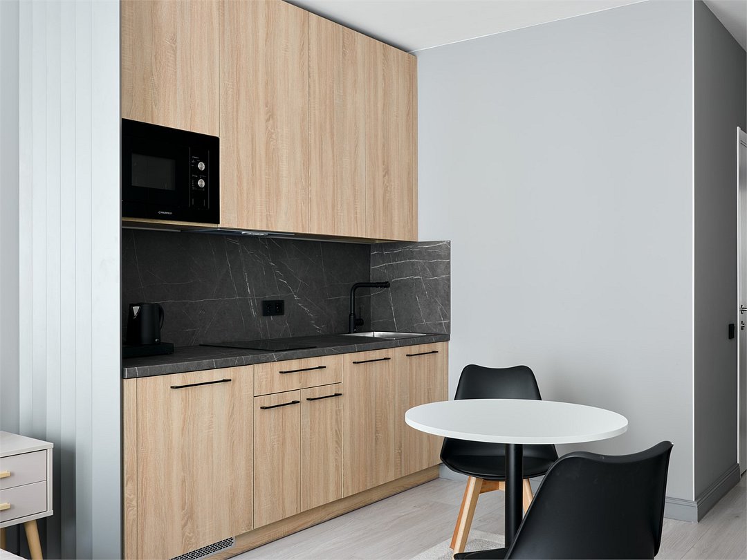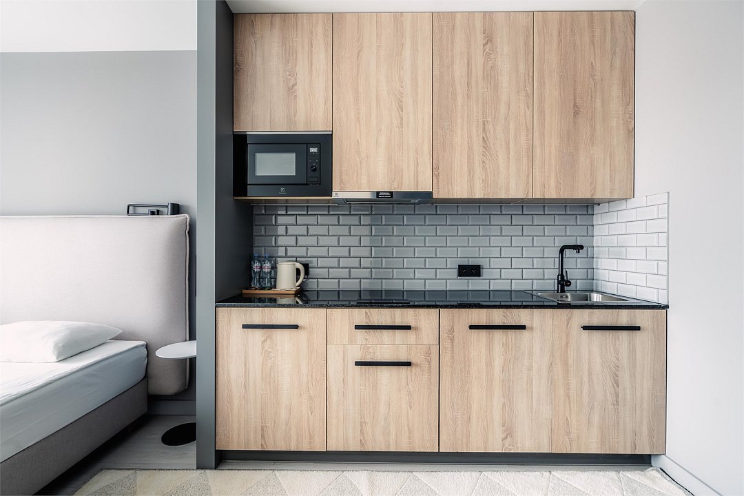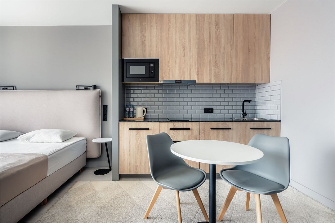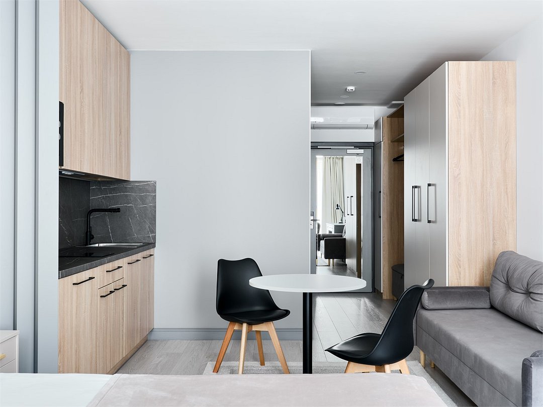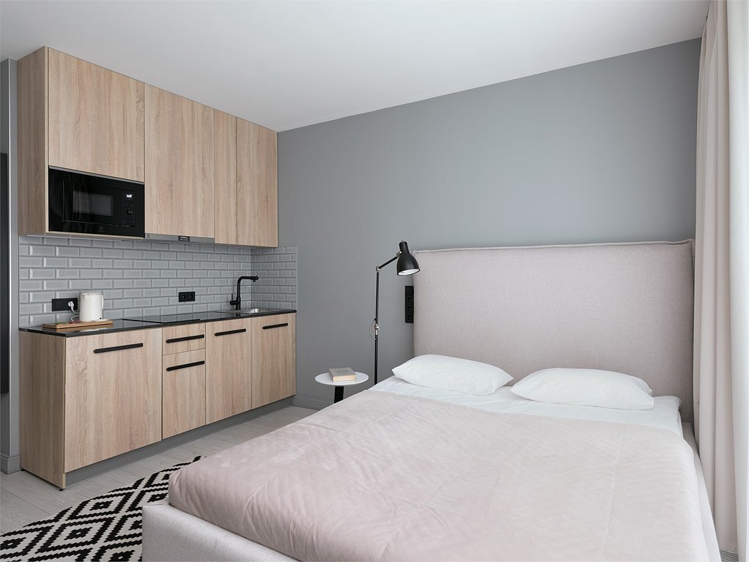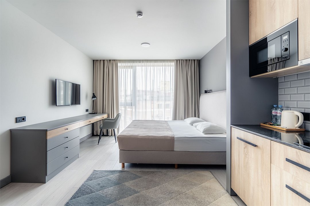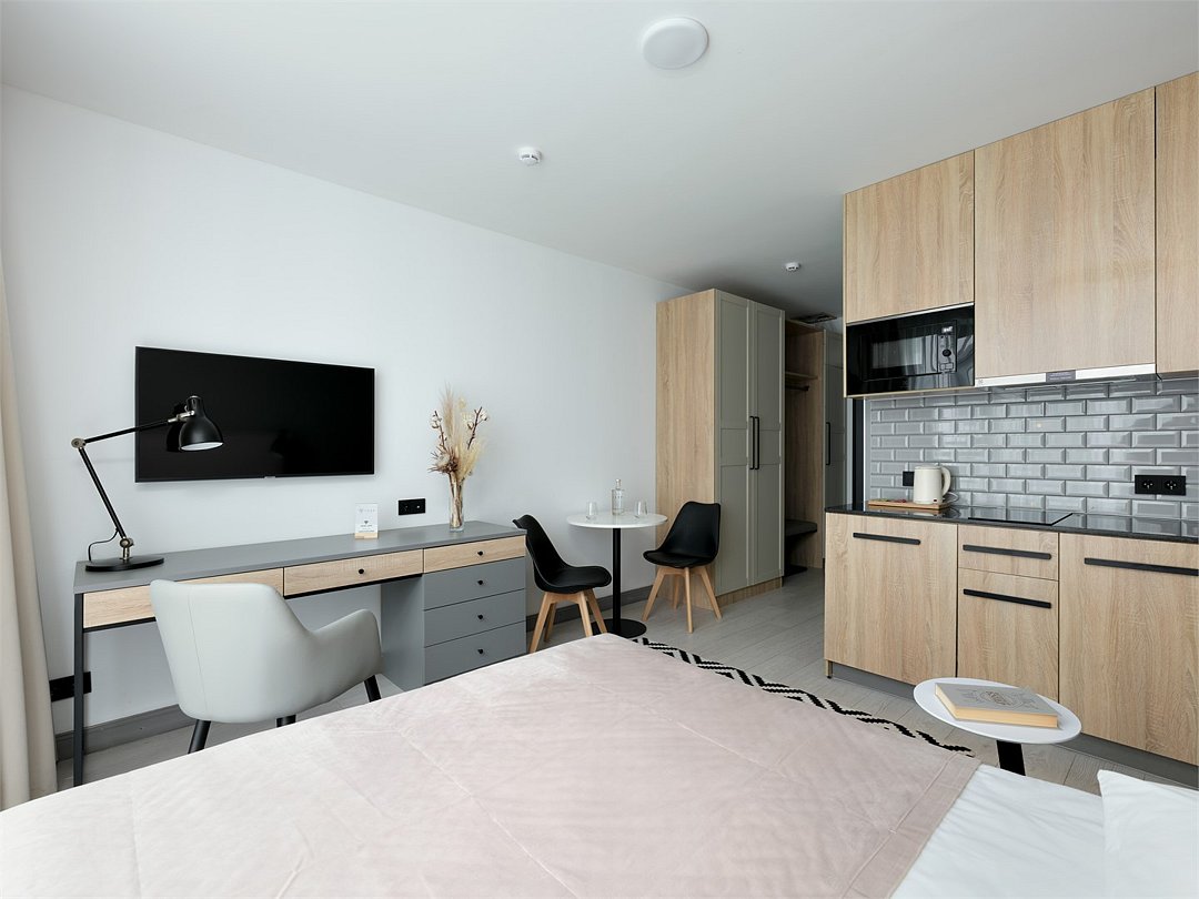 Стильные и уютные номера с кухонным пространством, созданные для вашего комфорта и удобства. Каждый номер оснащен спальной зоной с двуспальной кроватью и идеально оборудованной кухонной зоной. Для Вашего удобства в номере также предусмотрена стиральная машина, что делает пребывание еще более удобным. Этот светлый номер станет идеальным местом как для краткосрочного отдыха, так и для длительного проживания, позволяя вам чувствовать себя как дома.Услуги и удобства
