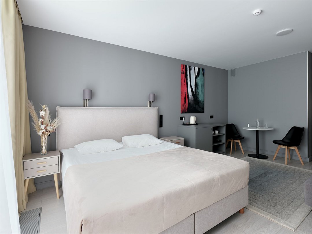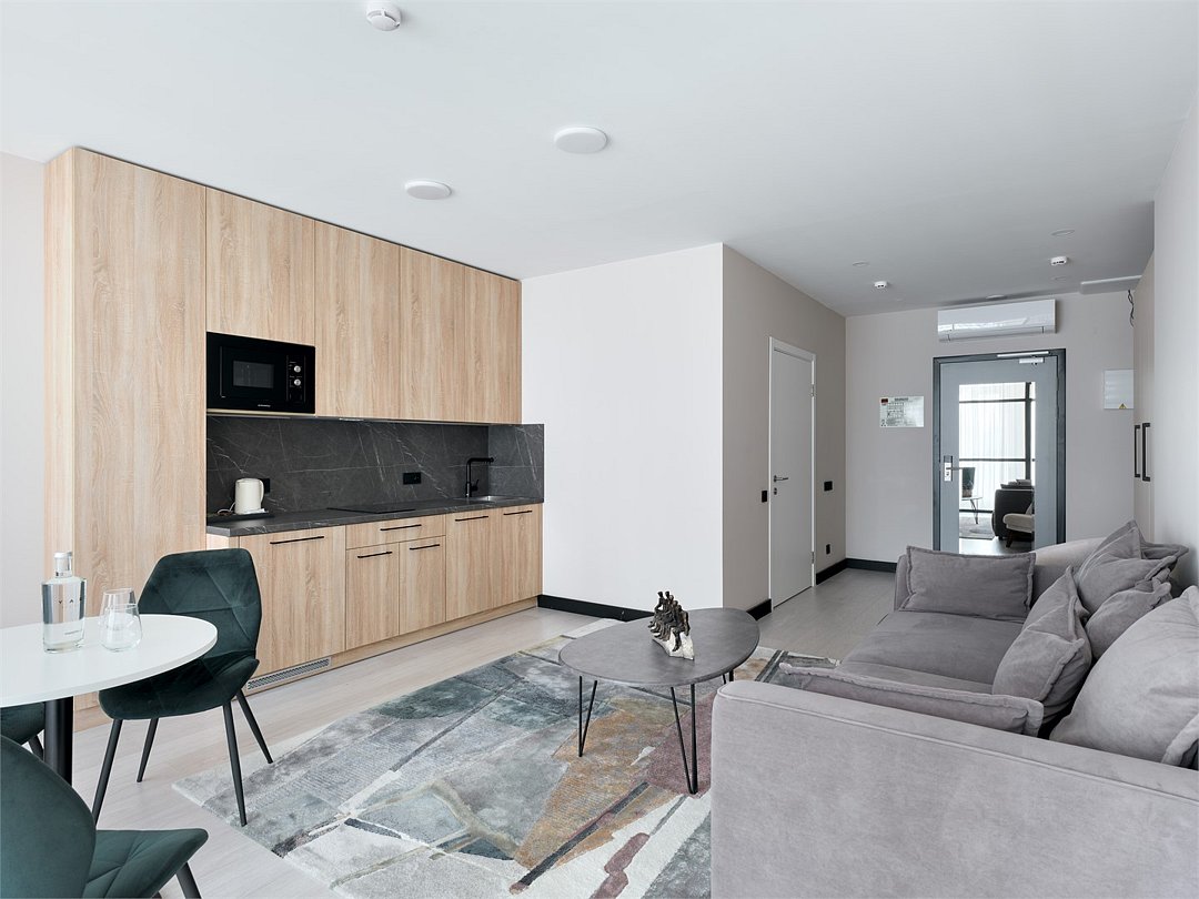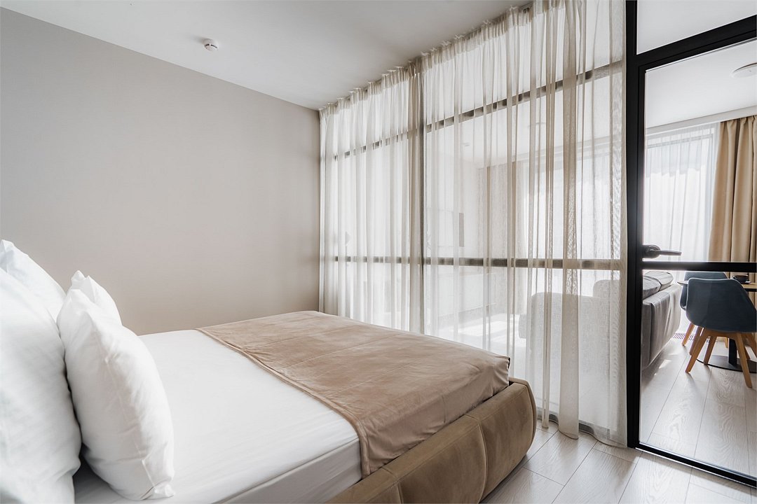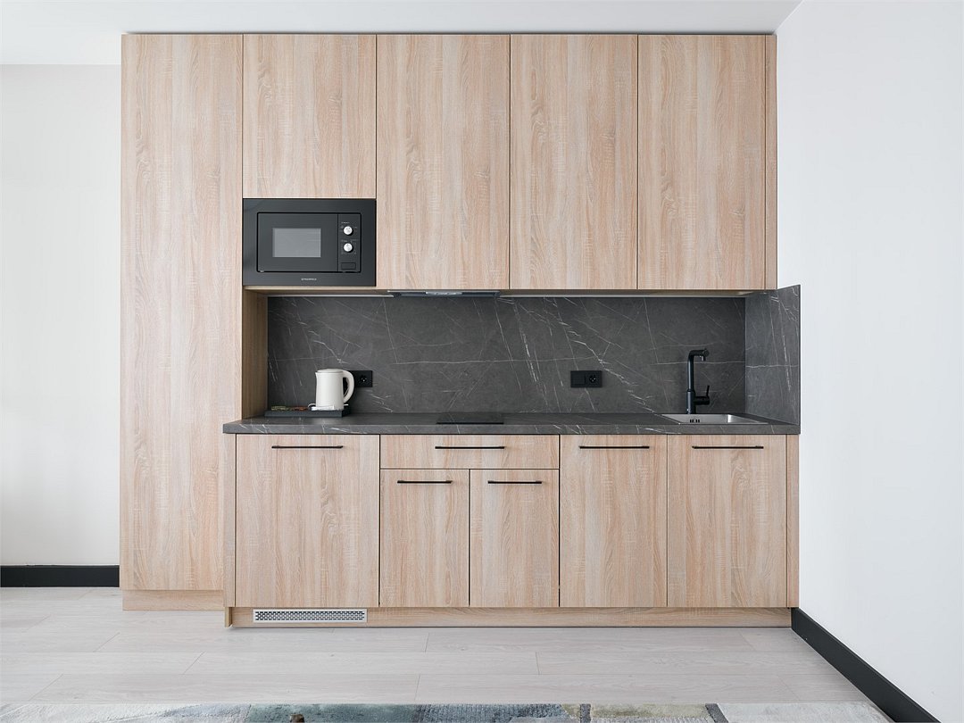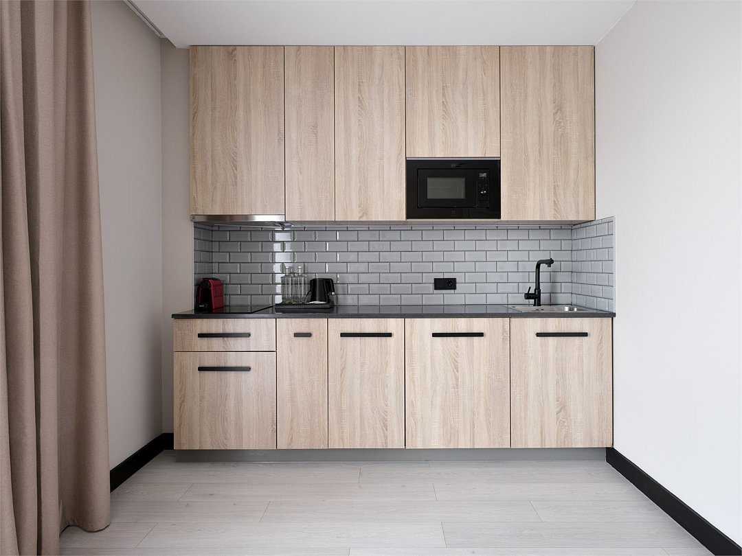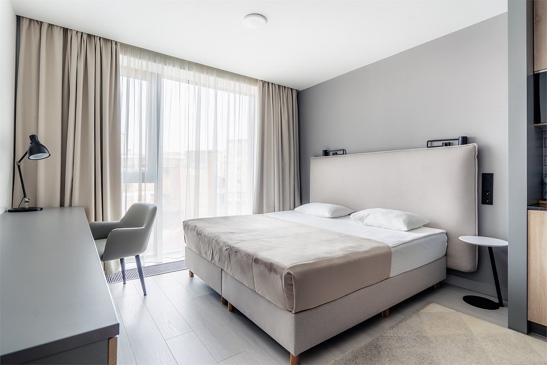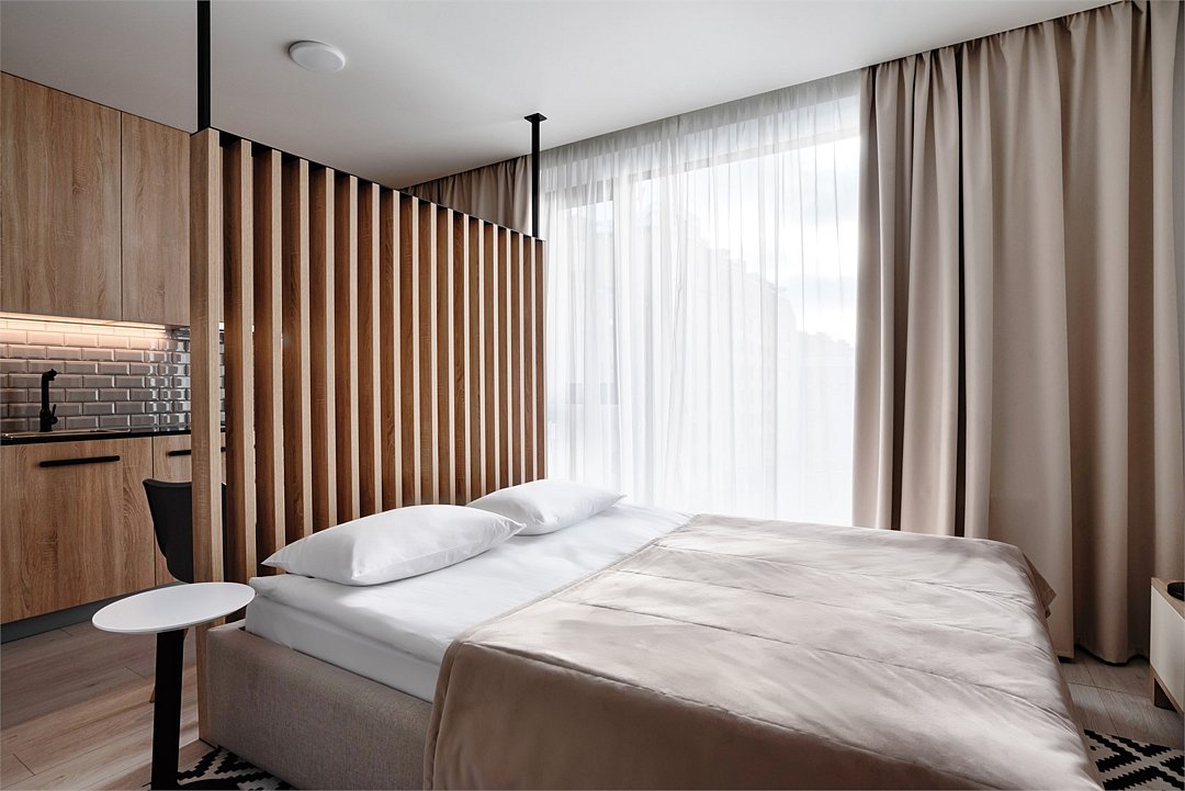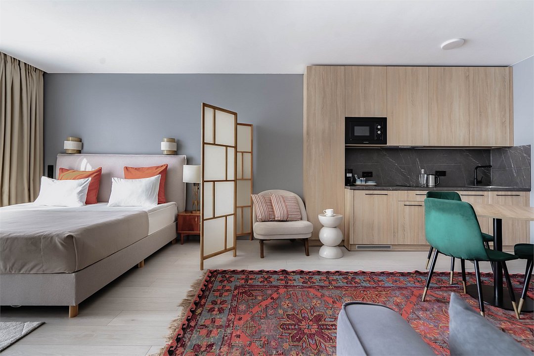 Стильные и уютные номера с кухонным пространством, созданные для вашего комфорта и удобства. Каждый номер оснащен спальной зоной с двуспальной кроватью и идеально оборудованной кухонной зоной. Для Вашего удобства в номере также предусмотрена стиральная машина, что делает пребывание еще более удобным. Этот светлый номер станет идеальным местом как для краткосрочного отдыха, так и для длительного проживания, позволяя вам чувствовать себя как дома.Услуги и удобства