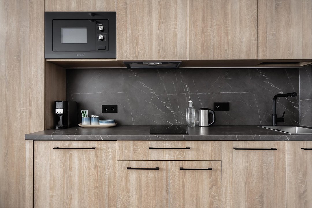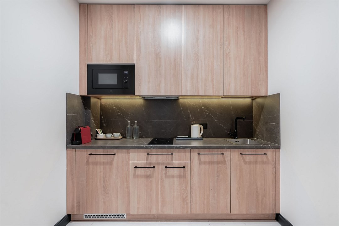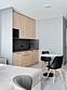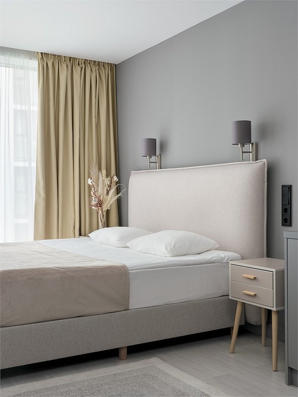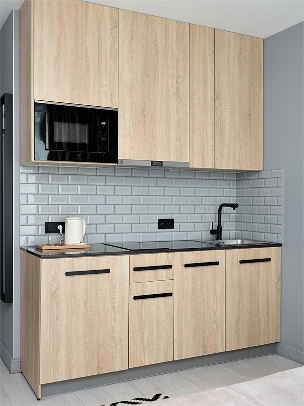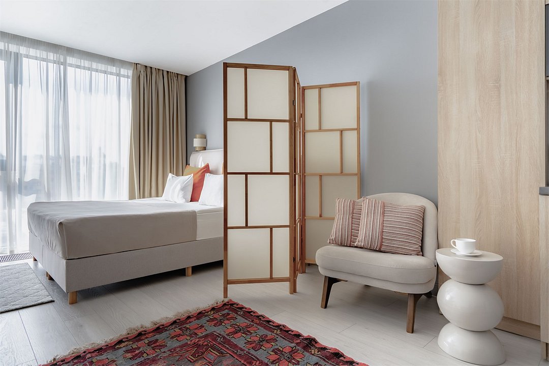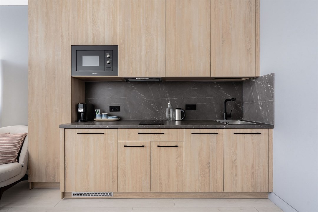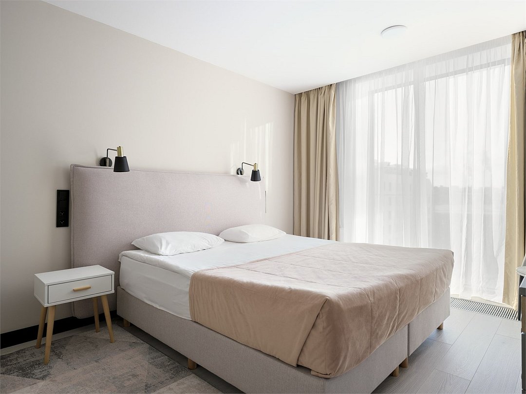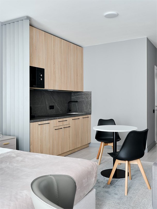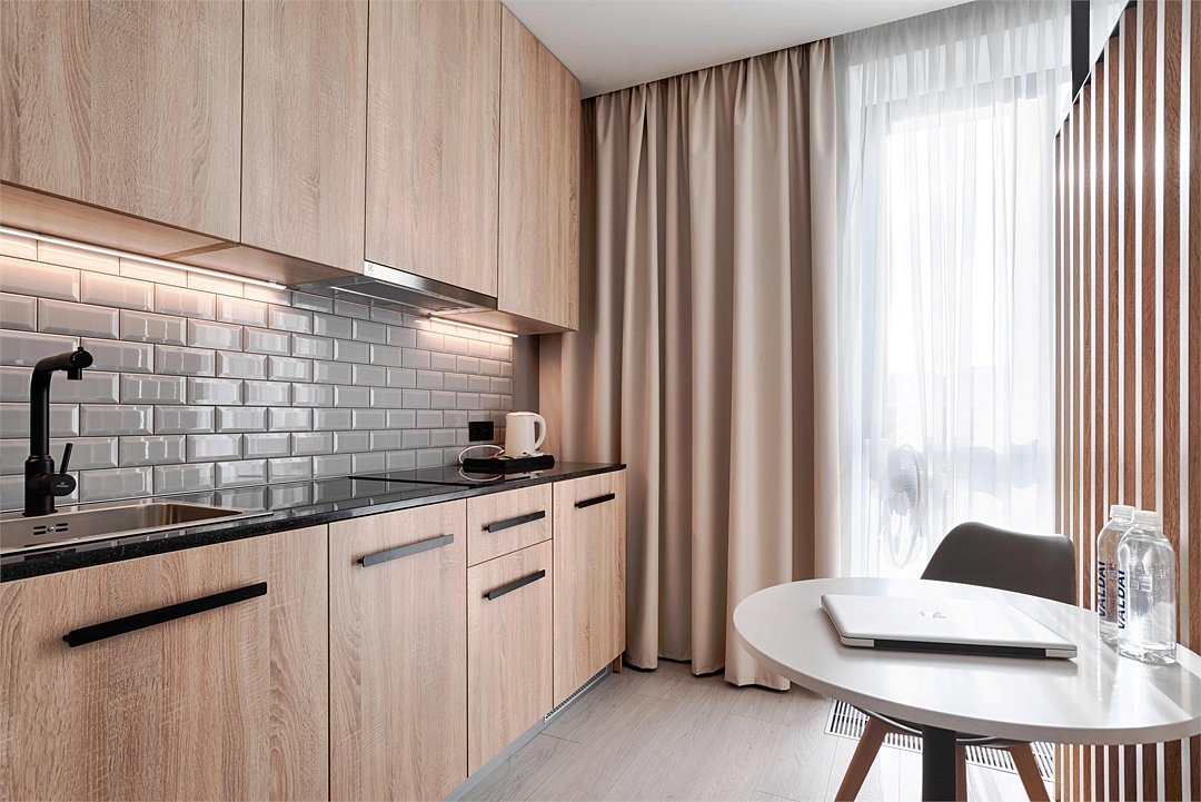 Стильные и уютные номера с кухонным пространством, созданные для вашего комфорта и удобства. Каждый номер оснащен спальной зоной с двуспальной кроватью и идеально оборудованной кухонной зоной. Для Вашего удобства в номере также предусмотрена стиральная машина, что делает пребывание еще более удобным. Этот светлый номер станет идеальным местом как для краткосрочного отдыха, так и для длительного проживания, позволяя вам чувствовать себя как дома.Услуги и удобства