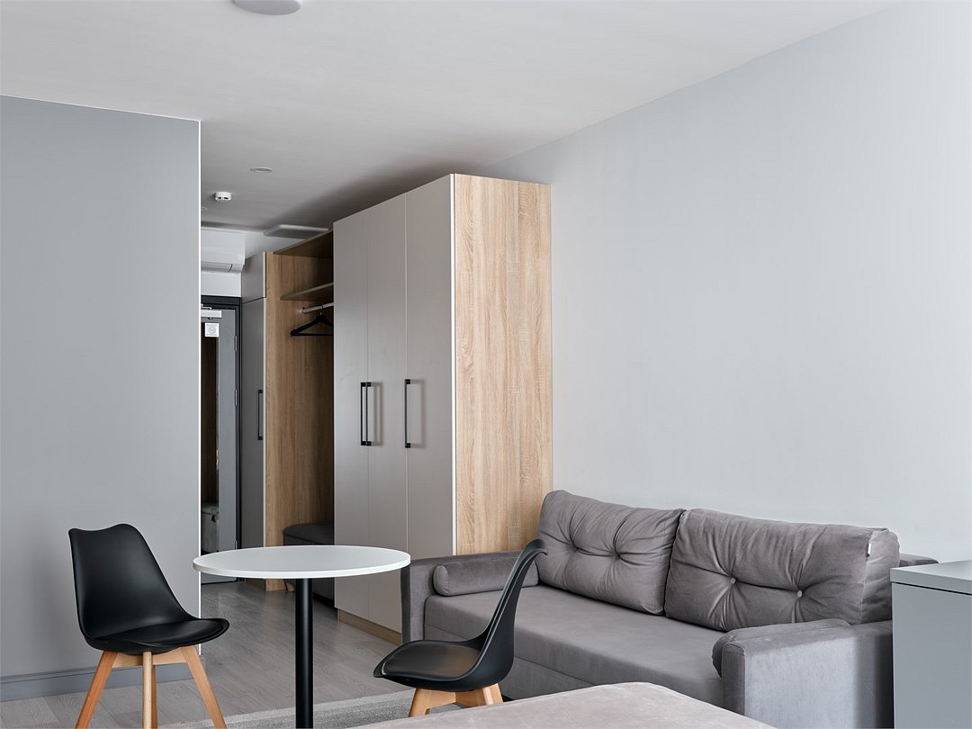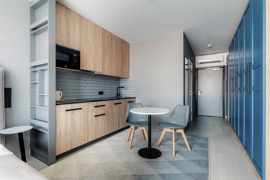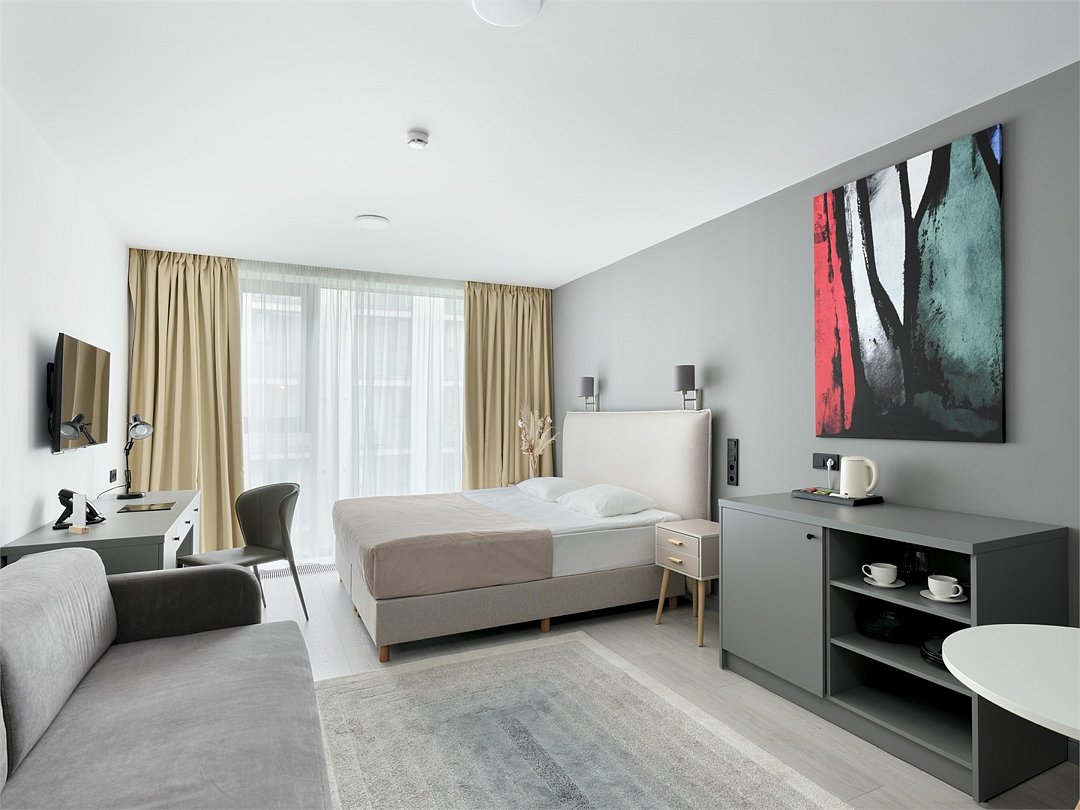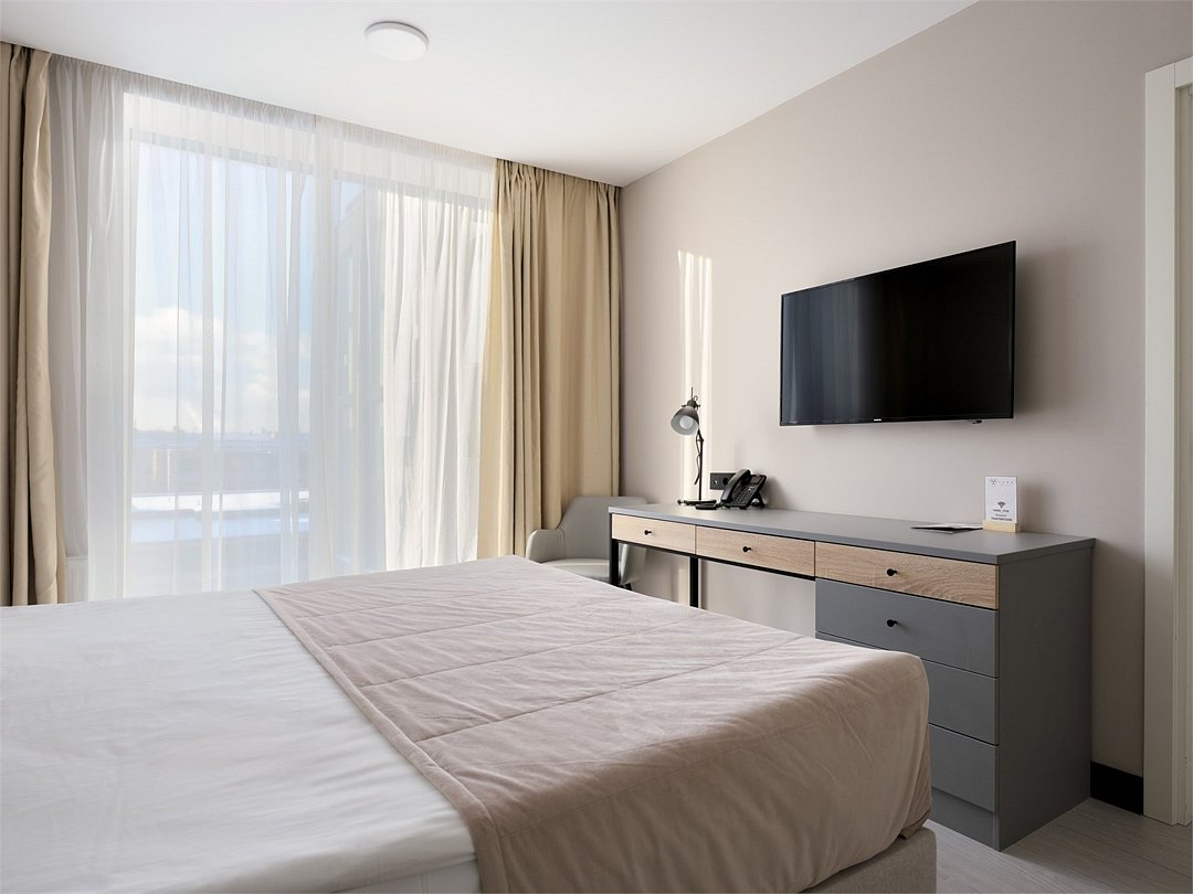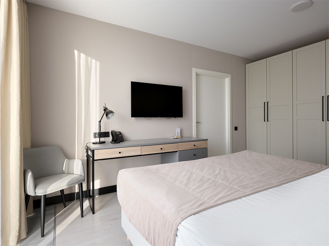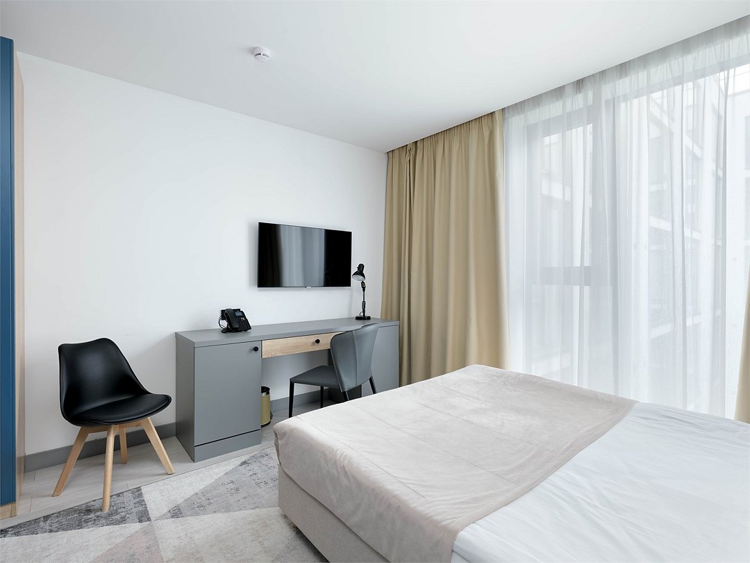 Это идеальное пространство для комфортного проживания, где уют и удобство сочетаются без необходимости в полноценной кухне. В каждом номере удобная двуспальная кровать с высоким ортопедическим матрасом, обеспечивающим расслабляющий и восстанавливающий сон. Каждая деталь отвечает требованиям современного путешественника: фен для ухода за волосами, холодильник для хранения закусок и напитков, гладильные принадлежности для безупречного внешнего вида, а также чайная станция с необходимым набором посуды для наслаждения теплым напитком в любое время. Создайте для себя атмосферу уюта и домашнего комфорта в современном и компактном номере.Услуги и удобства