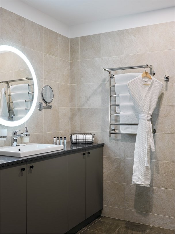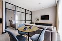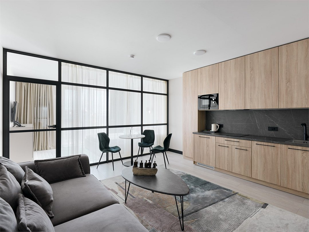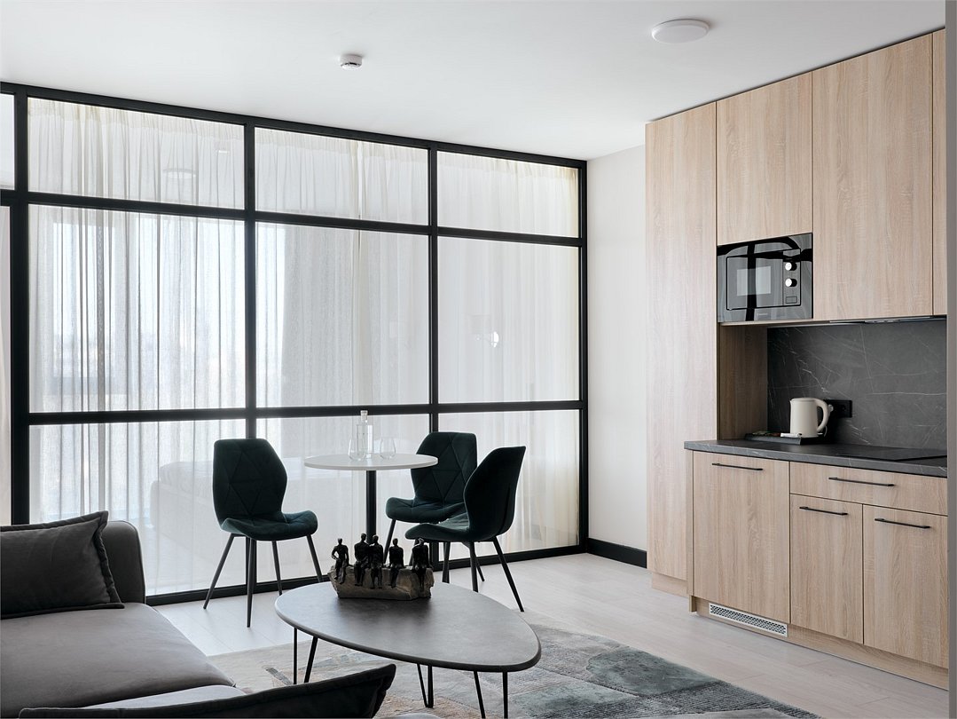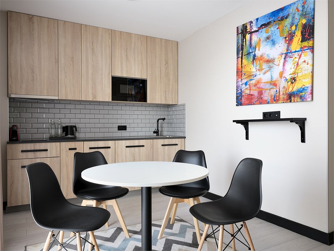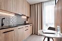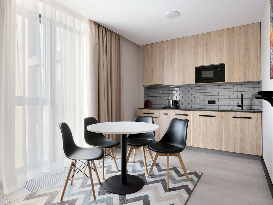 Каждый номер оформлен в светлой, уютной цветовой гамме, создавая атмосферу тепла и уюта. Просторная спальная зона предлагает возможность выбрать между удобной двуспальной кроватью или двумя отдельными кроватями, обеспечивая комфортный отдых. Рабочая зона идеально подходит для восстановления продуктивности, а кухонная часть порадует современным оборудованием: варочной панелью, холодильником и микроволновой печью. Для Вашего удобства здесь также расположены посудомоечная и стиральная машины, а чайная станция с набором посуды позволит наслаждаться горячими напитками в любое время. Отдельная обеденная зона, оформленная стильным столом и стульями, предлагает уютное место для ужинов и общения. Каждый номер данной категории дополнен стиральной машиной и гладильными принадлежностями.Услуги и удобства