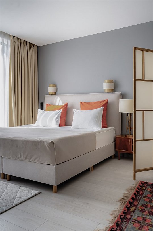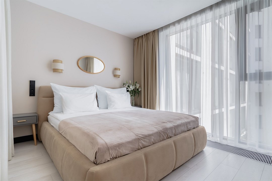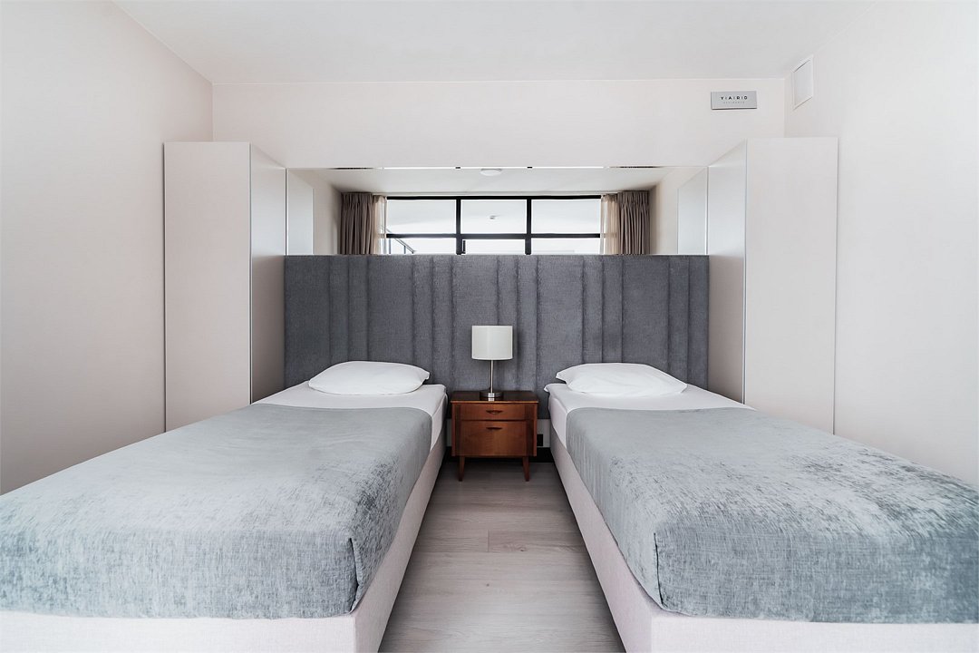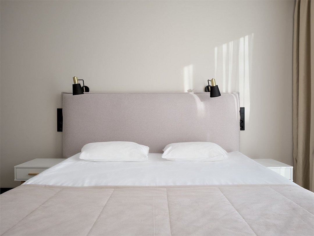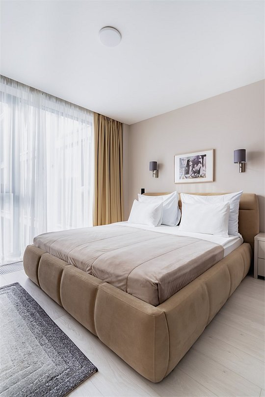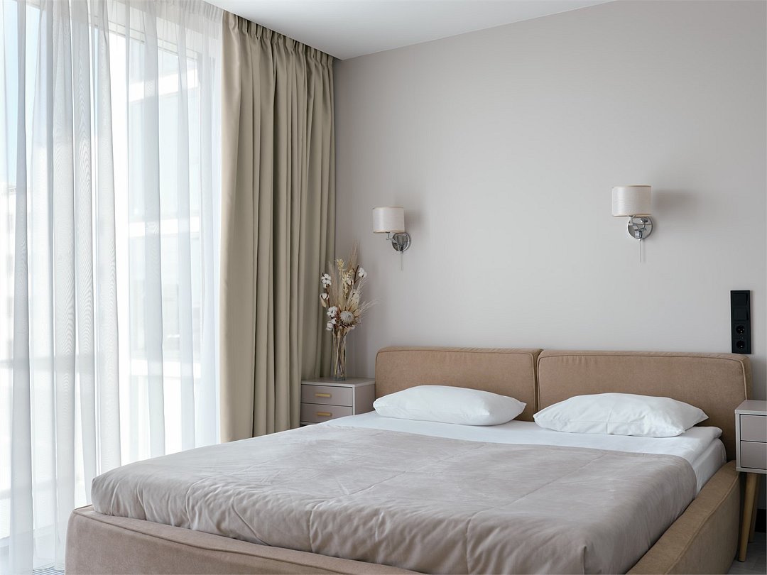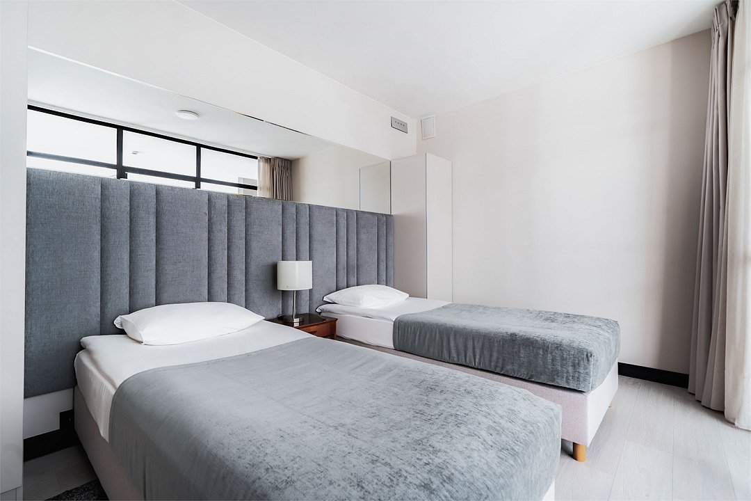 Это самый просторный номер в нашем апарт-отеле, идеально подходящий для семейного отдыха или большой компании. Просторное пространство разделено на несколько уютных зон: главная спальня с роскошной двуспальной кроватью, гостевая — с двумя раздельными кроватями, а также светлая гостиная с мягким, уютным диваном. Входная зона украшена мягким пуфом и современной системой хранения, создавая ощущение домашнего уюта. Стильные картины на стенах добавляют нотки эстетики и искусства, радуя любителей красоты. Дизайн номеров разработан одним из ведущих архитектурных бюро России, что гарантирует гармонию и изысканность каждого элемента интерьера.Услуги и удобства