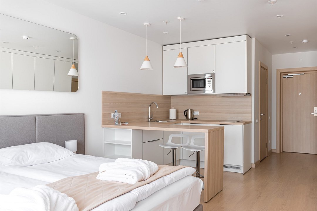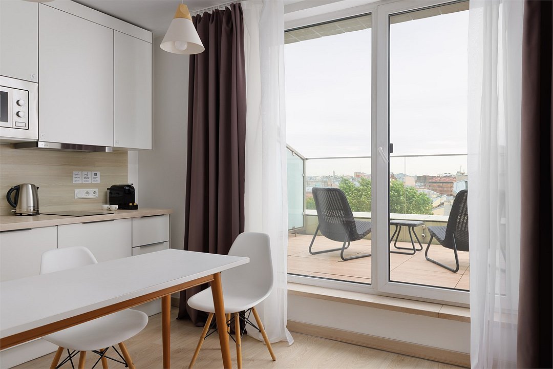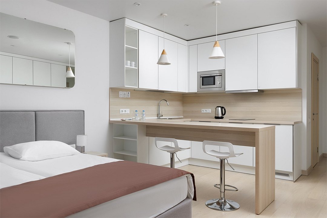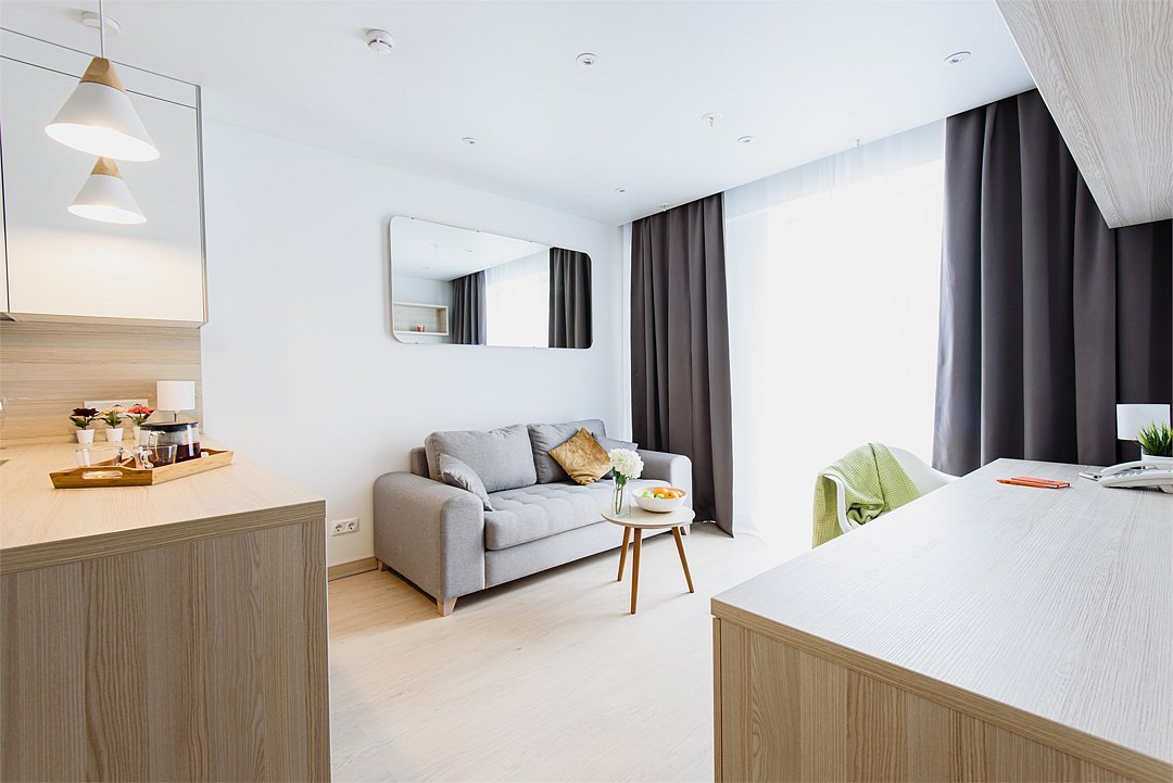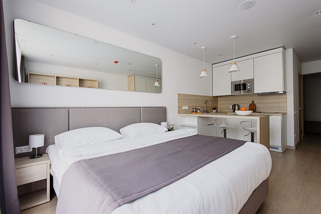 Однокомнатный апартамент с большой террасой. Апартамент разделен на все две зоны: спальную и гостиную. Из гостиной выход на большую террасу. Окна номера выходят на улицу. Апартамент оснащен: одной большой кроватью, рабочей зоной с письменным столом, полностью оборудованной кухней. В каждом апартаменте есть кофемашина с набором капсул на 2-х гостей (предоставляется единоразово при заселении). Обращаем Ваше внимание, что халаты предоставляются бесплатно по запросу. При выборе размещения ребенка без отдельного спального места постельное белье, полотенца, косметические средства дополнительно не предоставляются.Услуги и удобства