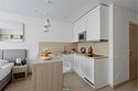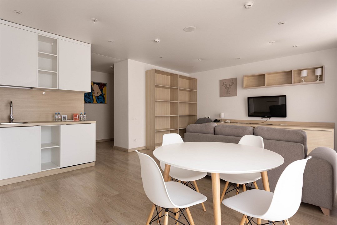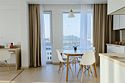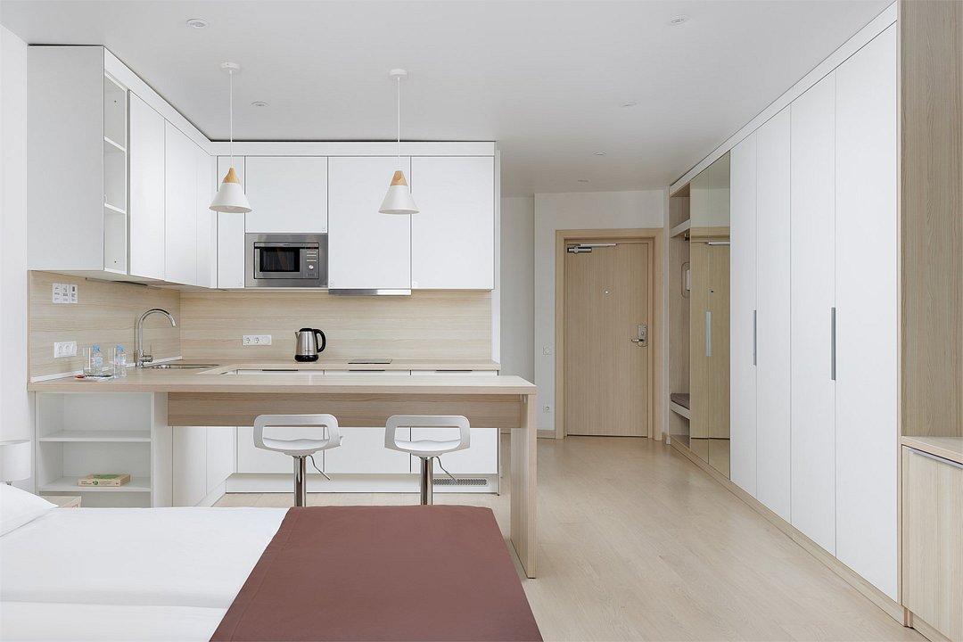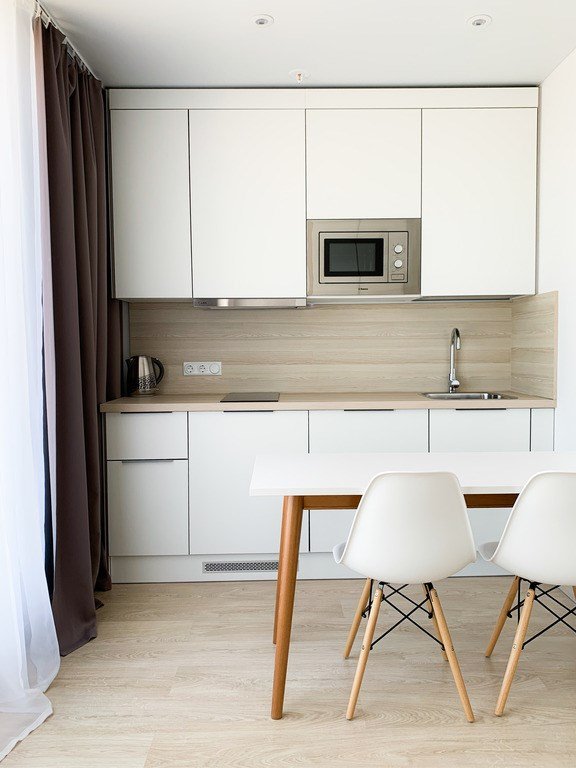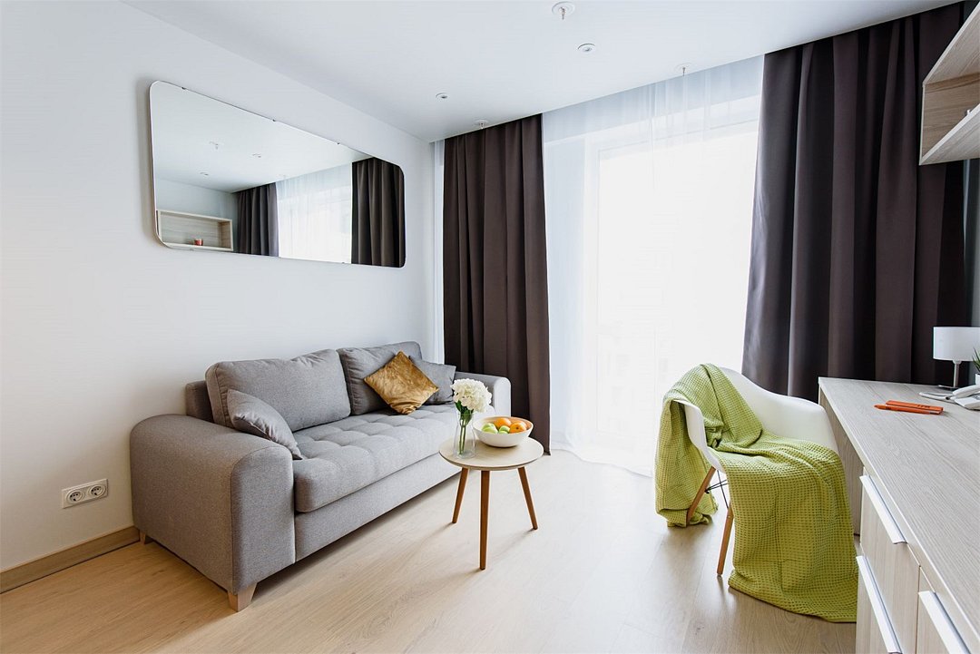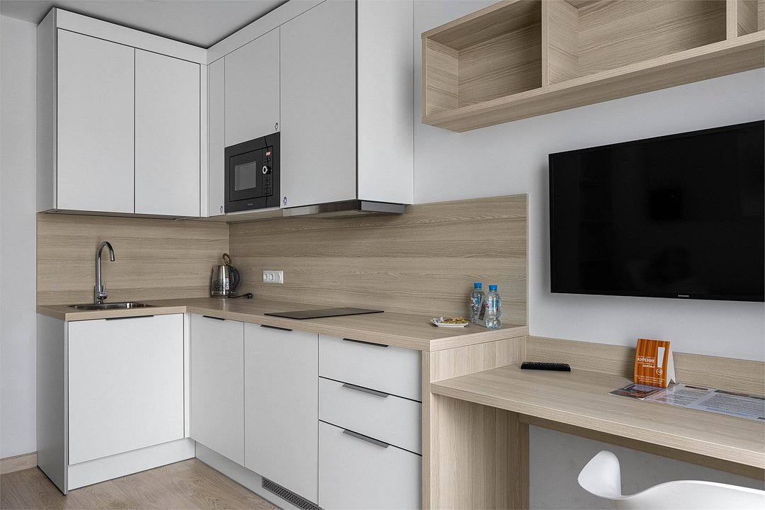 Однокомнатный апартамент с большой террасой. Апартамент разделен на все две зоны: спальную и гостиную. Из гостиной выход на большую террасу. Окна номера выходят на улицу. Апартамент оснащен: одной большой кроватью, рабочей зоной с письменным столом, полностью оборудованной кухней. В каждом апартаменте есть кофемашина с набором капсул на 2-х гостей (предоставляется единоразово при заселении). Обращаем Ваше внимание, что халаты предоставляются бесплатно по запросу. При выборе размещения ребенка без отдельного спального места постельное белье, полотенца, косметические средства дополнительно не предоставляются.Услуги и удобства