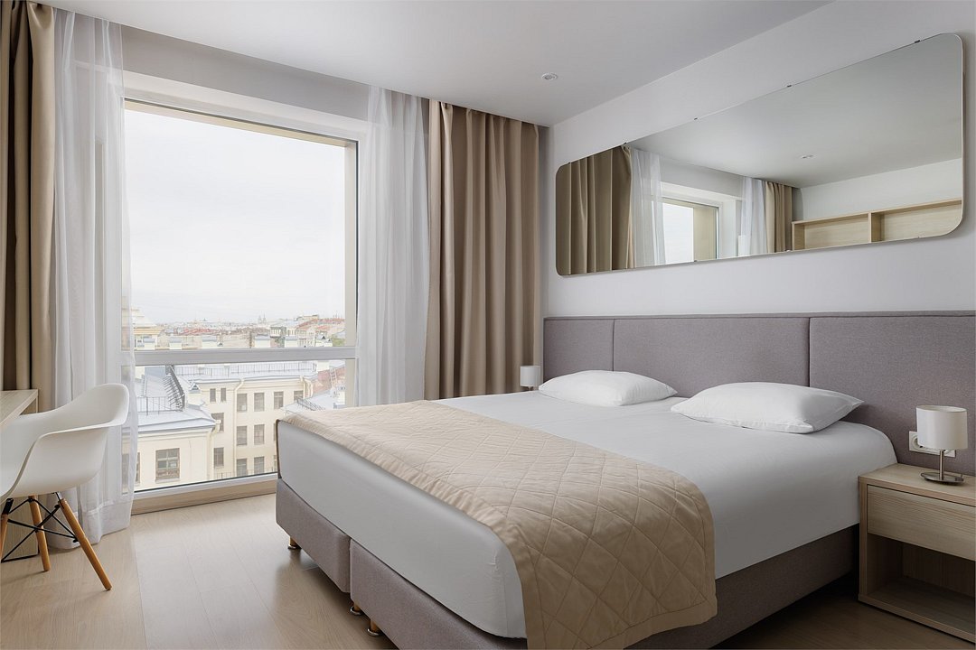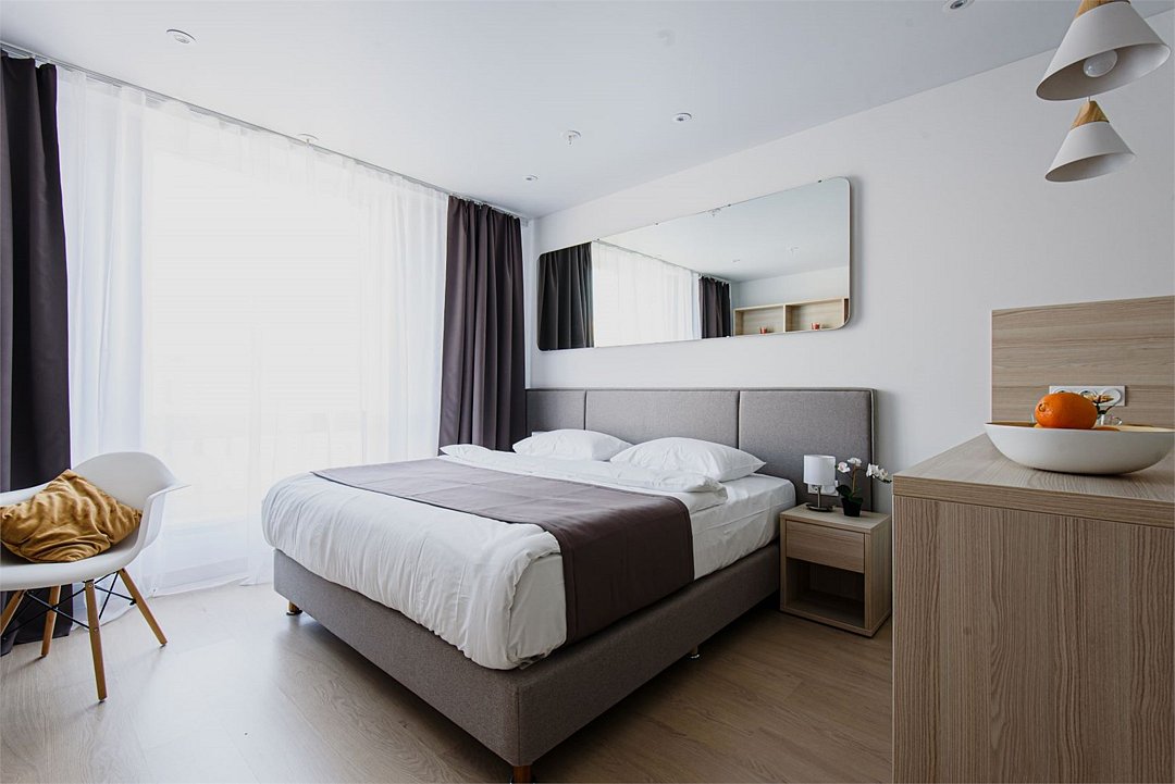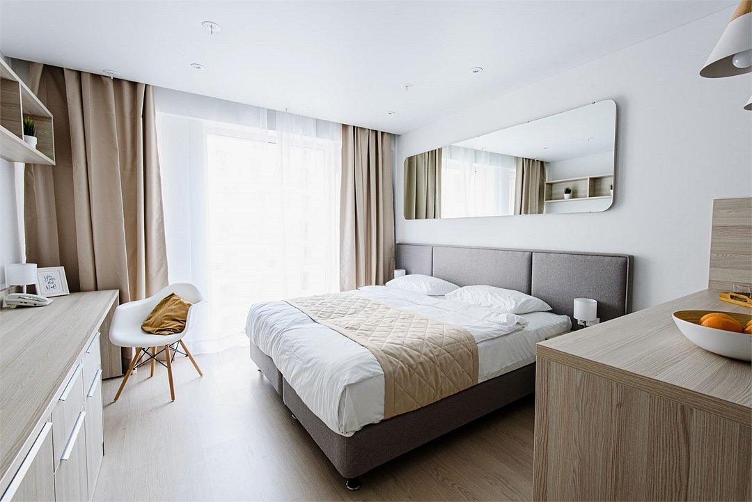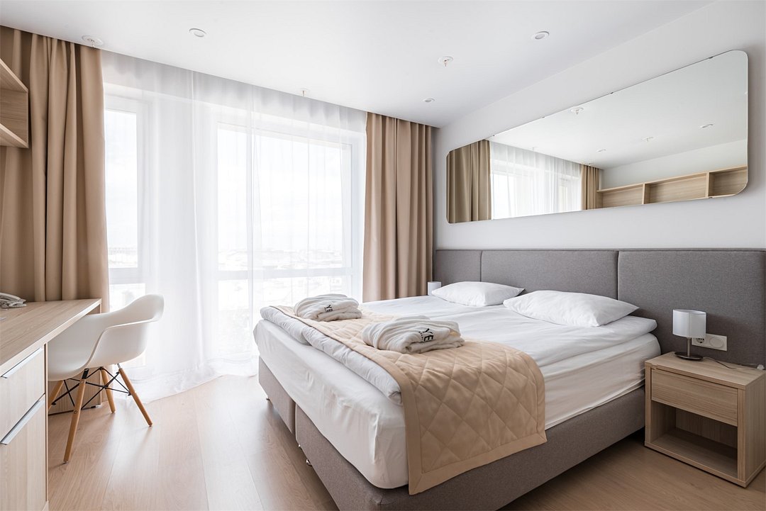 Апартамент категории "Стандарт" с одной большой кроватью и видом на город. Апартаменты расположены на 8 и 9 этажах. Из окон открывается панорамный вид на основные доминанты города. Обращаем Ваше внимание, что халаты предоставляются бесплатно по запросу. При выборе размещения ребенка без отдельного спального места предоставляются только косметические средства и полотенца.Услуги и удобства