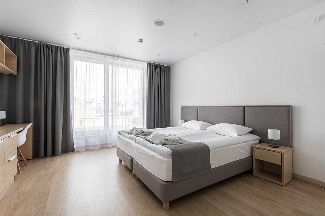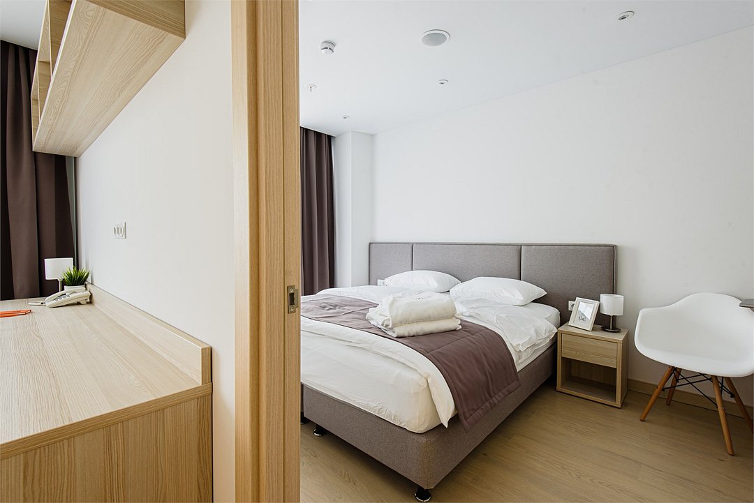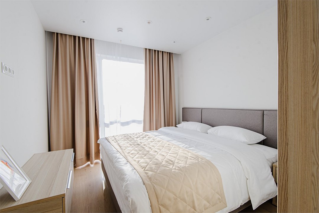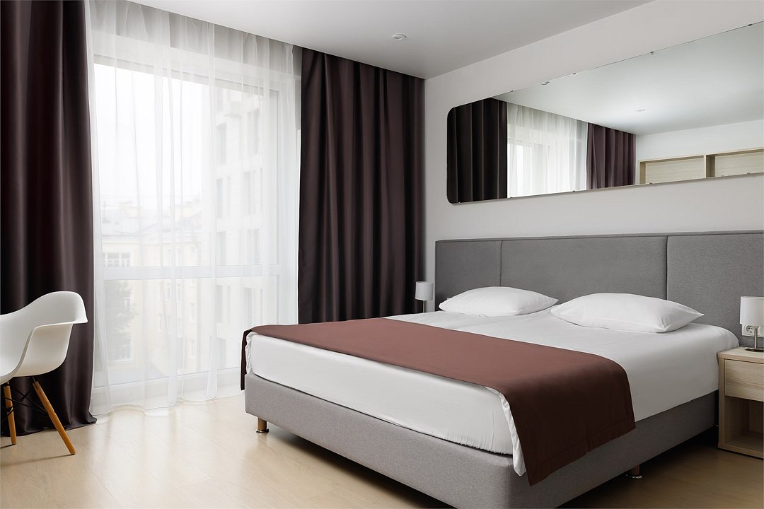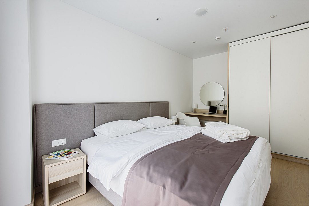 Апартамент категории "Стандарт" с одной большой кроватью и видом на город. Апартаменты расположены на 8 и 9 этажах. Из окон открывается панорамный вид на основные доминанты города. Обращаем Ваше внимание, что халаты предоставляются бесплатно по запросу. При выборе размещения ребенка без отдельного спального места предоставляются только косметические средства и полотенца.Услуги и удобства
