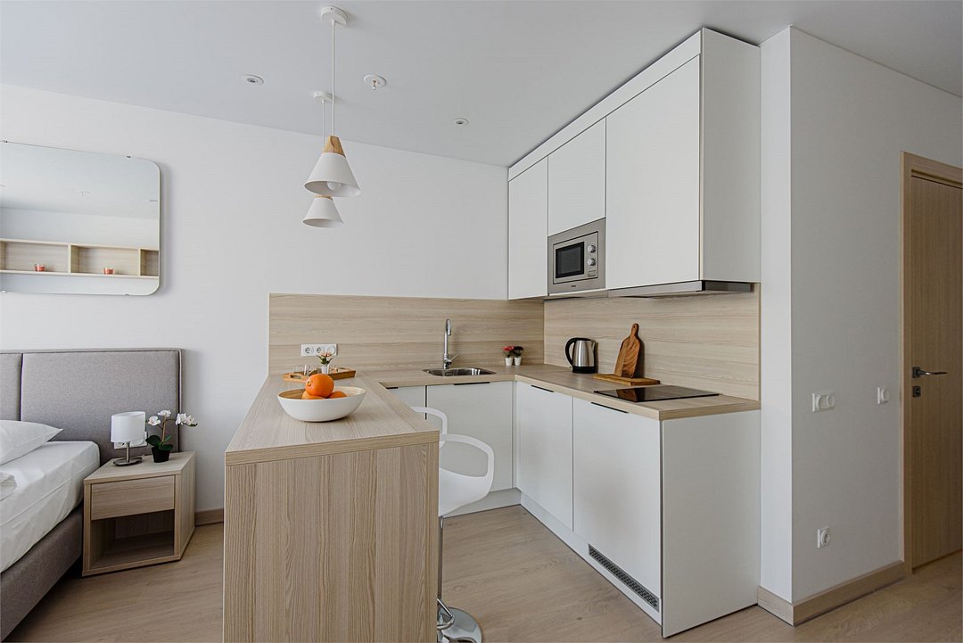 Эти стильные апартаменты-студия созданы для вашего удобства: 1. Идеальный вариант для 1-2 гостей 2. Удобный диван-кровать (120×200 см) для комфортного сна 3. Практичная рабочая зона с письменным столом 4. Полностью оборудованная кухня со всем необходимым Дополнительные удобства: 1. Бесплатная детская кроватка для малышей до 3 лет 2. Мягкие халаты по запросу Интерьер выполнен в спокойных нейтральных тонах, создающих атмосферу уюта и расслабления. Важно: Фактическая комплектация может отличаться от представленной на фото (барная стойка может отсутствовать). Отличный выбор как для деловой поездки, так и для комфортного отдыха!Услуги и удобства