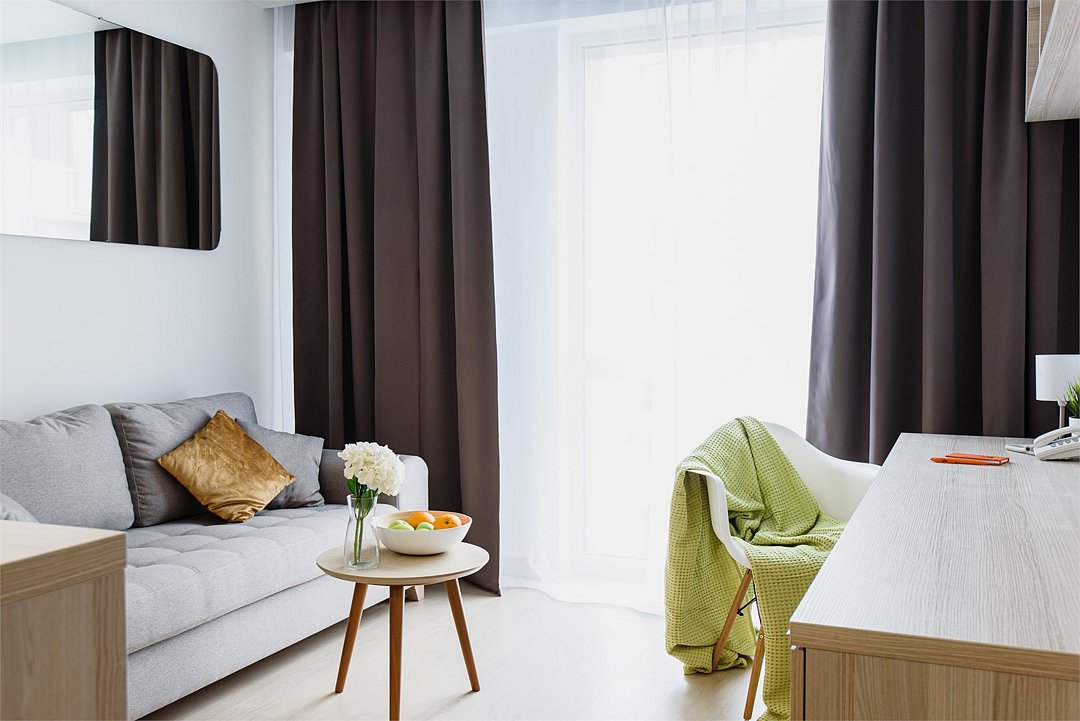Апартаменты категории "Терраса Люкс" площадью от 48 до 60 кв.м. Главной особенностью данного номера является наличие большой террасы с прекрасным панорамным видом на город. На террасе есть мебель для отдыха. Номер двухкомнатный идеально подходит для размещение семьи. Терраса Люкс имеют удобное зонирование для отдыха до 4-х человек: отдельную спальную комнату, кухню-гостиную с диваном и гардеробную зону. В каждом апартаменте есть кофемашина с набором капсул на 4-х гостей (предоставляется единоразово при заселении). Планировка и зонирование могут отличаться в разных апартаментах данной категории. В некоторых апартаментах данной категории два санузла. Обращаем Ваше внимание, что халаты предоставляются бесплатно по запросу. По запросу предоставляется детская кровать для ребенка до 3 лет. Услуга предоставляется бесплатно. Дополнительно предоставляется дополнительной место (еврораскладушка). Услуга платная. - при выборе размещения ребенка без отдельного спального места постельное белье, полотенца, косметические средства дополнительно не предоставляются. - просим обратить внимание, что в данной категории размещение с животными запрещено.Услуги и удобства