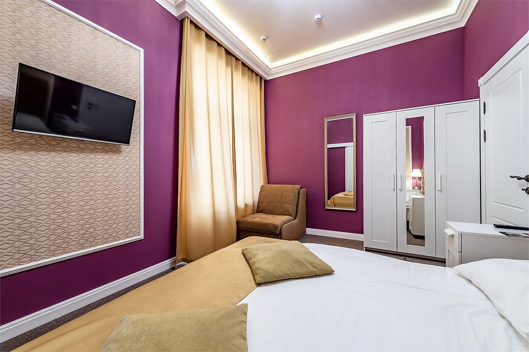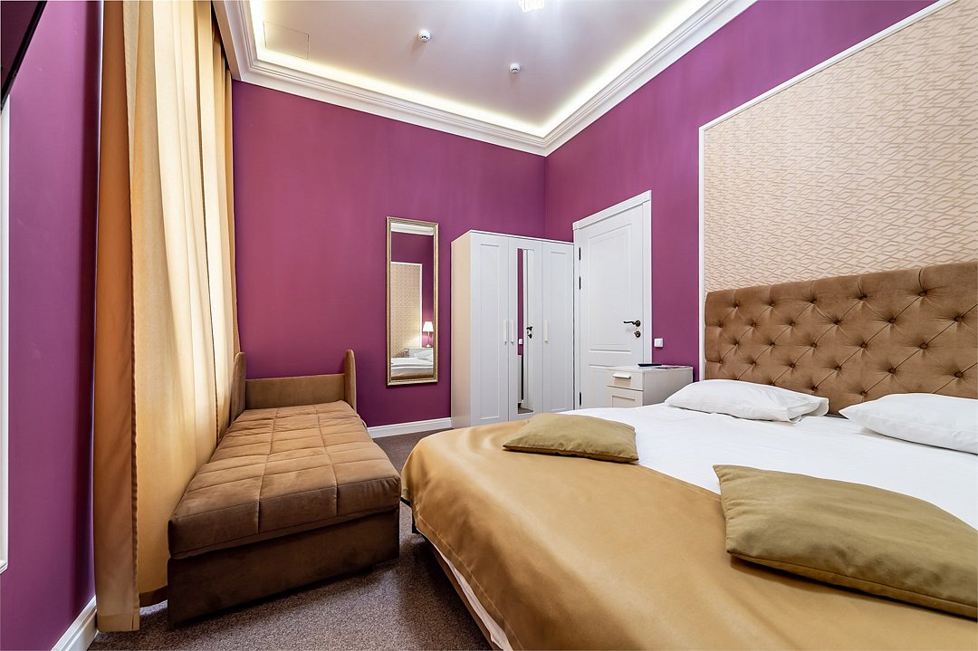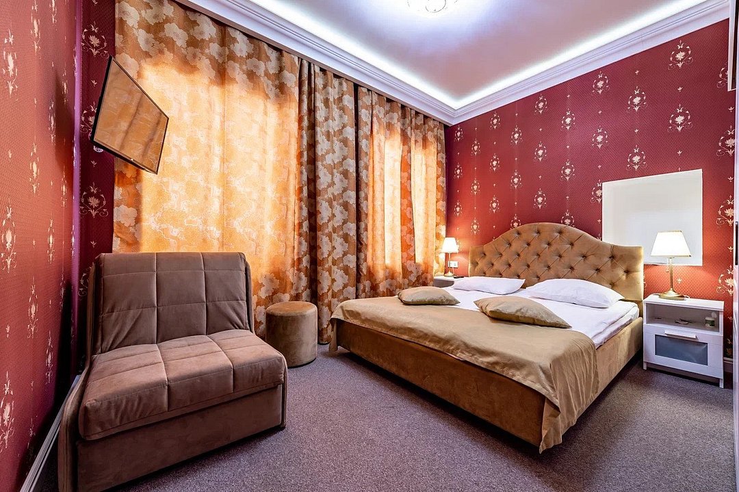 Просторный уютный номер с дизайнерским ремонтом, оснащенный всеми современными удобствами с возможностью размещения 3-го человека на дополнительном спальном месте. Для комфортного сна предусмотрена удобная кровать, для третьего человека предоставляется кресло-кровать. Качественное постельное белье и непрозрачные шторы блэкаут. Ванная комната с душем, туалетно-косметические принадлежности, полотенца, тапочки, фен. Так же в номере телевизор с плоским экраном.Услуги и удобства