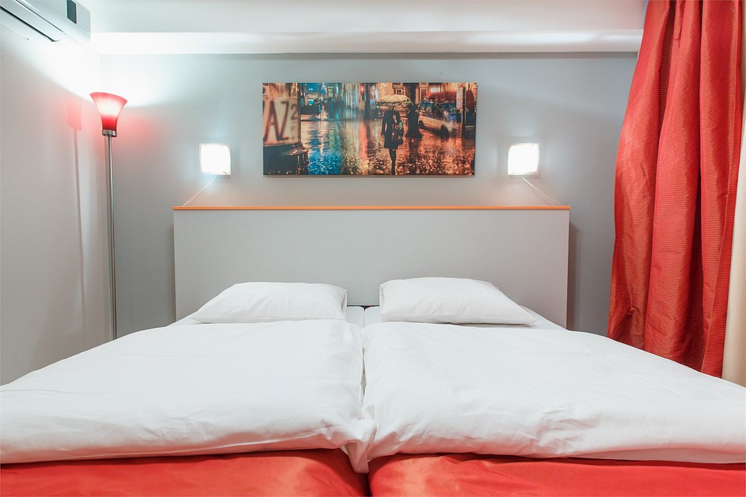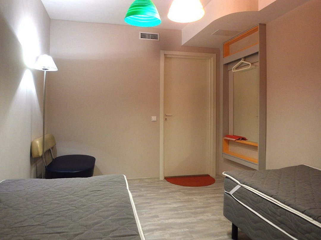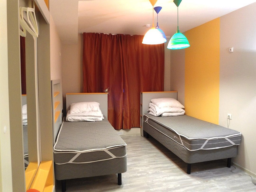 Небольшой номер, в котором находятся две односпальные кровати с ортопедическими матрасами. Номер оборудован минимальным климатическим оборудованием. В номере также есть небольшой диванчик, вешалка для верхней одежды и зеркало, все удобства на этаже. На всей территории отеля бесплатный Wi-Fi интернетУслуги и удобства