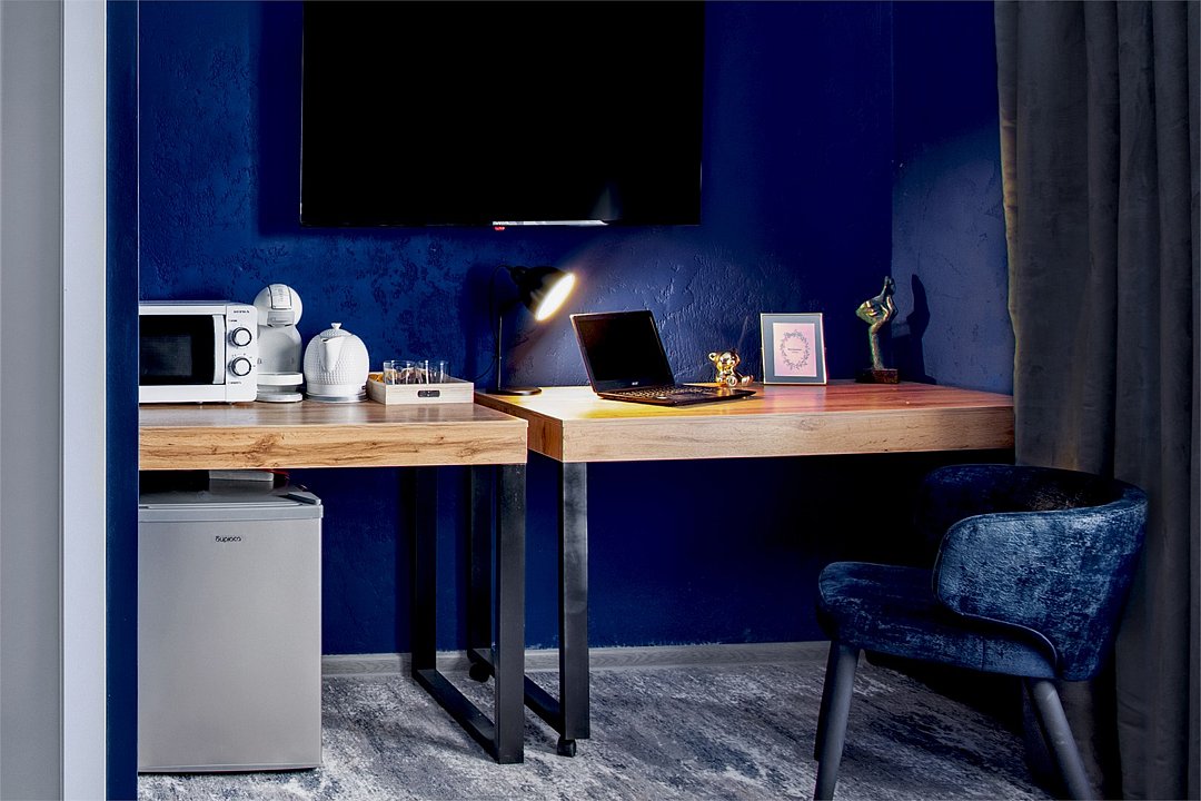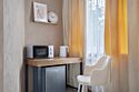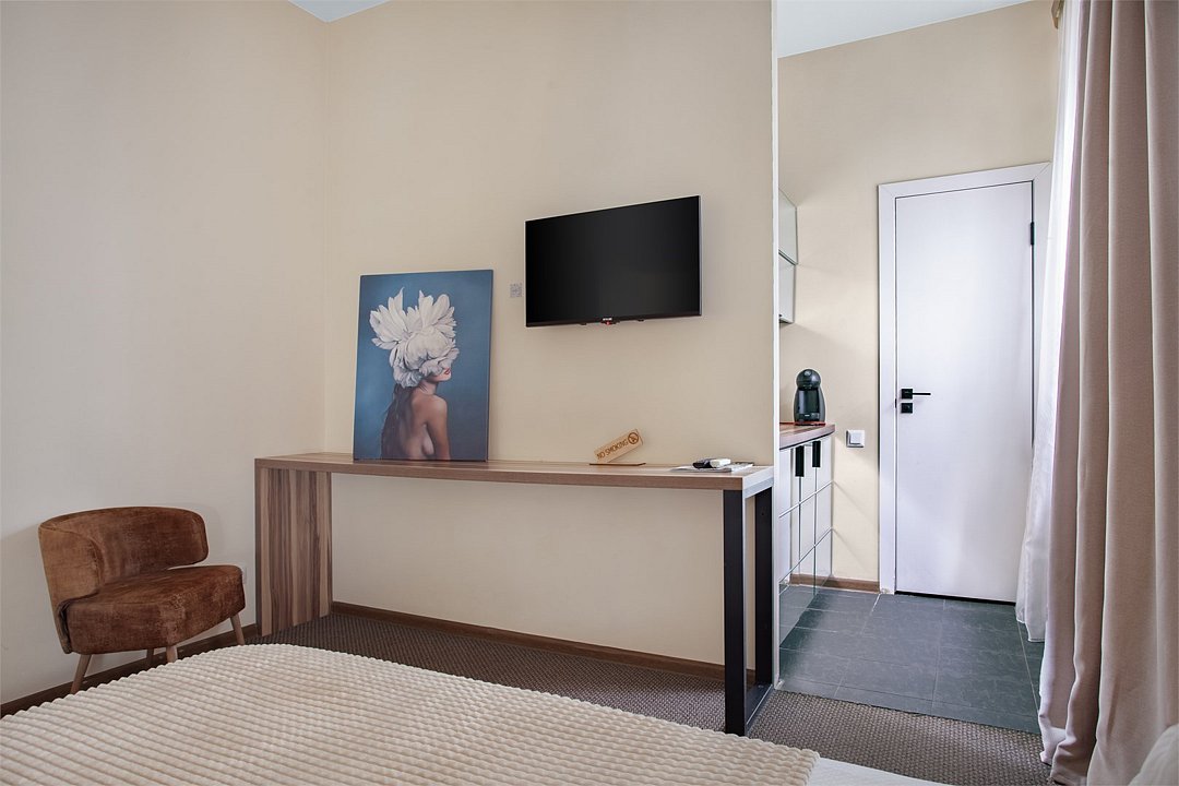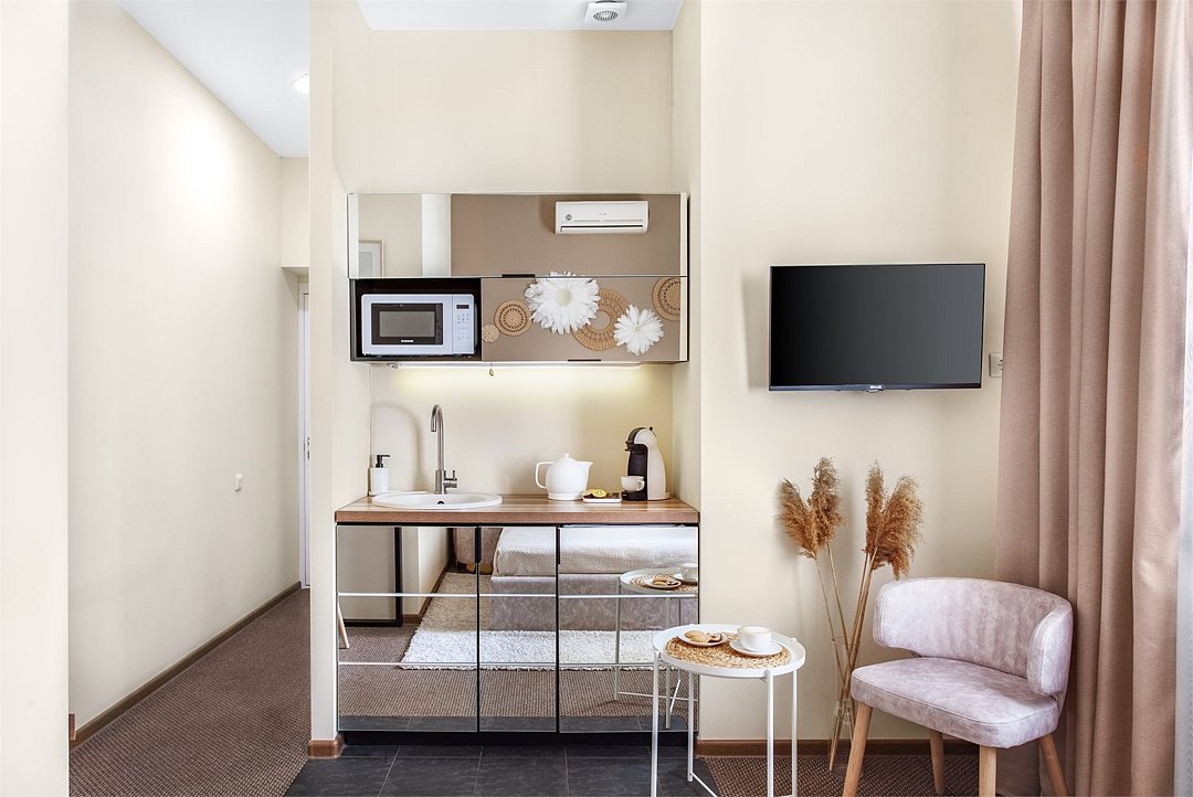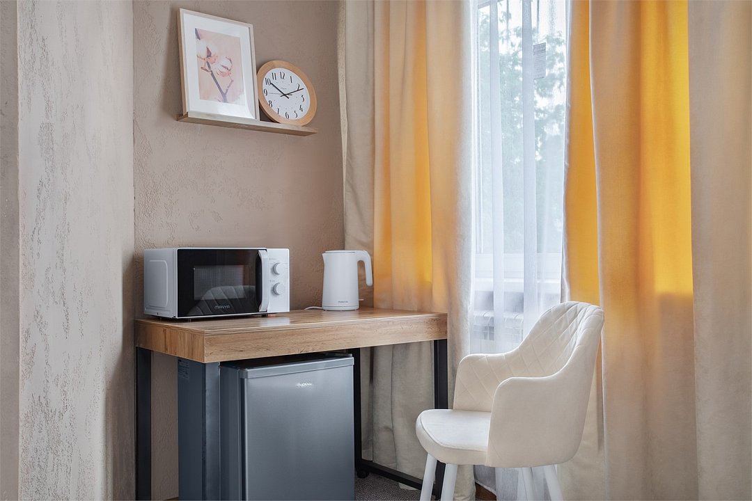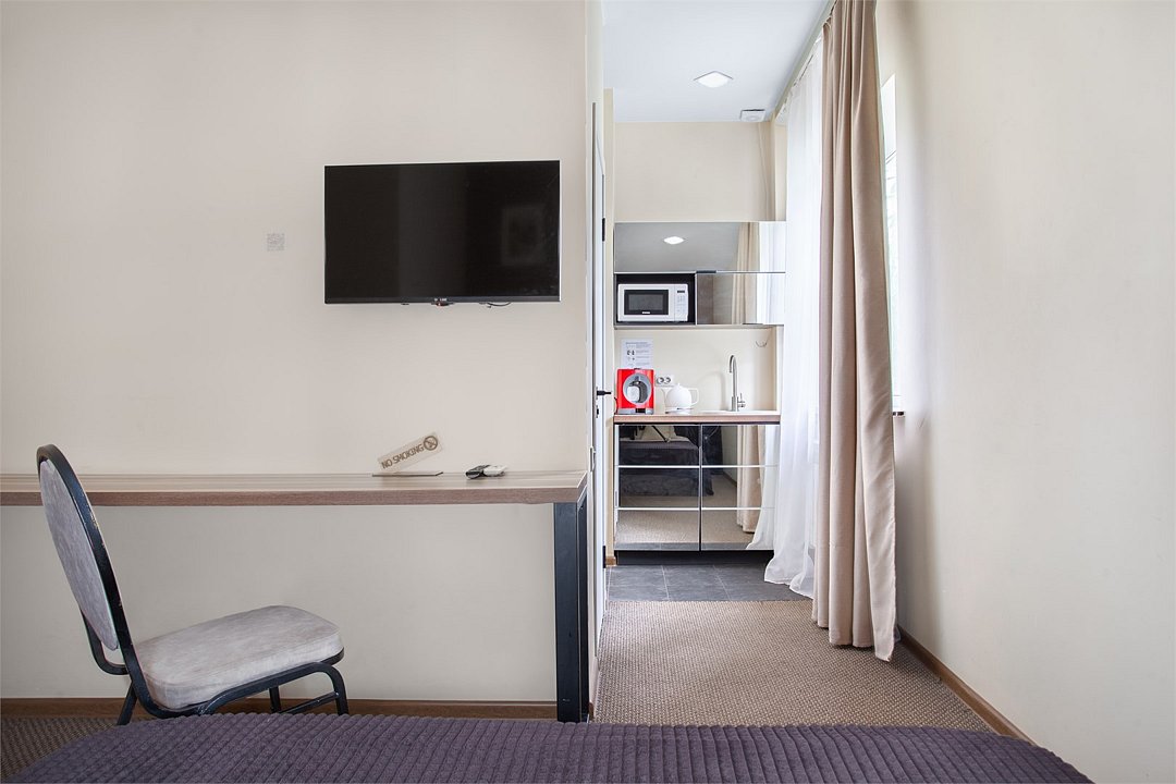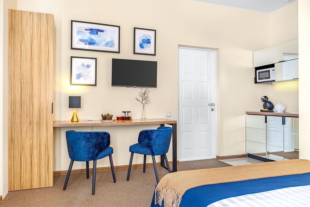 Wi-Fi, интернет, кондиционер, светильник, фен, микроволновая печь, утюг, ванная комната, халаты, банные полотенца, тапочки, гигиенические средства, косметические средства, кровать «King size», тумбы, стулья, журнальный столик, зеркало, мебельный гарнитур, звуконепроницаемые стены и окна, чайный набор, набор посуды, чайник, унитаз, раковина, мягкая мебель, отопление, душ, вид на город, кресло, кухонная посуда, стаканы, кухонная утварь, столовые приборы, кофейный столик, тумба, туалетные средства, туалет, цифровое тв, мини-холодильник, мини-кухня, кухонный уголок, номер для некурящих, пуфик, рабочий столВ номере