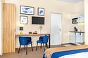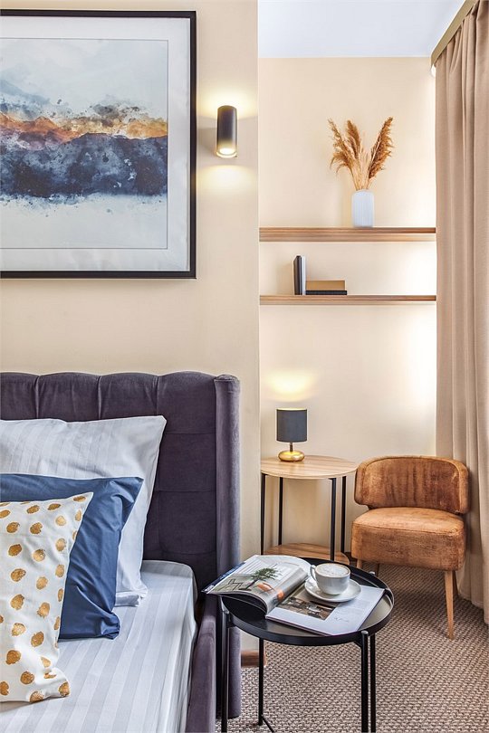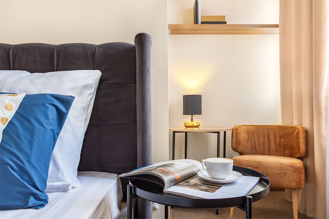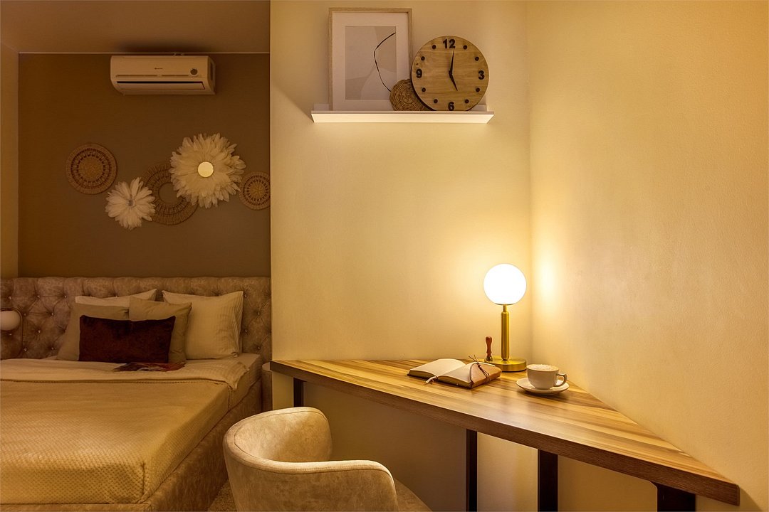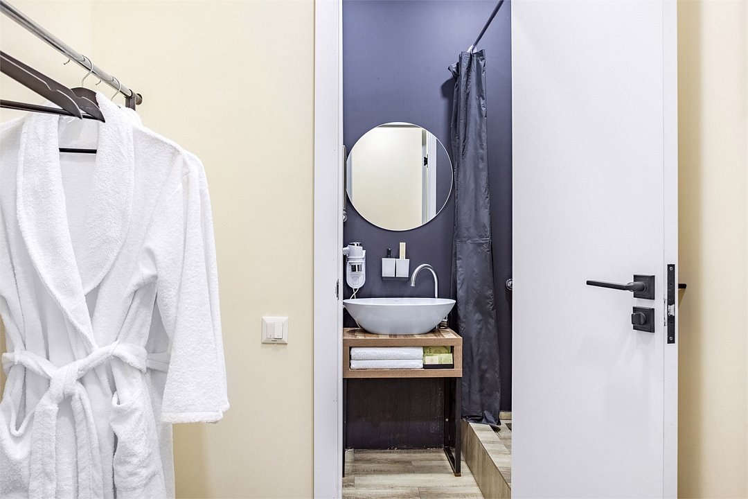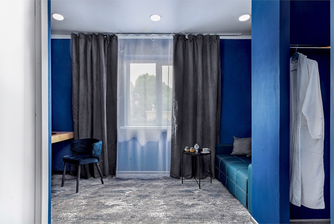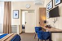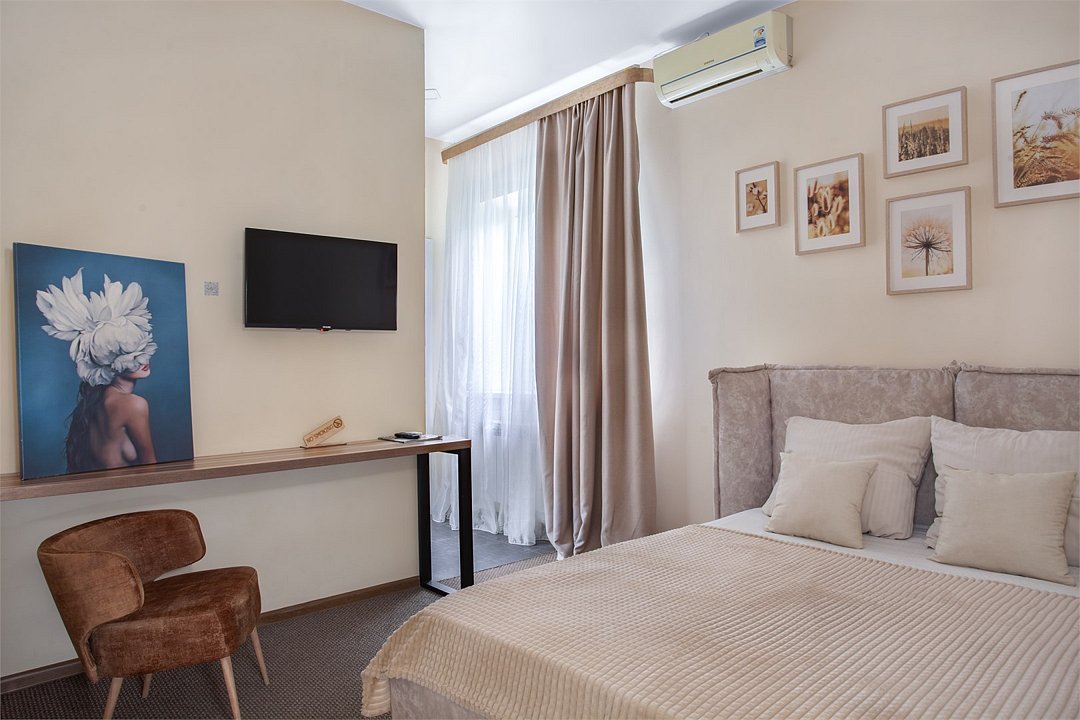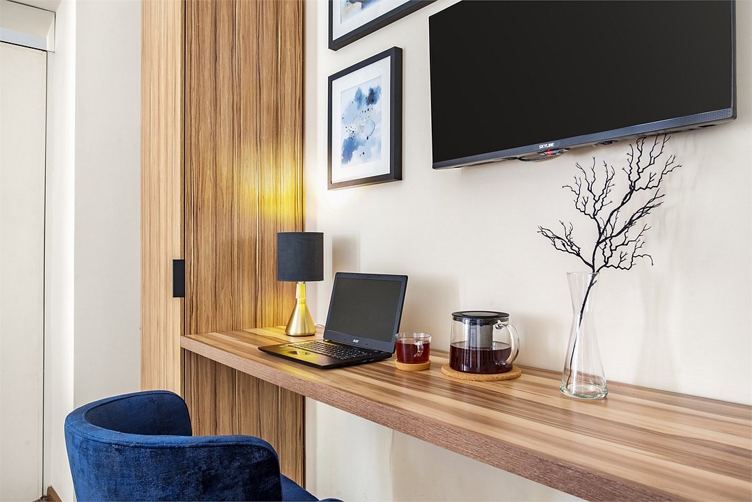 Wi-Fi, интернет, кондиционер, светильник, фен, микроволновая печь, утюг, ванная комната, халаты, банные полотенца, тапочки, гигиенические средства, косметические средства, кровать «King size», тумбы, стулья, журнальный столик, зеркало, мебельный гарнитур, звуконепроницаемые стены и окна, чайный набор, набор посуды, чайник, унитаз, раковина, мягкая мебель, отопление, душ, вид на город, кресло, кухонная посуда, стаканы, кухонная утварь, столовые приборы, кофейный столик, тумба, туалетные средства, туалет, цифровое тв, мини-холодильник, мини-кухня, кухонный уголок, номер для некурящих, пуфик, рабочий столВ номере