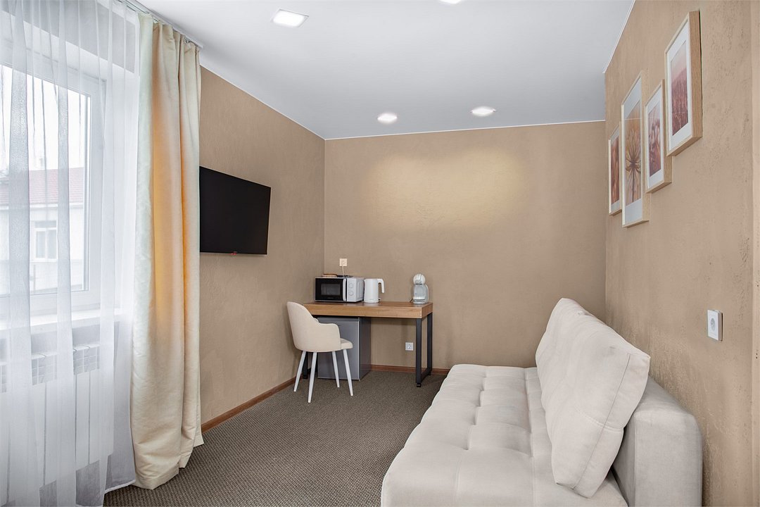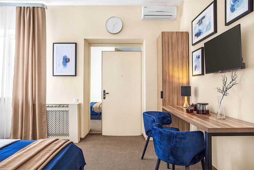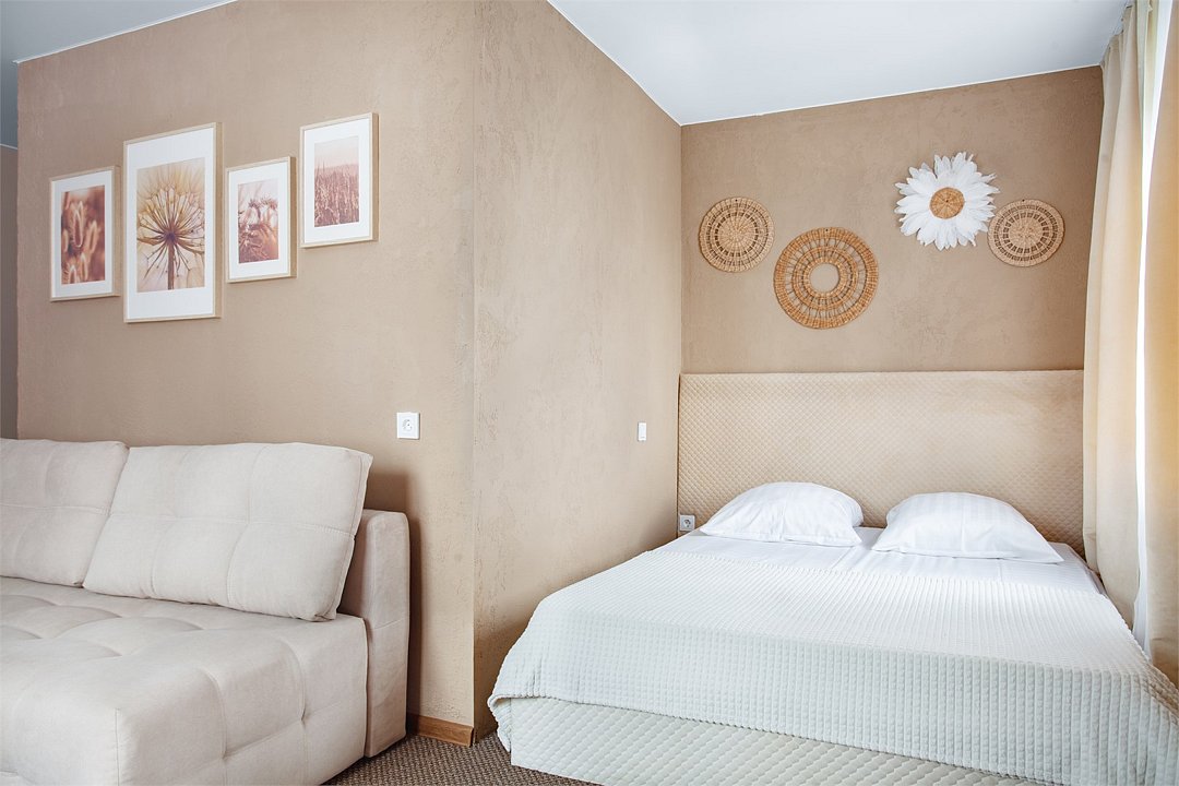 Двухкомнатный номер. В спальне - кровать в размере 160х200 с матрасом на независимом пружинном блоке, в гостиной комфортабельный диван-кровать.Или нужно забронировать сразу несколько номеров? Вы можете оставить письменную заявку и мы поможем составить бронирование на основе Ваших особых пожеланий.