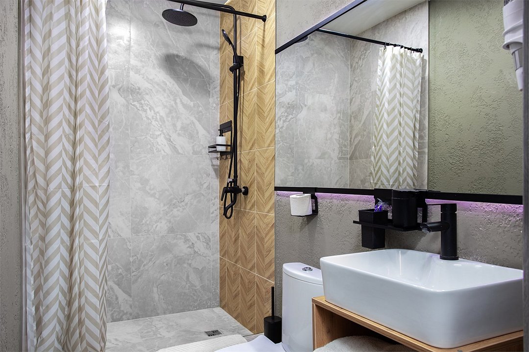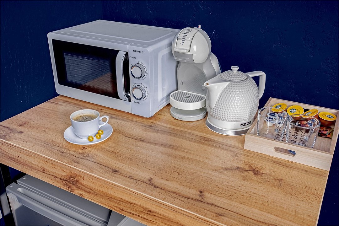 Wi-Fi, интернет, кондиционер, фен, микроволновая печь, утюг, душевая кабина, халаты, банные полотенца, тапочки, гигиенические средства, косметические средства, кровать «King size», гладильная доска, диван, шкаф для одежды, вешалки, зеркало, чайный набор, набор посуды, чайник, унитаз, раковина, мягкая мебель, питьевая вода, обеденная зона, ковровое покрытие, отопление, душ, кресло, вид во двор, кухонная посуда, стаканы, кухонная утварь, столовые приборы, стул, туалетные средства, туалет, цифровое тв, диван-кровать, мини-холодильник, кухонный уголок, телевизор со Smart TV, номер для некурящих, рабочий столВ номере